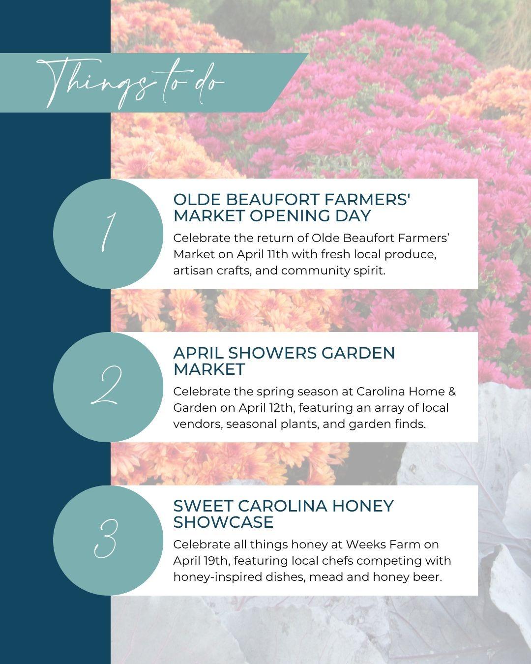 1. Olde Beaufort Farmers' Market - Celebrate the return of Olde Beaufort Farmers’ Market on April 11th with fresh local produce, artisan crafts, and community spirit.