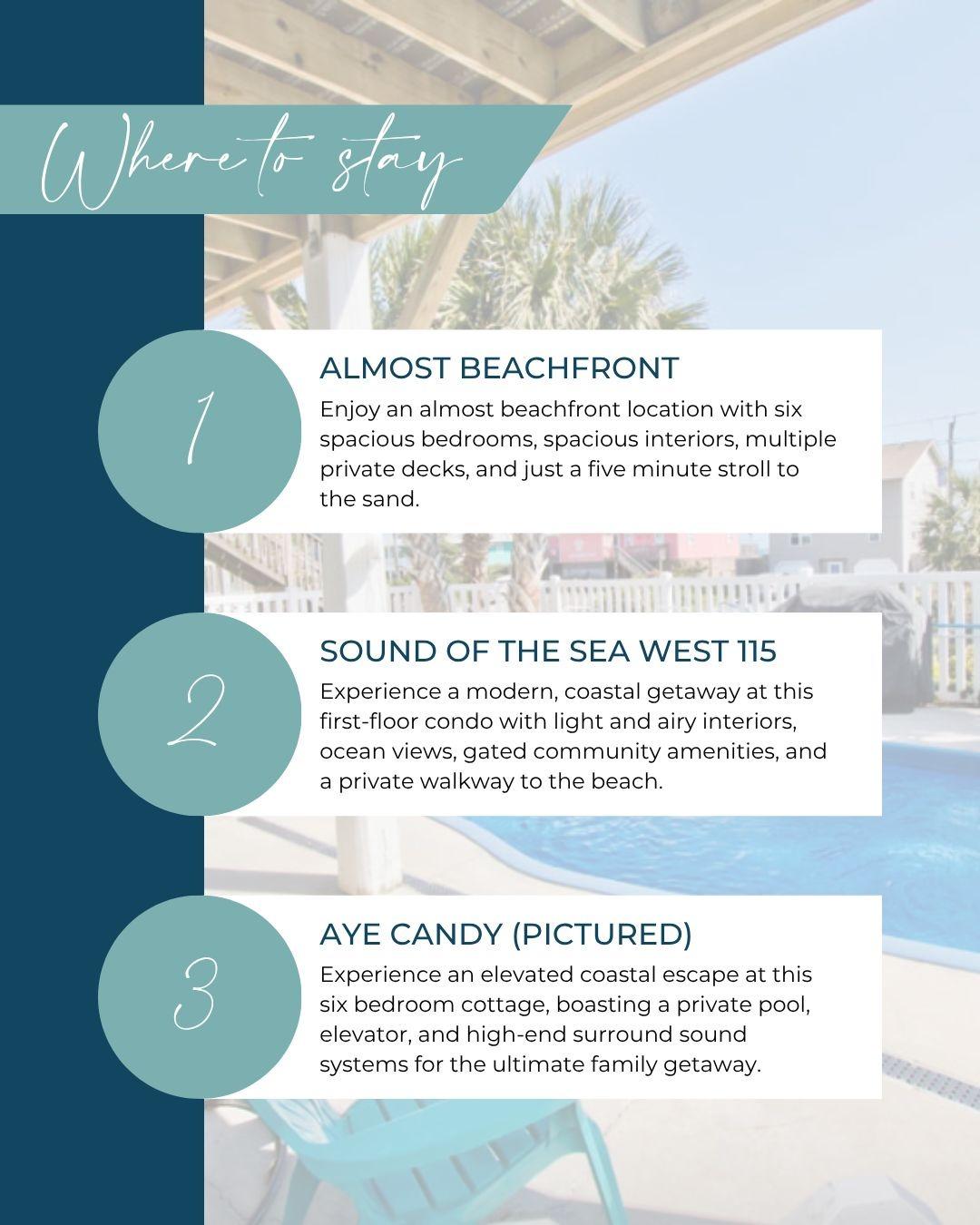 3. Aye Candy (Pictured) - Experience an elevated coastal escape at this six bedroom cottage, boasting a private pool, elevator, and high-end surround sound systems for the ultimate family getaway.