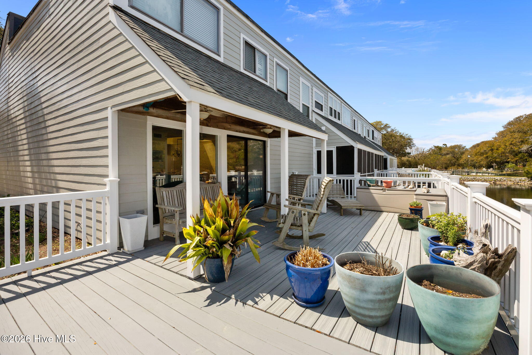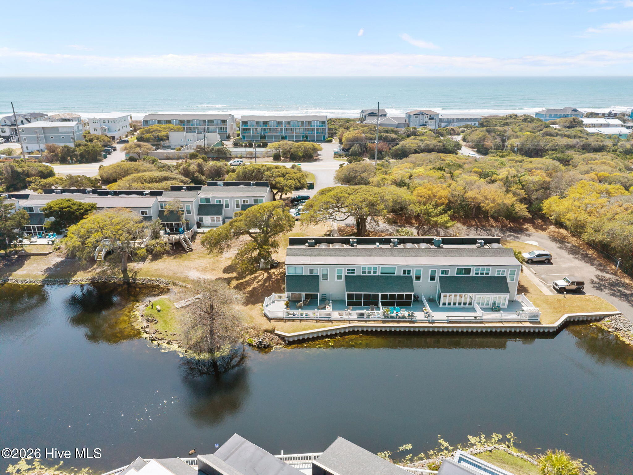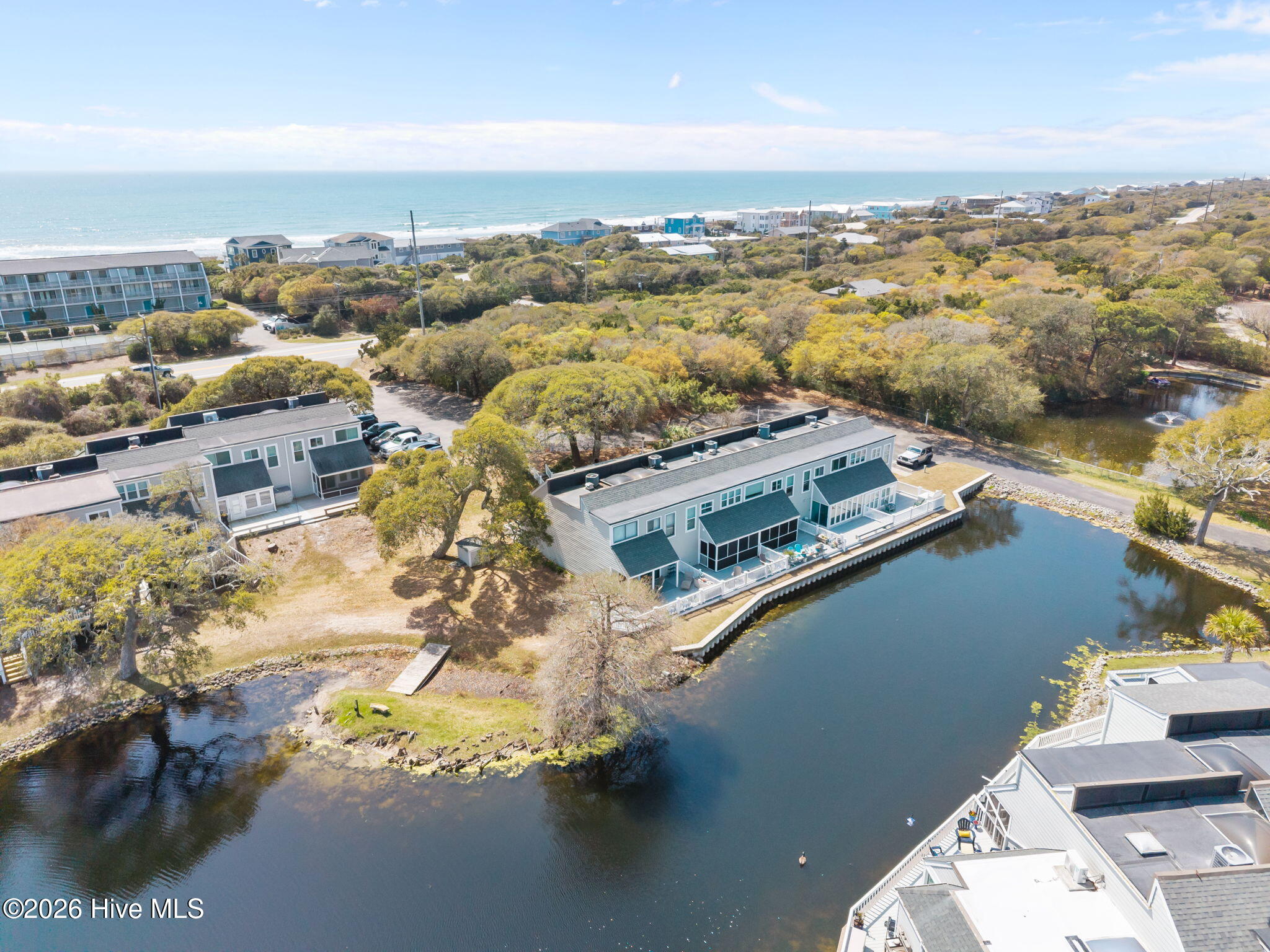 Inside, you'll find 2 spacious bedrooms, 2.5 baths, sleek tile floors throughout, and an abundance of natural light. The open-concept kitchen and living spaces flow seamlessly out to an extra-large deck overlooking a peaceful pond. It's the perfect spot for entertaining friends or enjoying a quiet morning coffee. Out front, a private patio provides even more outdoor living space to soak in the coastal breeze.