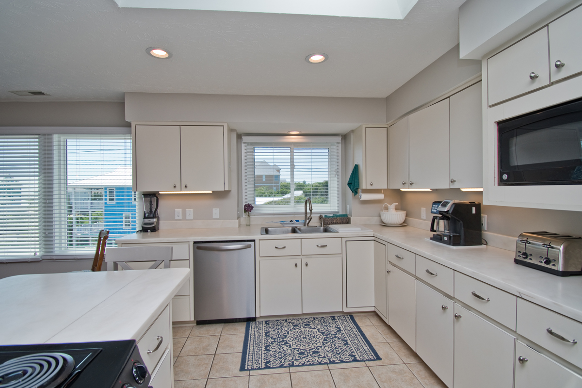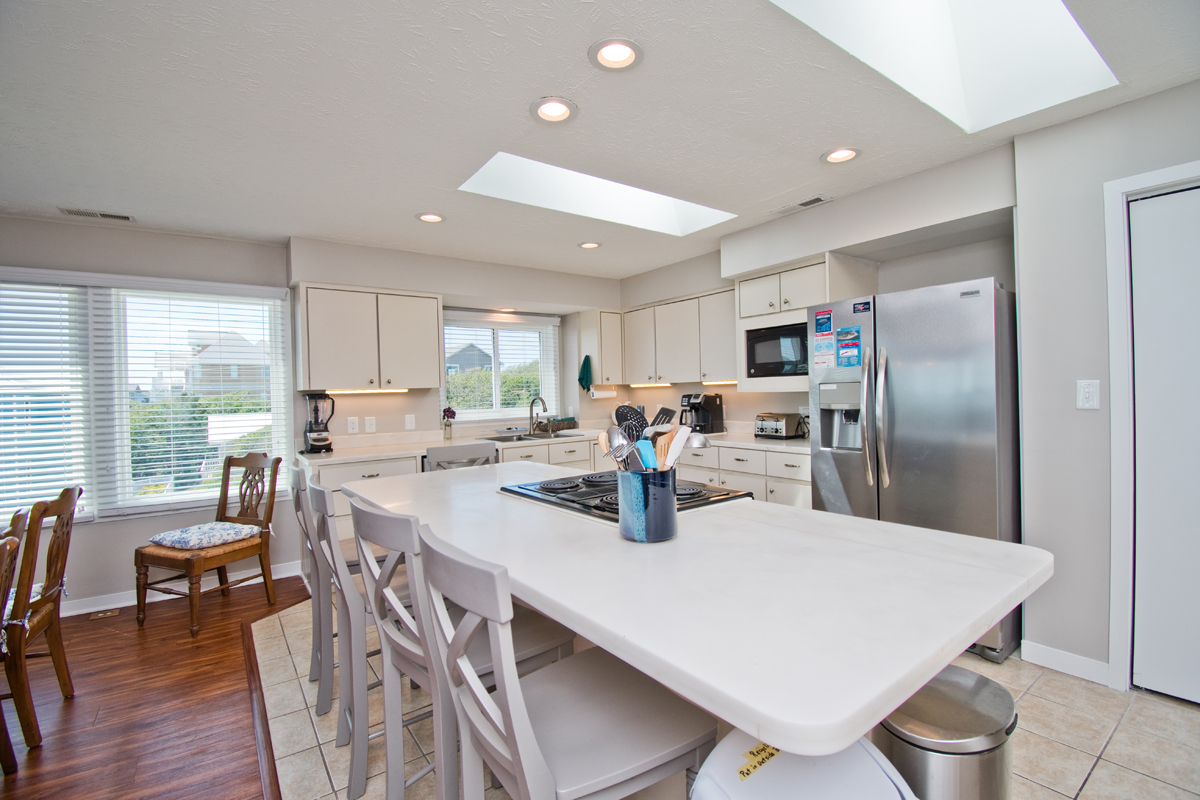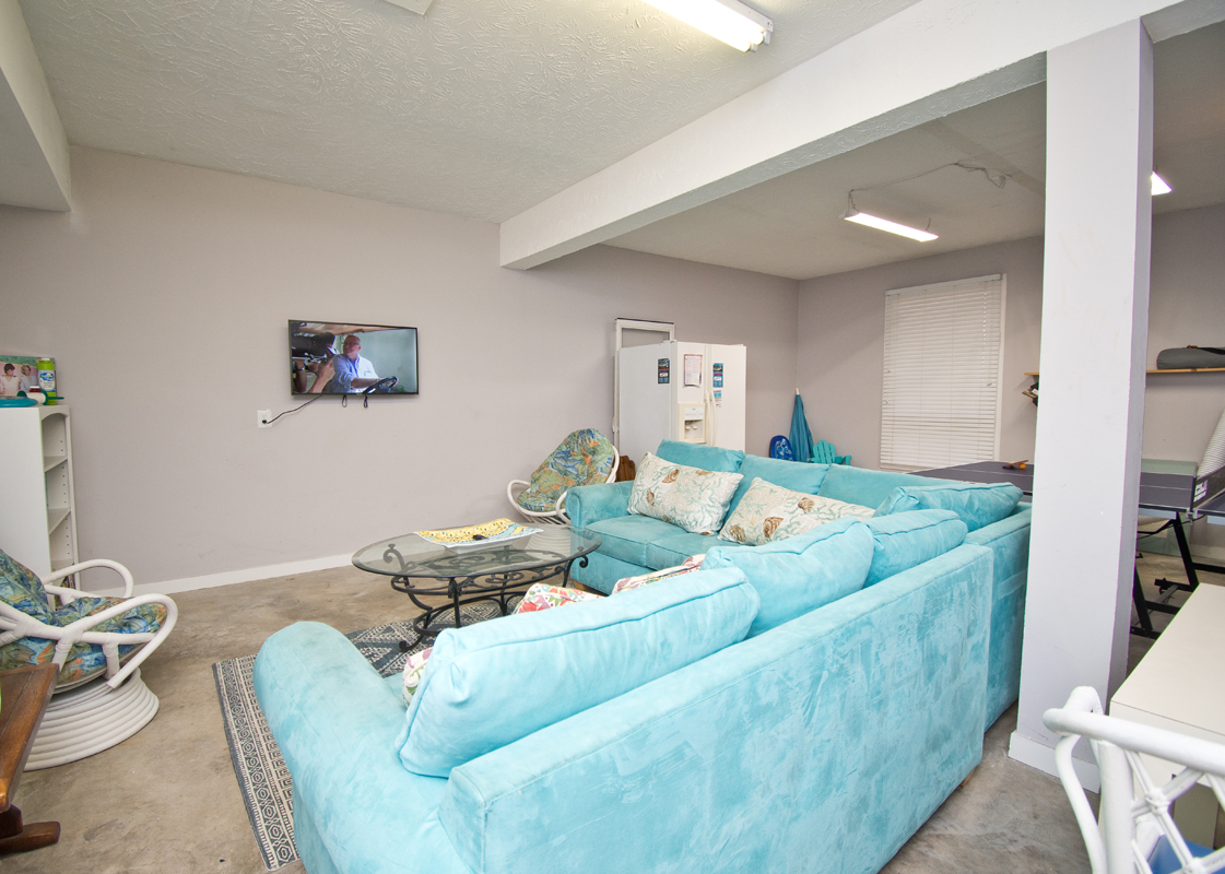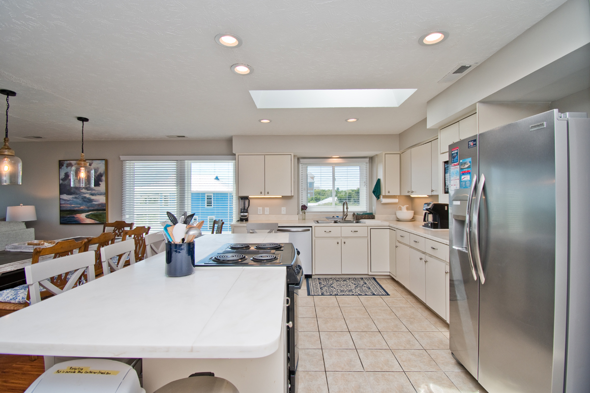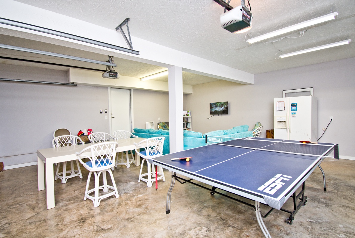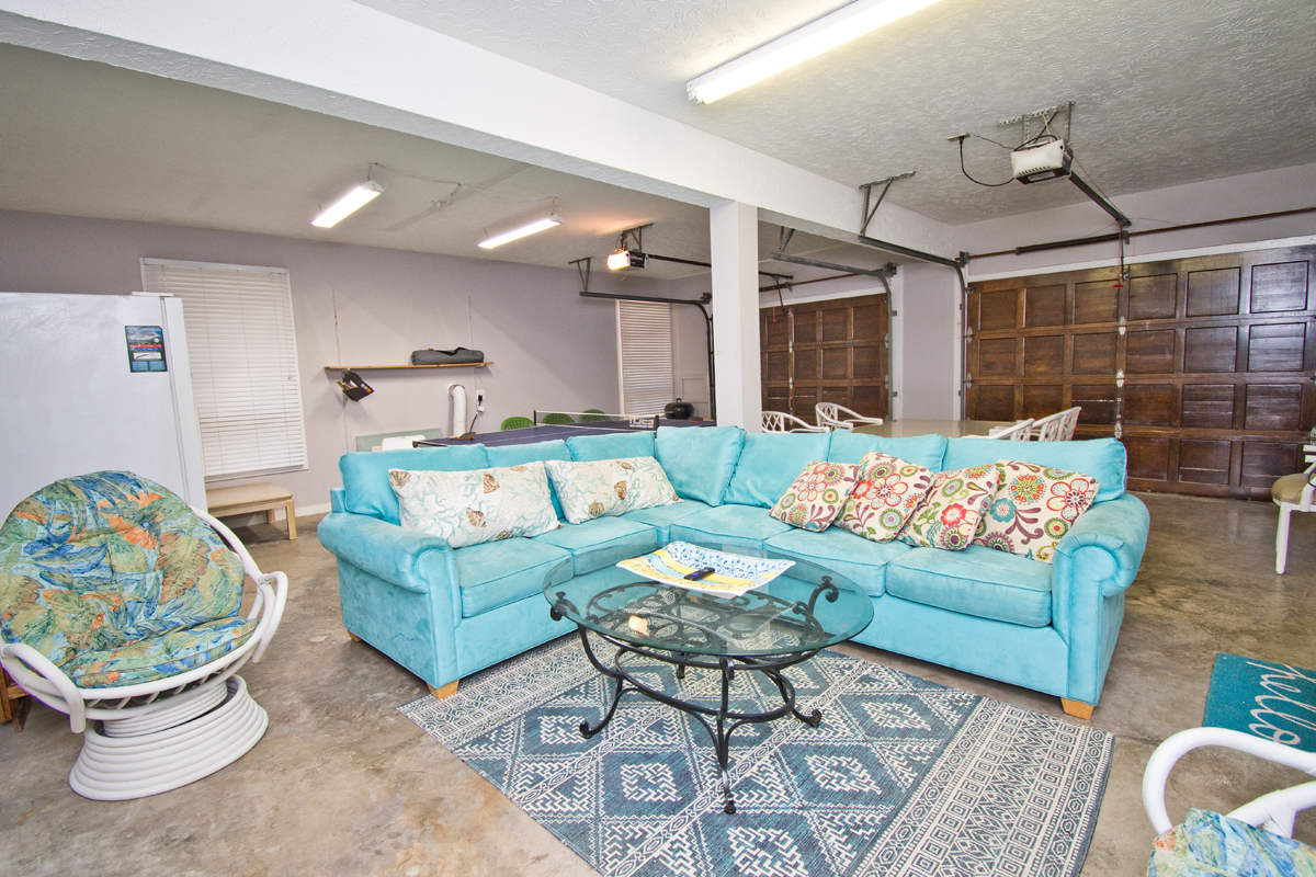 Inside, the fun continues on the upper level with a fully stocked kitchen (hello, crab boil night!) with stainless steel appliances, a Keurig & drip coffee maker, and plenty of space to gather around the island or dining table. Kick back in the living room with a 55” TV loaded with Roku, or head down to the rec room in the garage – a chilled-out hangout with A/C, a second fridge, comfy sectional, books, a ping pong table, and even a card table for game night.