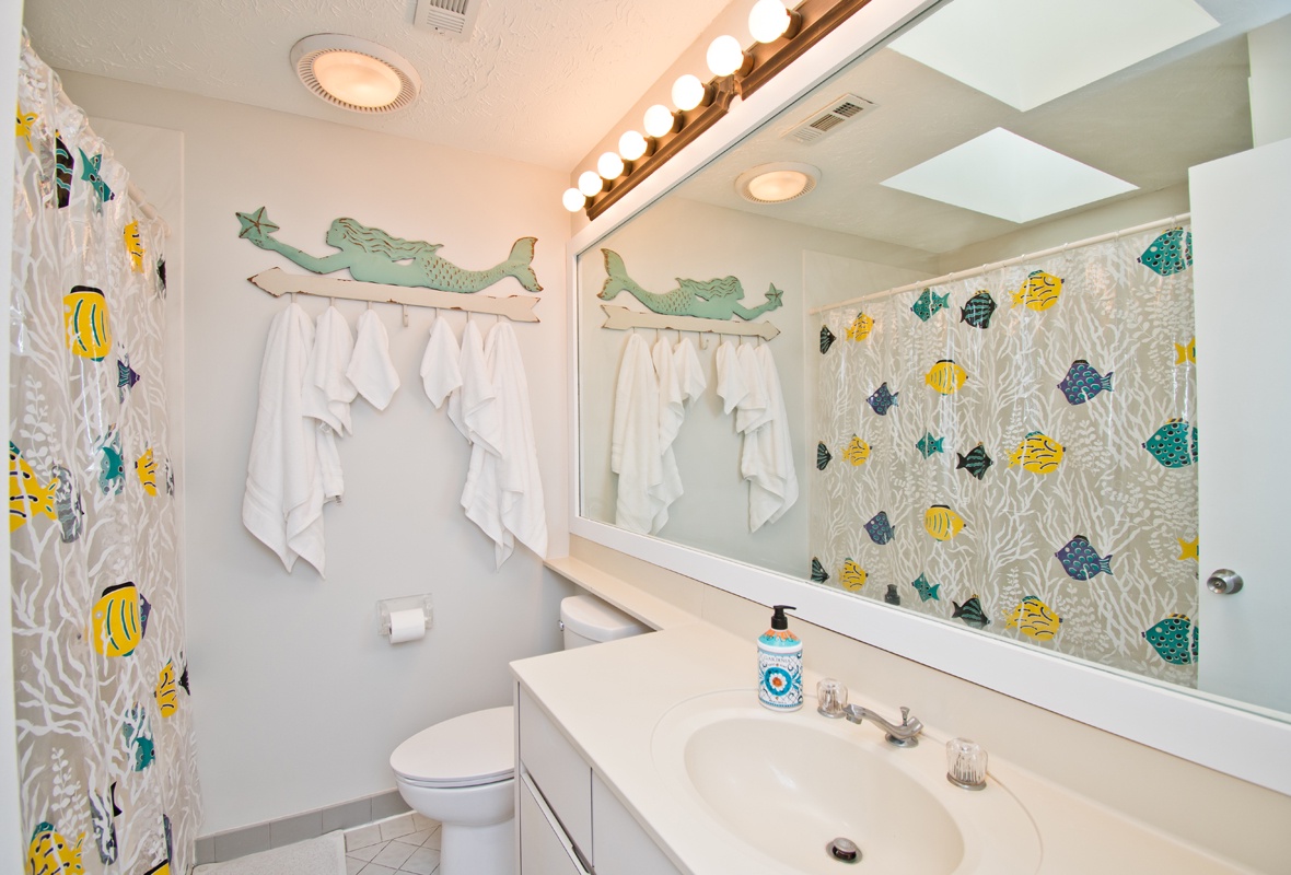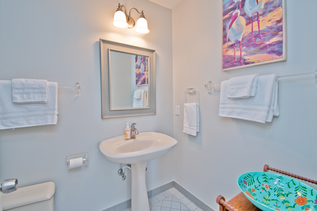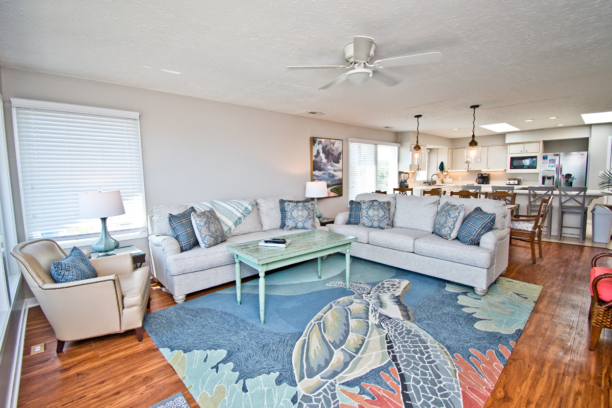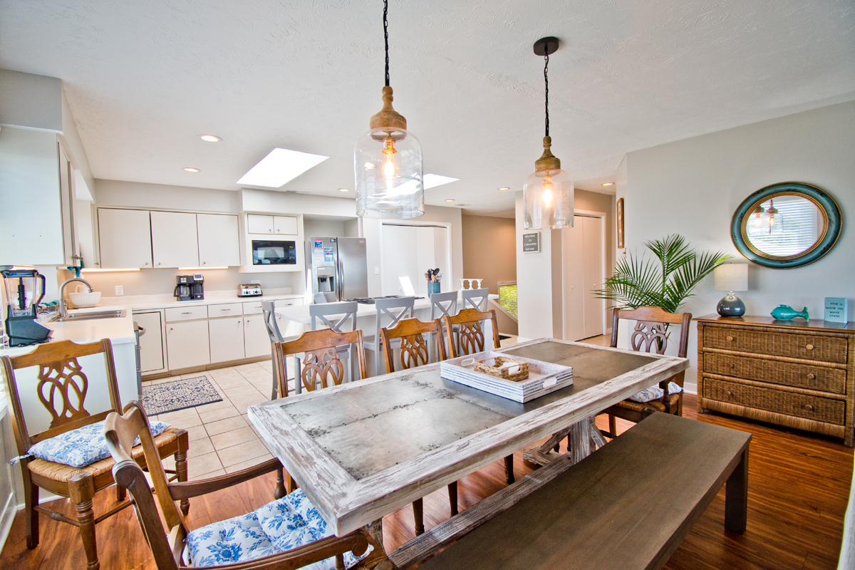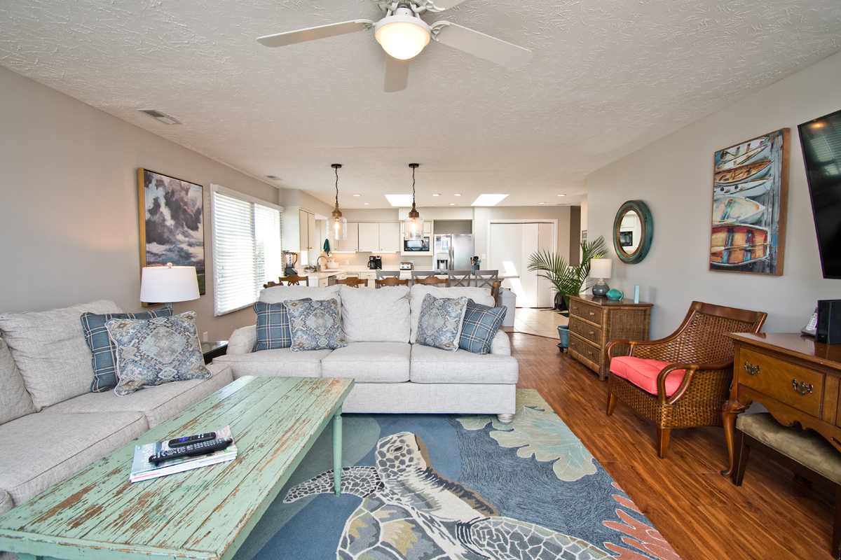 Inside, the fun continues on the upper level with a fully stocked kitchen (hello, crab boil night!) with stainless steel appliances, a Keurig & drip coffee maker, and plenty of space to gather around the island or dining table. Kick back in the living room with a 55” TV loaded with Roku, or head down to the rec room in the garage – a chilled-out hangout with A/C, a second fridge, comfy sectional, books, a ping pong table, and even a card table for game night.