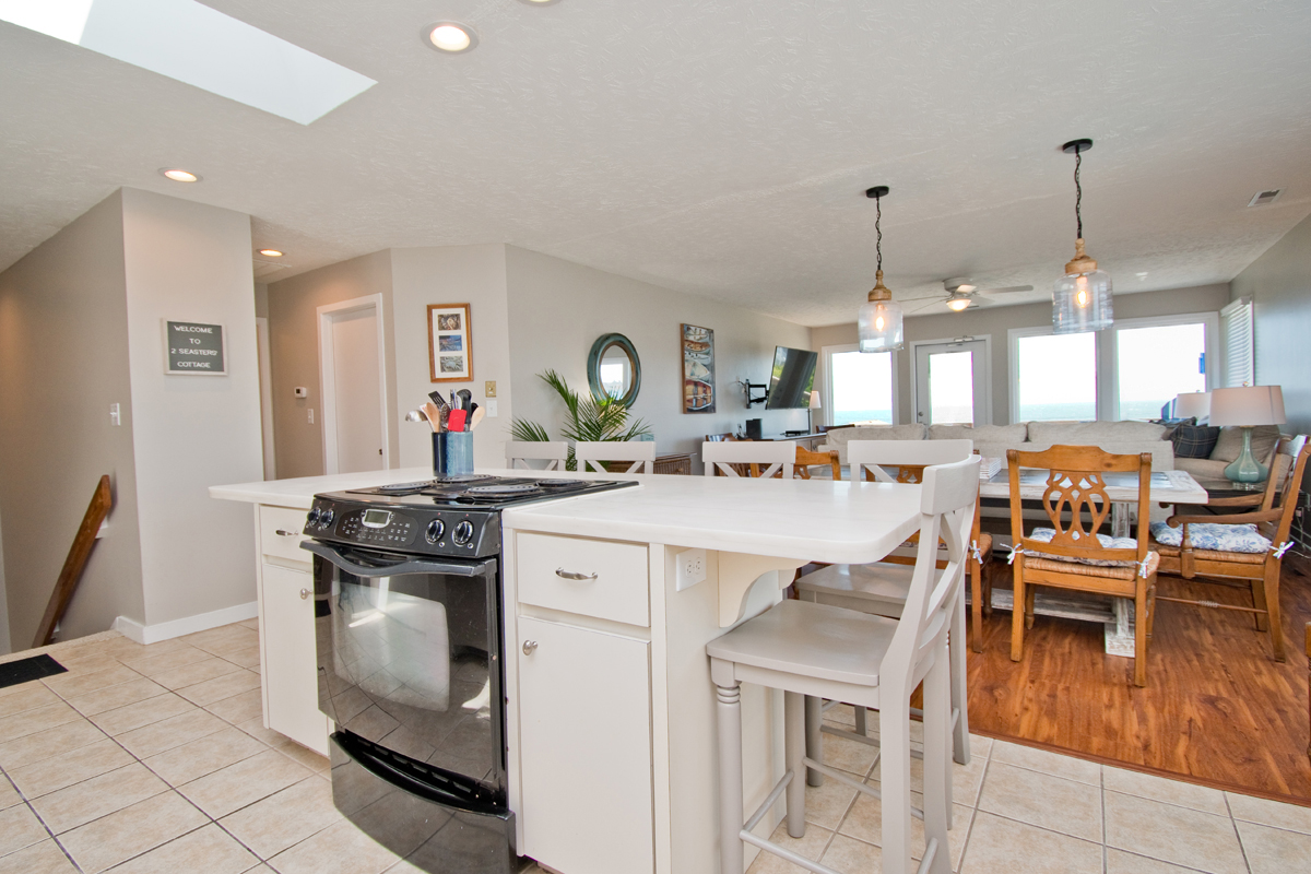 Sleeping arrangements are comfy and flexible, with two King Primary Suites (one on each level), another King bedroom, and a bunk room that’s perfect for the kids, that are both on the middle level. The ground level has a large laundry room and extra parking for up to 5 cars. Whether you’re lounging on the deck, cooking up a seafood feast, or making memories in the rec room, 2 Seasters’ Cottage is the perfect spot for a fun-filled family escape.