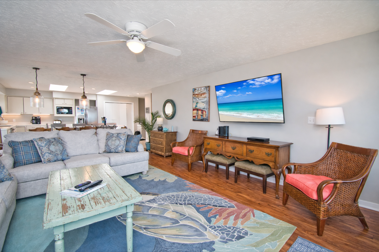 The upper level is where everyone naturally gathers. Whip up your favorite coastal feasts in the fully stocked kitchen - complete with stainless steel appliances, a Keurig and drip coffee maker, and plenty of space to spread out around the island or dining table (crab boil night, anyone?). After dinner, kick back in the living room with the 55” Roku TV or head downstairs to the ultimate bonus space.
