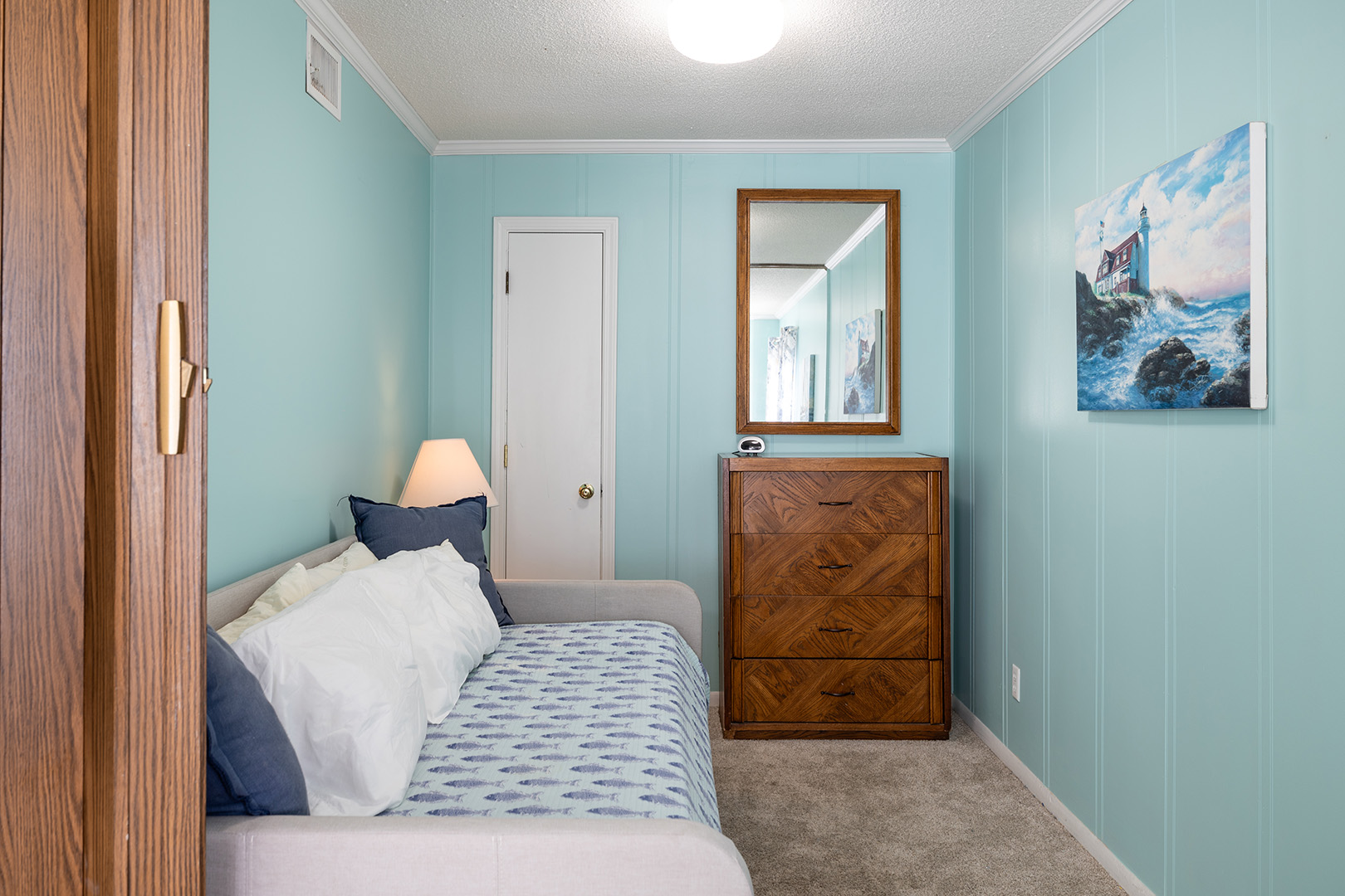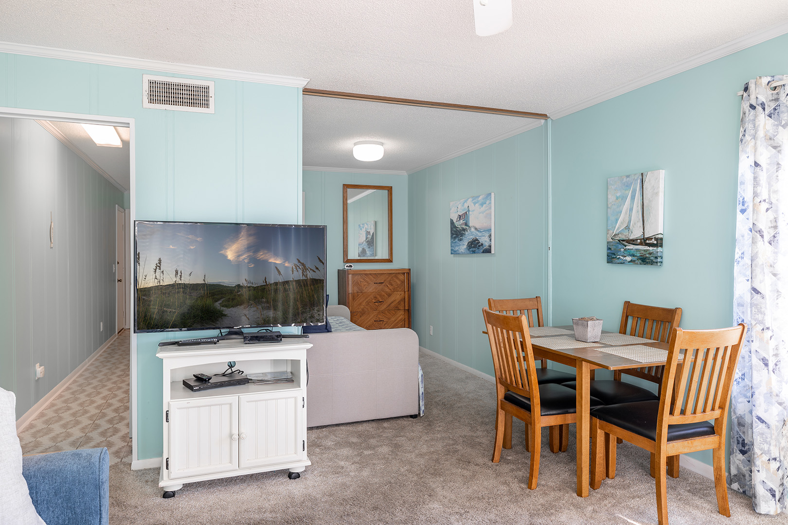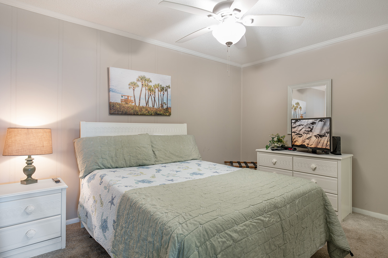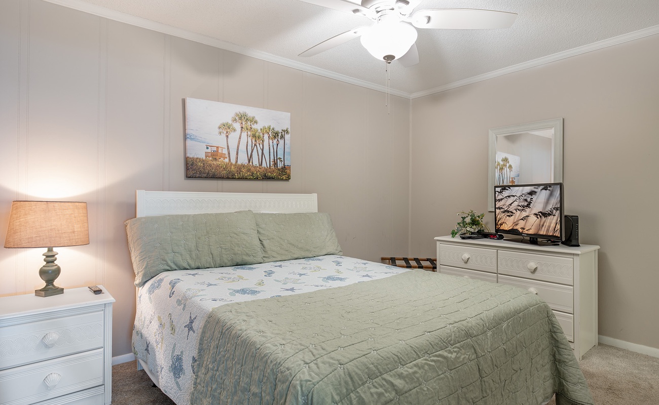 Beds: Bedroom with Queen Bed, Living area with Double Sleeper Sofa + Twin Trundle.