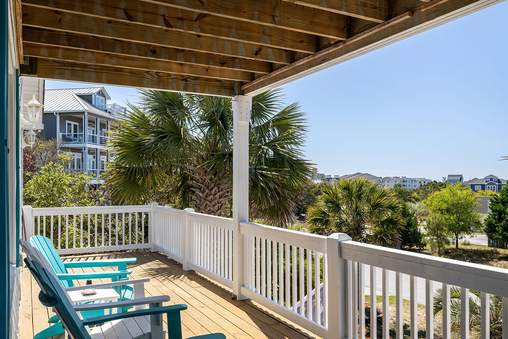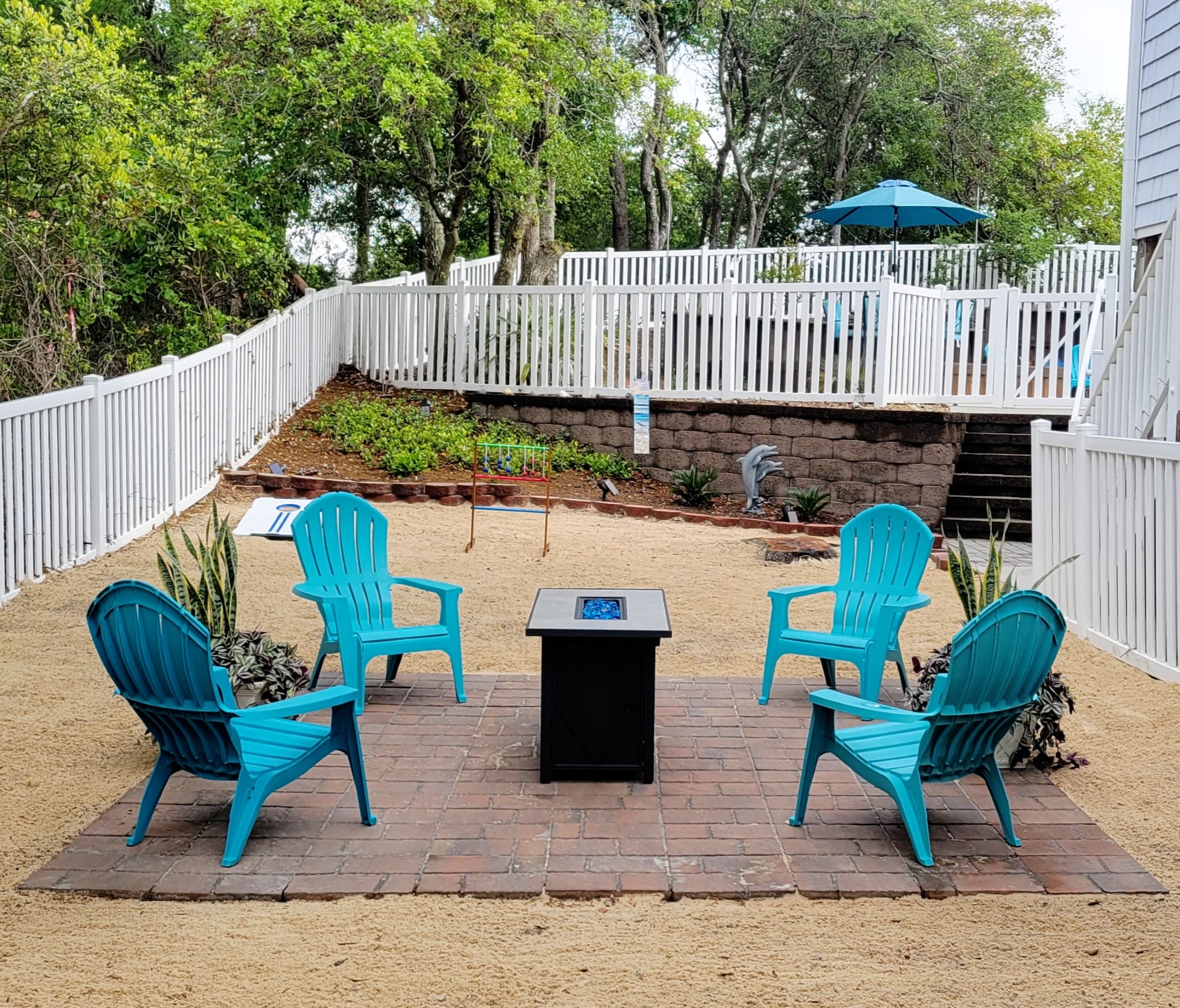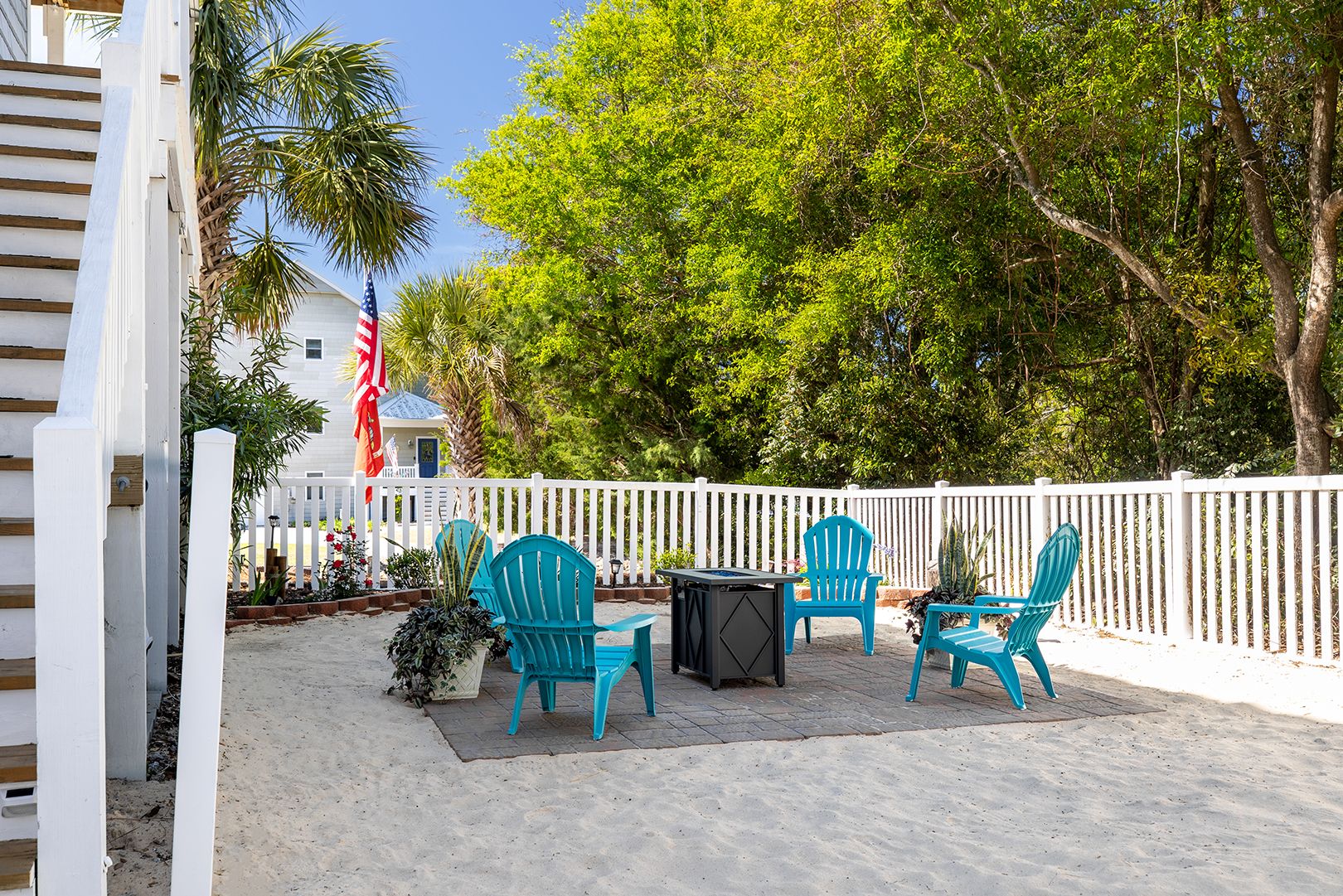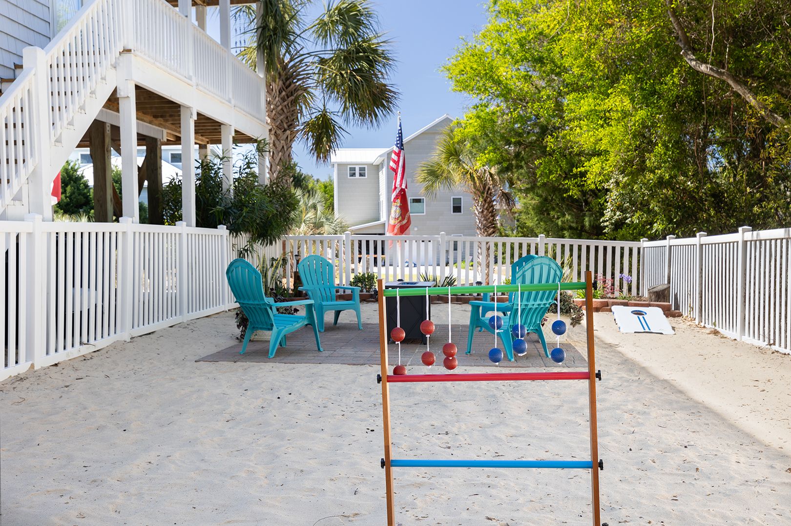 Step out on the spacious walk-around lower covered deck area complete with furniture including Adirondack chairs to enjoy the beautiful palm trees, ocean breeze and sunny seaside locale. Enjoy the side yard patio, Adirondack chairs, Propane Fire Pit table, and Yard games including Corn Hole, Yard Yahtzee, and Ladder Golf provided.