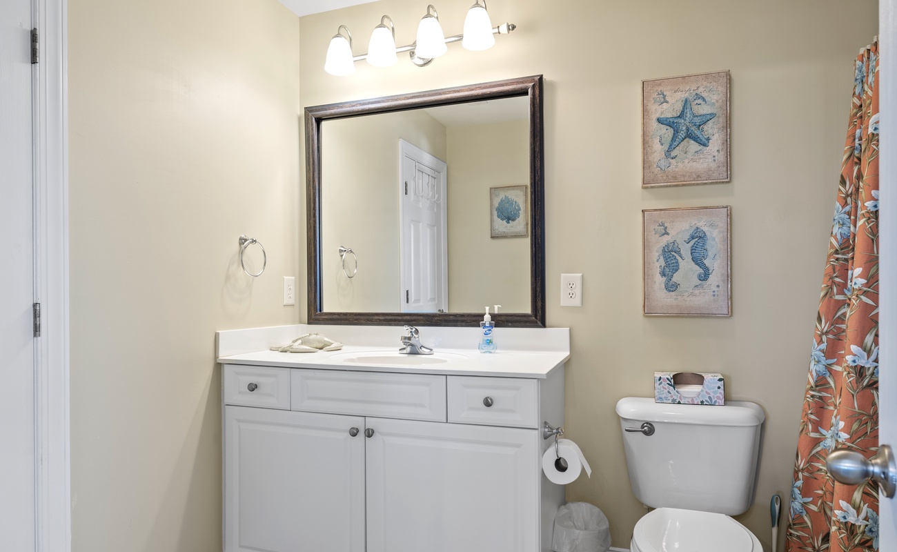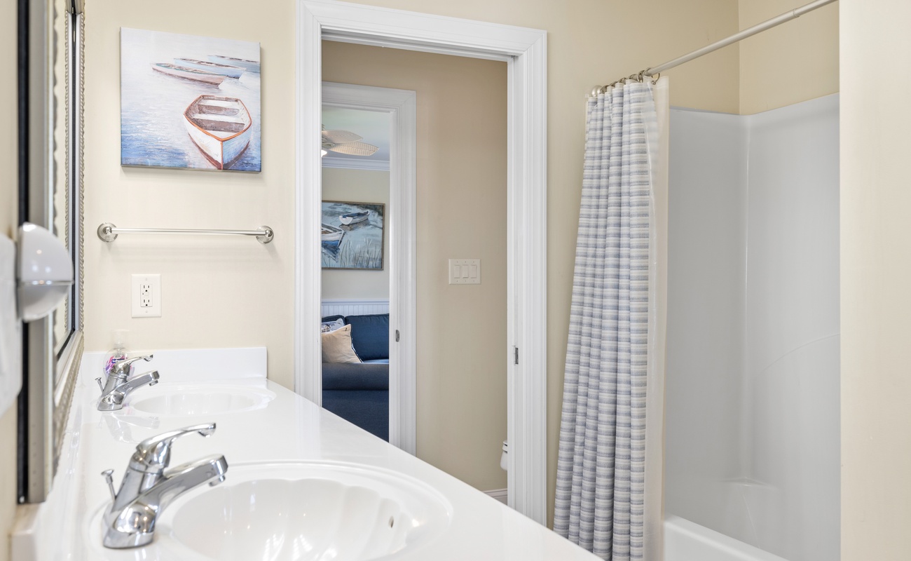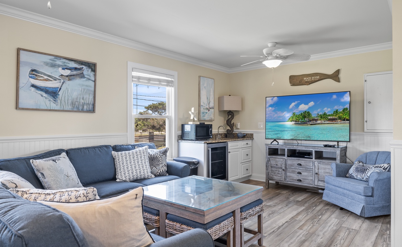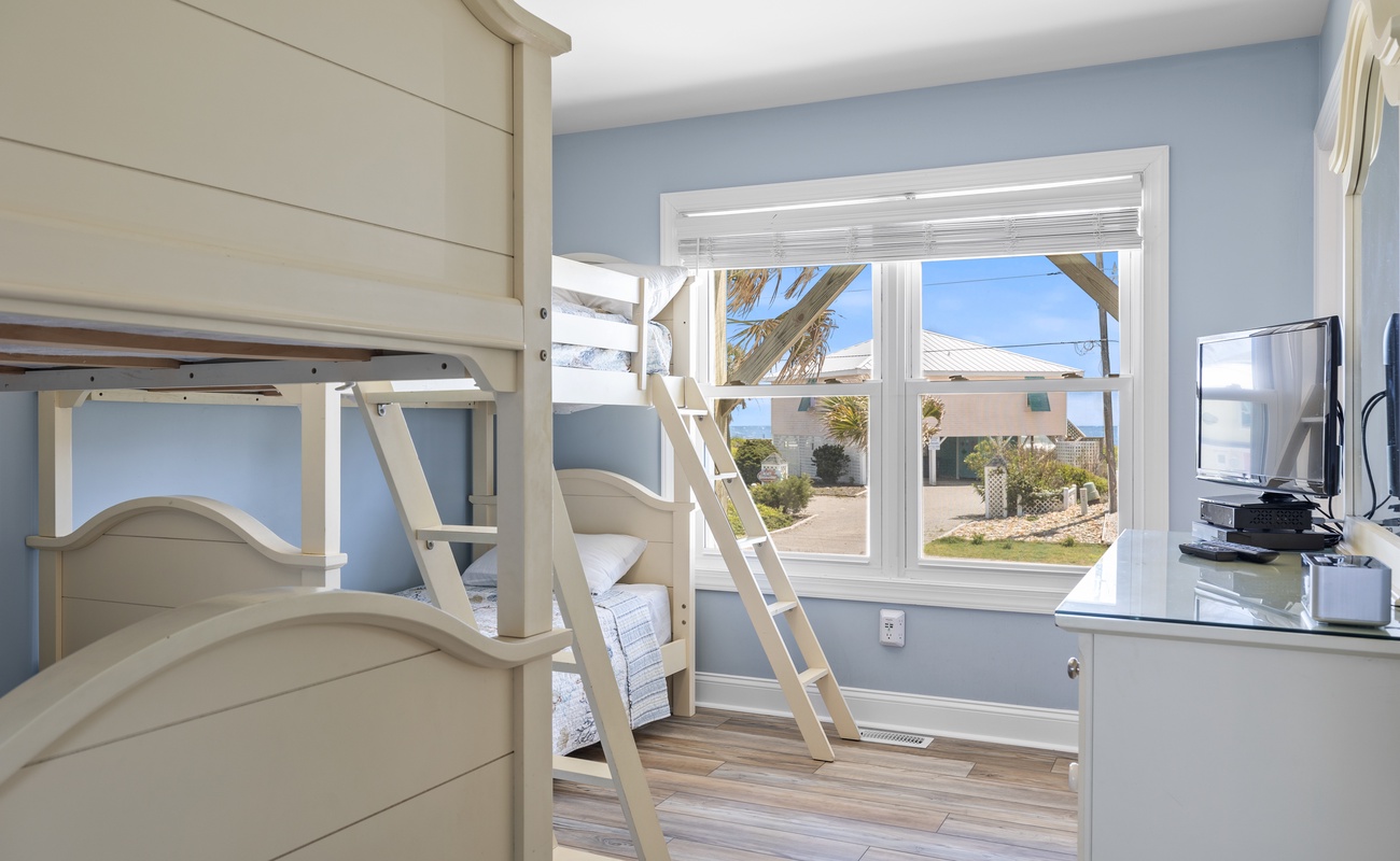 Level One: The First Level features the Game Room/Theater Room with a new large Sectional Sofa, a Samsung 65" 4K UHD Smart LED with HDR home theater TV, and a High Definition Cable box to complete the Home Theater experience. There are also plenty of games like Karaoke, board games, puzzles, and more. The game room also includes a Mini-Kitchen area! High-Speed Wireless Internet access is available throughout the house. Bedroom #1 is Oceanside with Ocean Views, has a Queen Bed, dresser, flat screen 32" LED 720p HDTV with a Blu-Ray player, and has doors leading to the Game room and also to the large full bathroom with double sinks. Bedroom #2 is also Oceanside with Ocean Views, has Two Sets of Twin Bunk Beds, dresser, flat screen LCD TV with a Blu-Ray player, and has separate doors leading to the Game room and to the large bathroom.