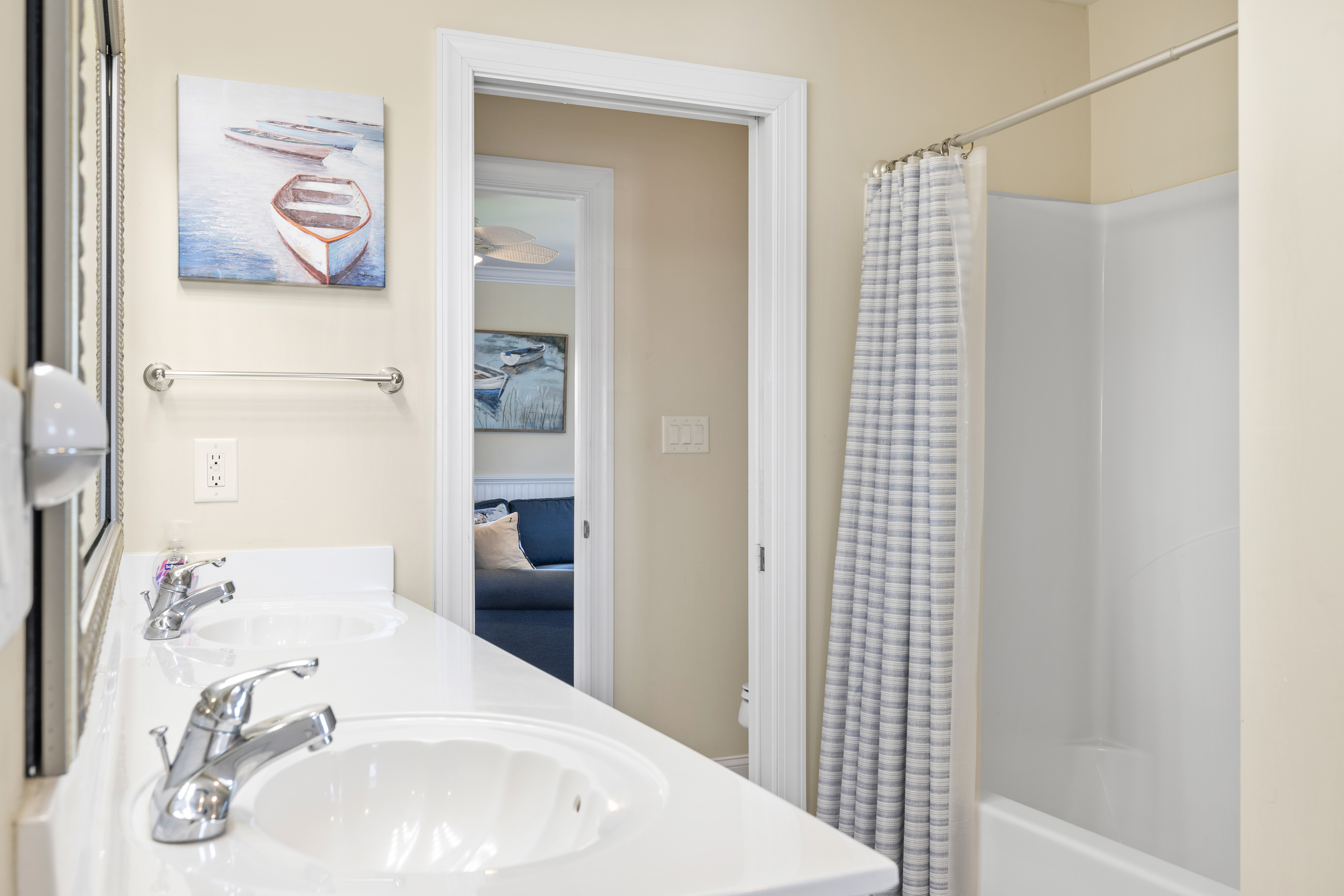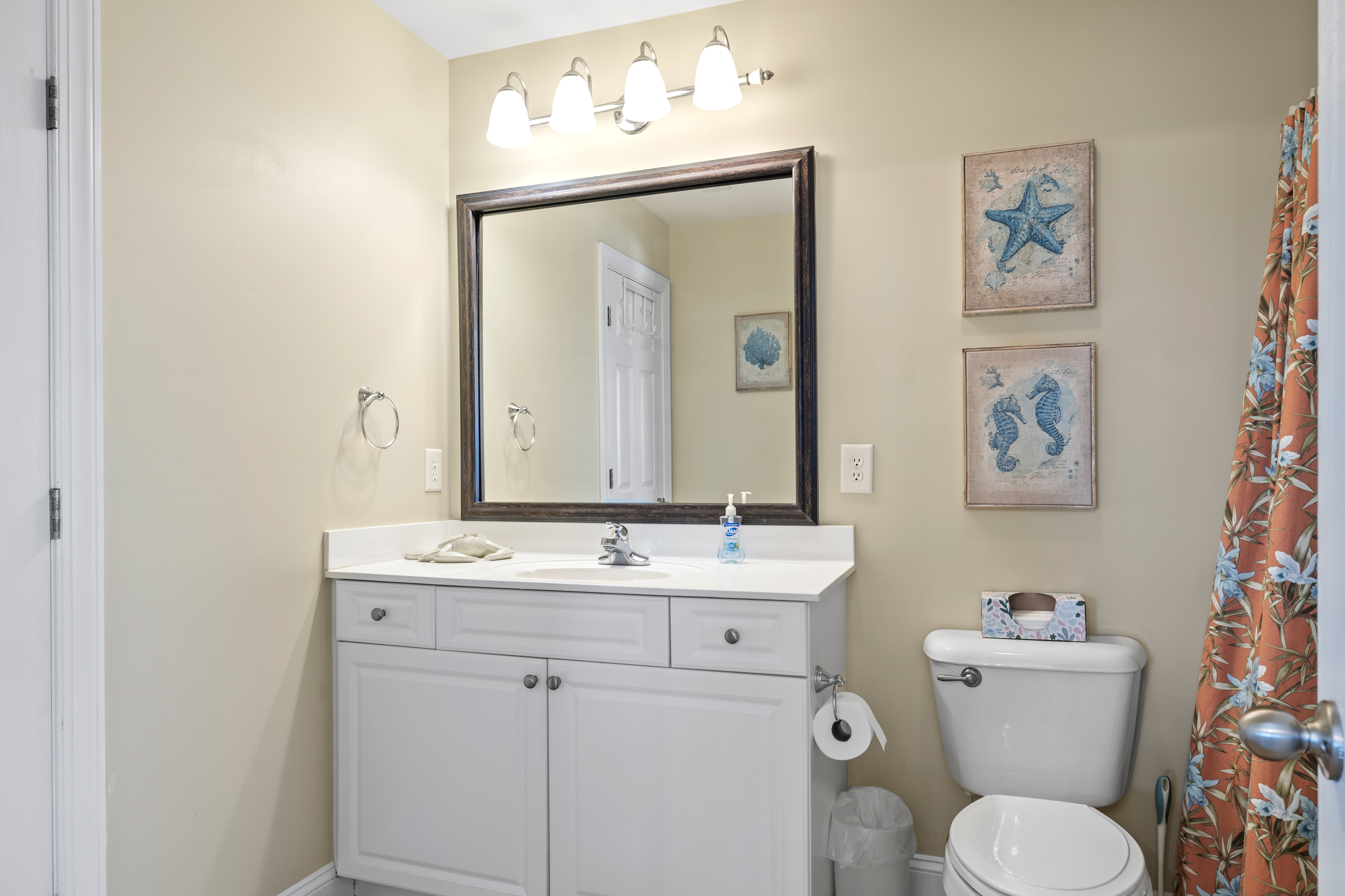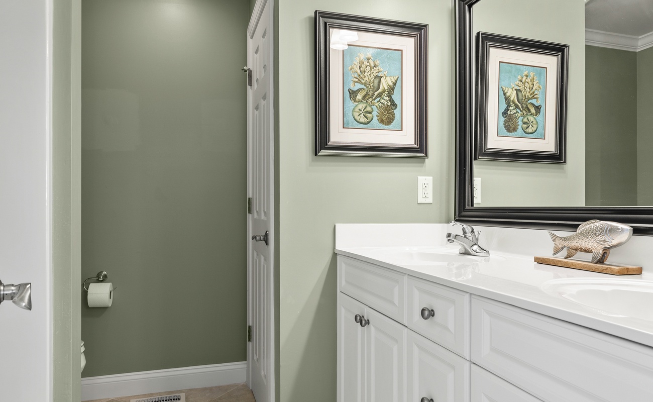 Level One: The First Level features the Game Room/Theater Room with a new large Sectional Sofa, a Samsung 65" 4K UHD Smart LED with HDR home theater TV, and a High Definition Cable box to complete the Home Theater experience. There are also plenty of games like Karaoke, board games, puzzles, and more. The game room also includes a Mini-Kitchen area! High-Speed Wireless Internet access is available throughout the house. Bedroom #1 is Oceanside with Ocean Views, has a Queen Bed, dresser, flat screen 32" LED 720p HDTV with a Blu-Ray player, and has doors leading to the Game room and also to the large full bathroom with double sinks. Bedroom #2 is also Oceanside with Ocean Views, has Two Sets of Twin Bunk Beds, dresser, flat screen LCD TV with a Blu-Ray player, and has separate doors leading to the Game room and to the large bathroom.