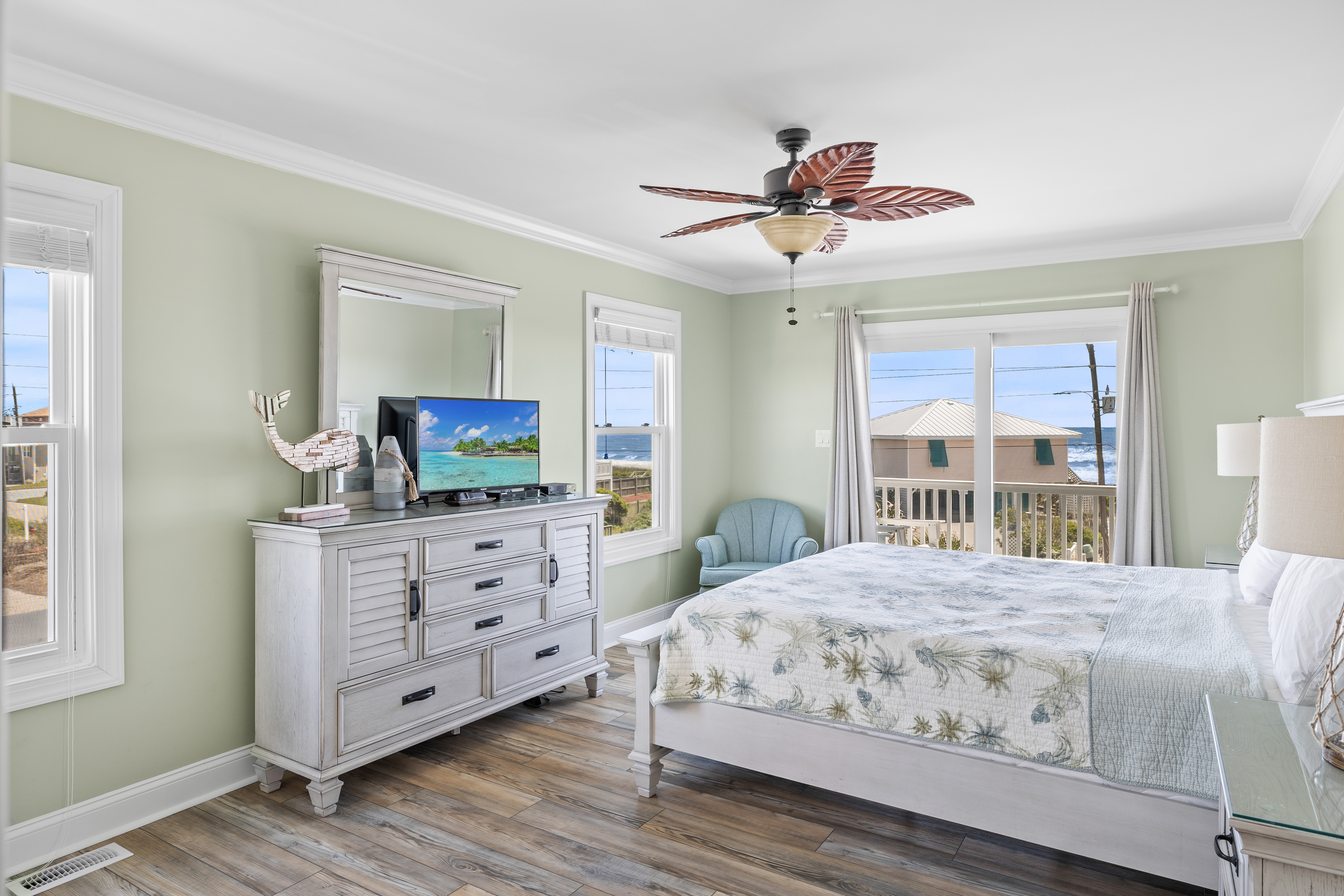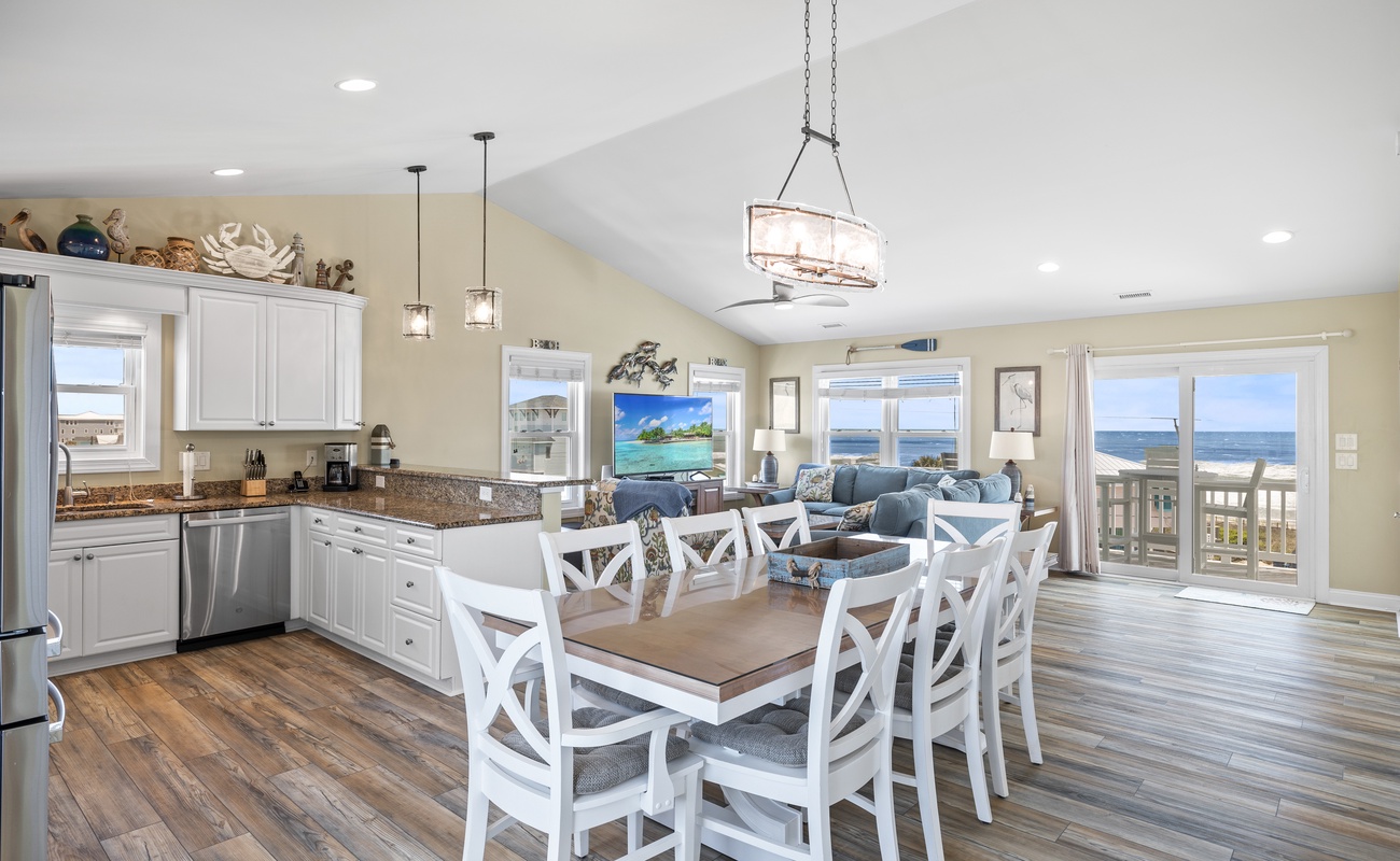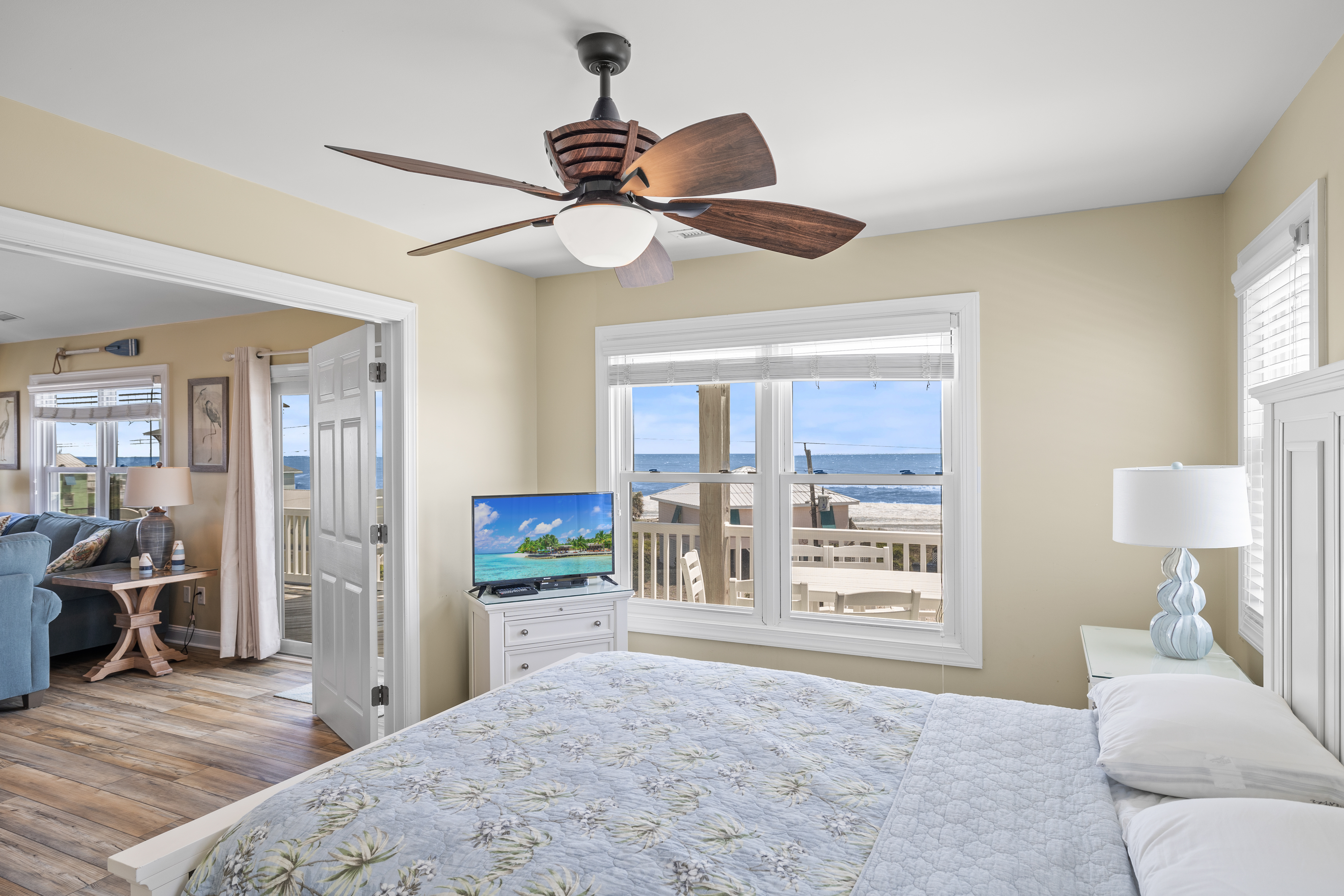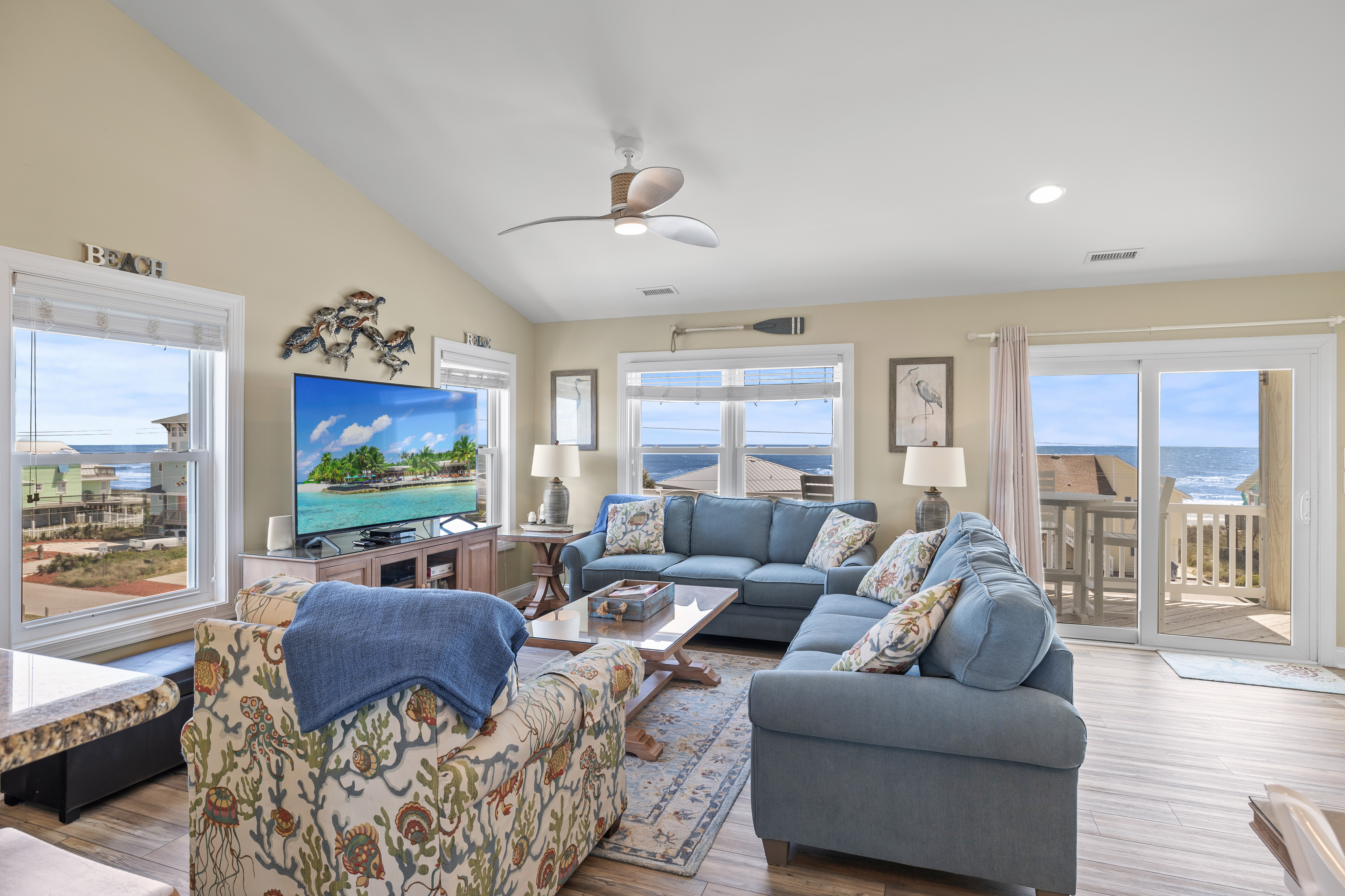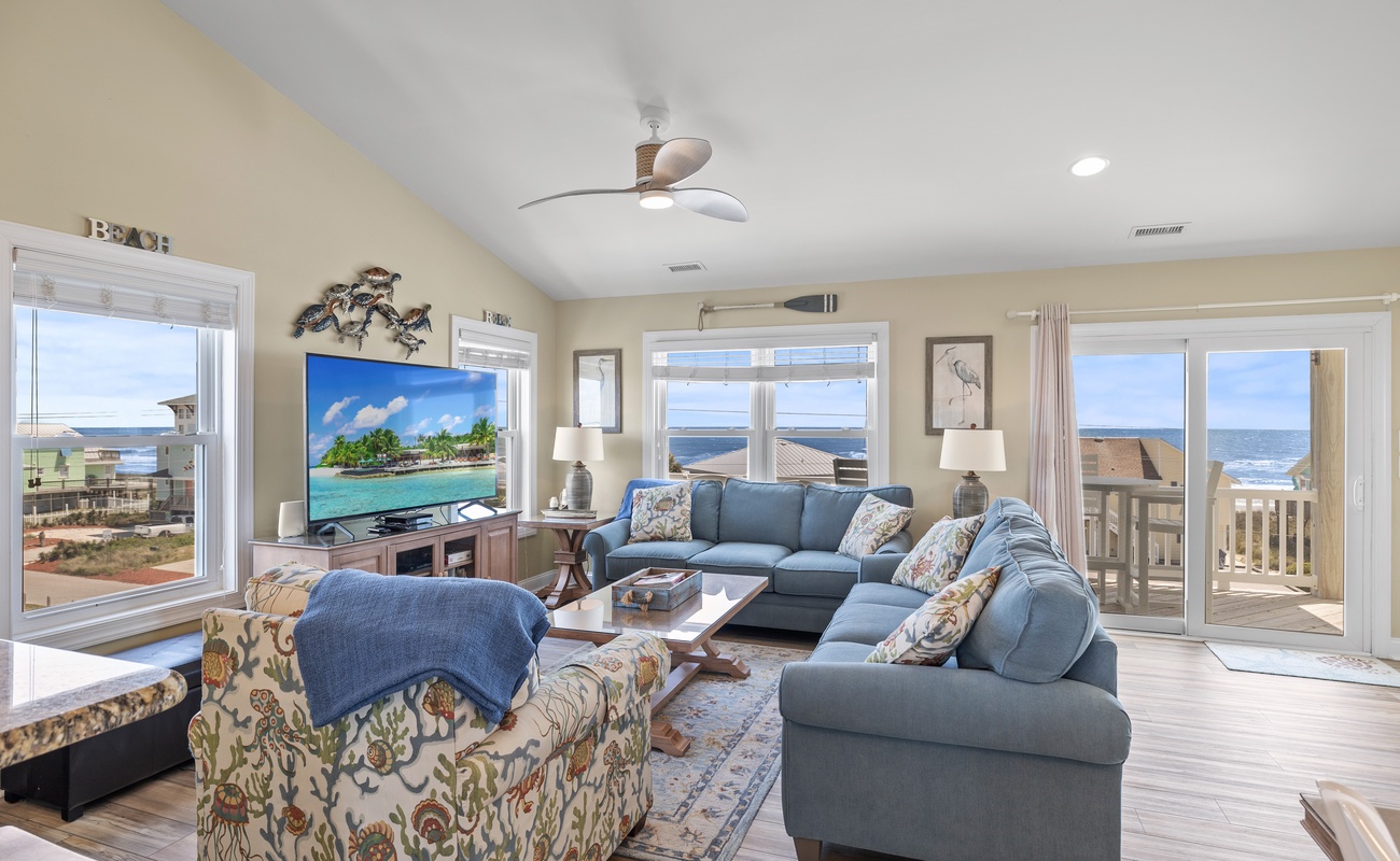 Level Three: Wow! There are Great Ocean and Sound views from every angle from this top level, making you feel like you are on top of the world! The Great Room has a Vaulted Ceiling, LVP and elegant Hardwood floors. The Living Room provides Ocean Views from every window, is delightfully furnished and decorated and is perfect for playing games, enjoying a movie or visiting with family. The Living Room has a Samsung 65" 4K UHD Smart LED with HDR TV, Blu-Ray player, and a High Definition Cable box so you won¡t miss any of your favorite shows! The Dining Room features a beautiful tropical dining table, and provides views of the Ocean and the Sound while dining. The Gourmet Kitchen has granite countertops, stainless steel appliances, and is loaded with top quality kitchenware and appliances. The breakfast bar adjoining the kitchen has seating for four. The Oceanview and Soundview Deck/Porch, which is accessed from the living room, runs across the enter front and side of the house. On the Oceanview Deck/Porch you will find two comfortable Polywood rocking chairs with a small table to relax and enjoy the ocean breeze, the Polywood bistro set with four captain chairs provides a great conversation area for taking in the ocean view or sipping that tropical beverage, or you can share a meal at the Polywood La Casa Cafe dining set which seats six. Bedroom #5 is a Oceanside Bedroom with Ocean Views, has a Queen size bed and French doors that open into the Great Room Area. This bedroom offers a large chest of drawers, two side tables for storage and a flat screen 32" LED 720p HDTV with Blu-Ray Player. The full bathroom on this level that has separate entrances to both the Great Room and to bedroom #5. The bathroom door to the great room can be locked to make Bedroom #5 a Master Bedroom with private bathroom.