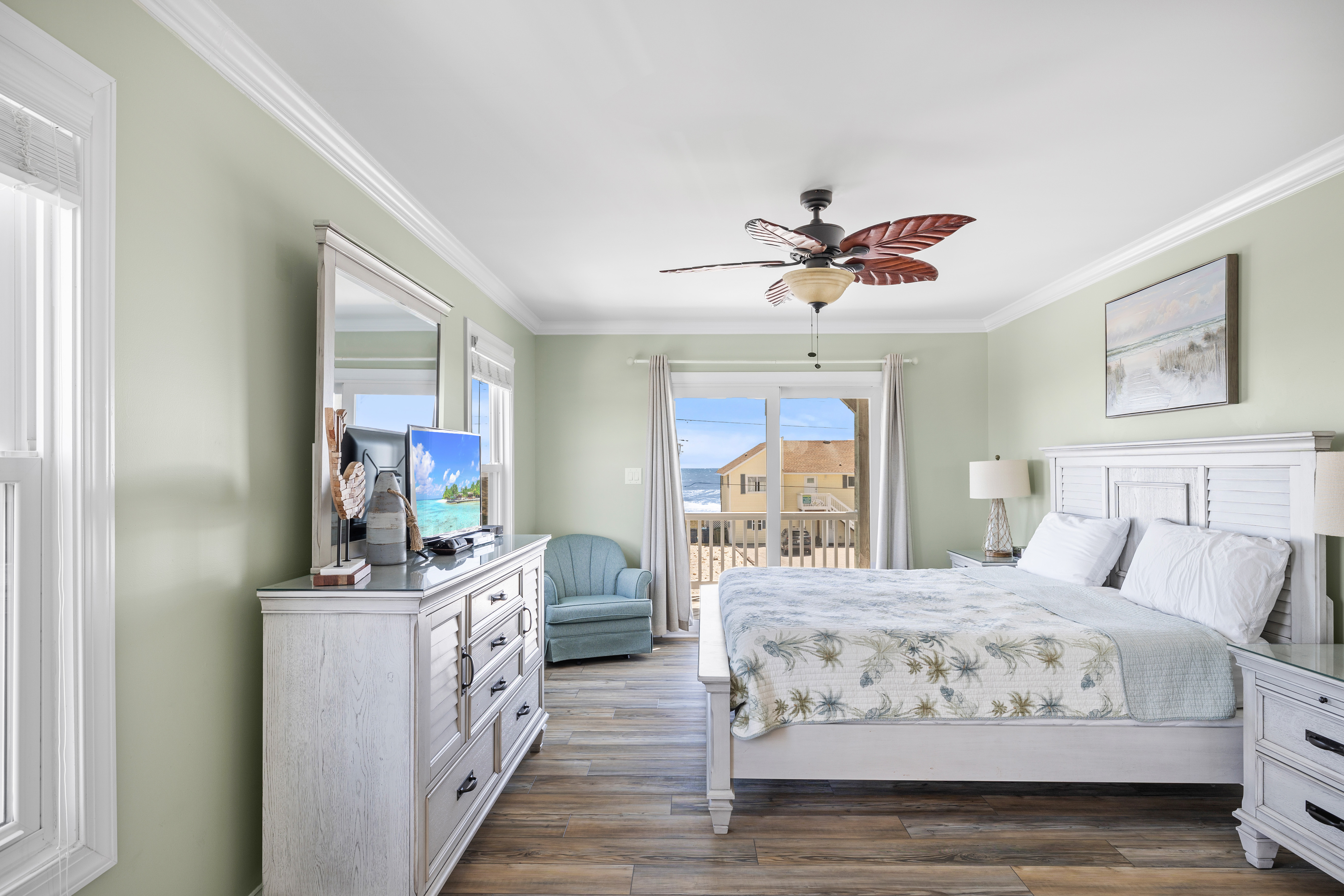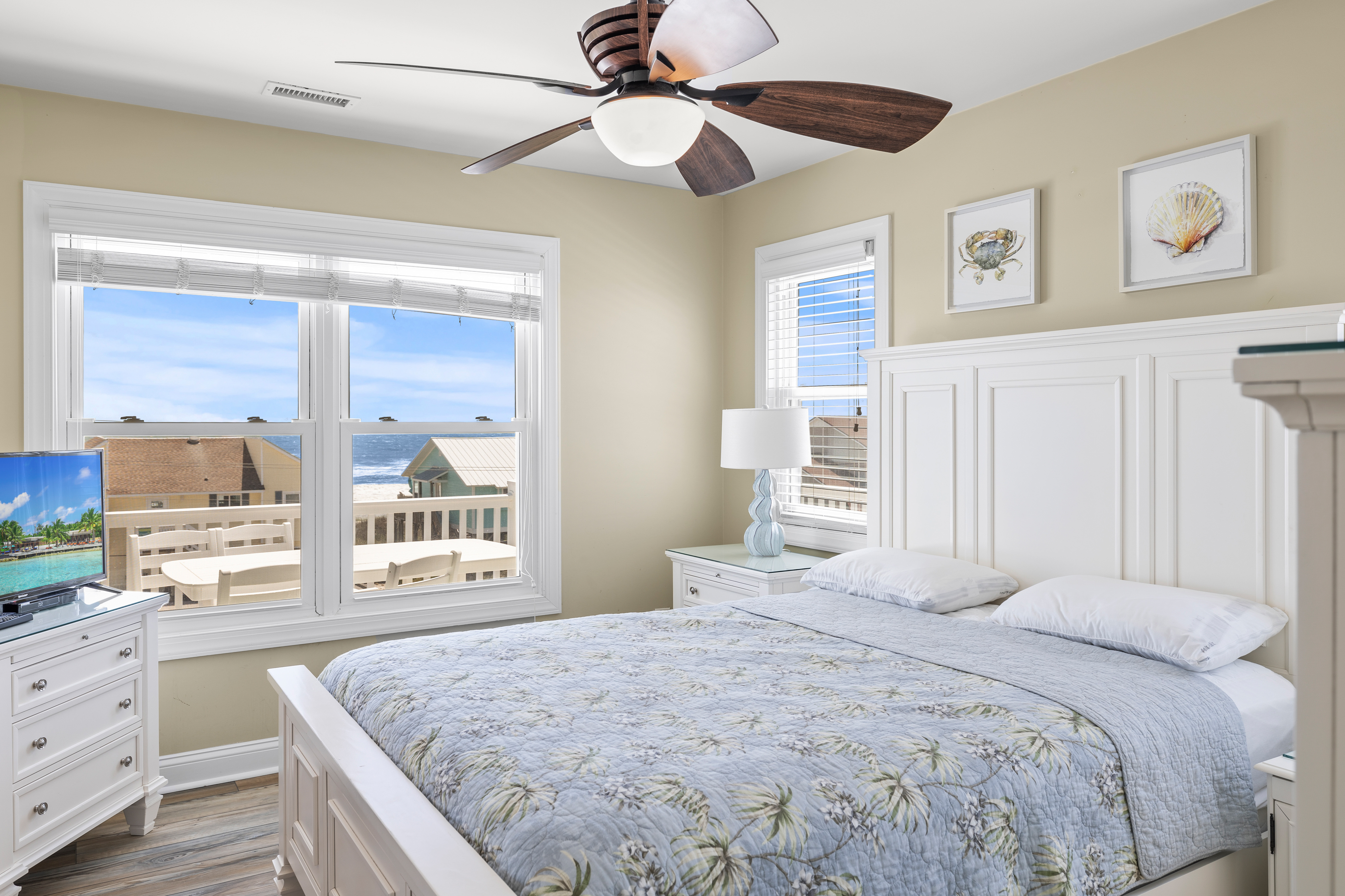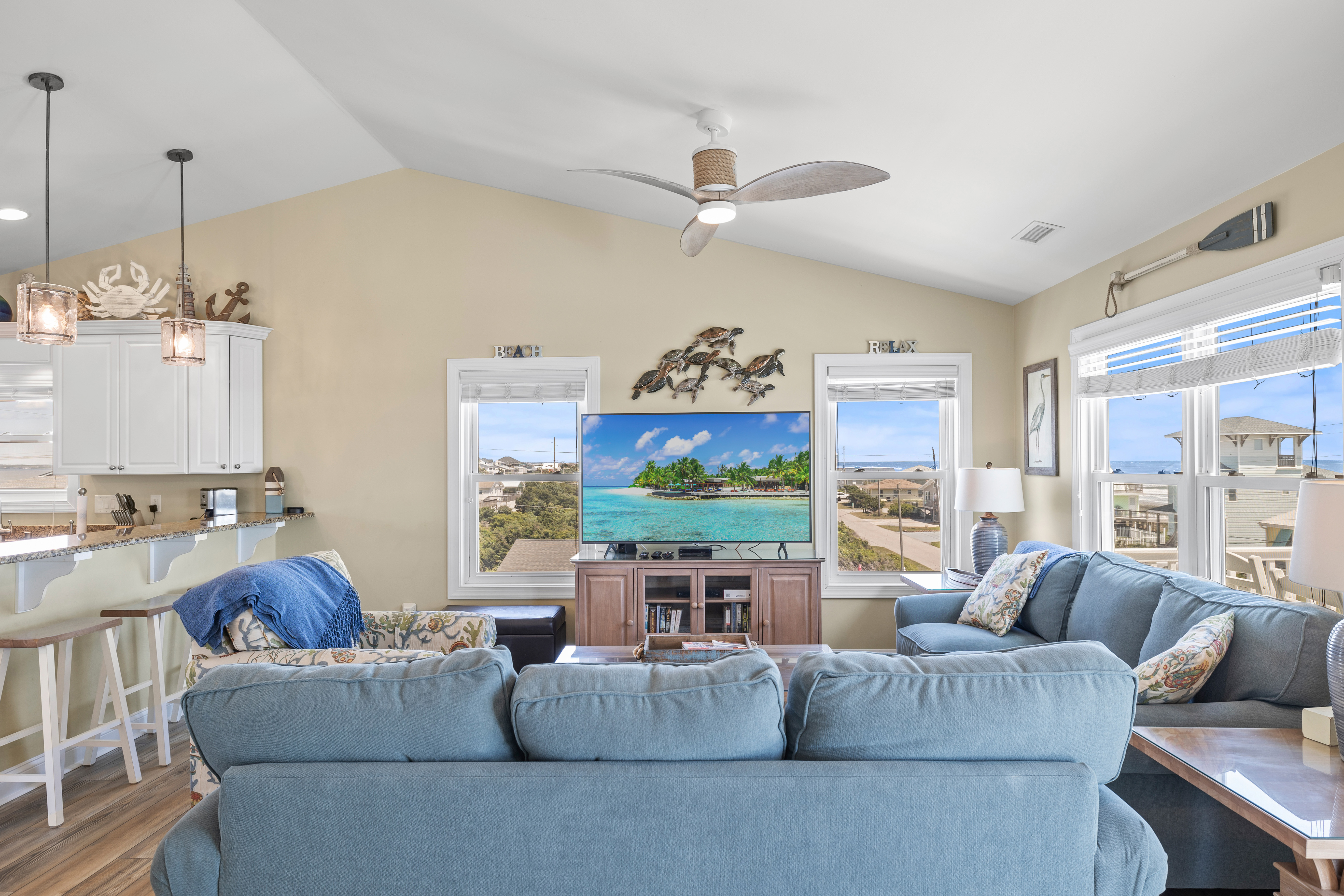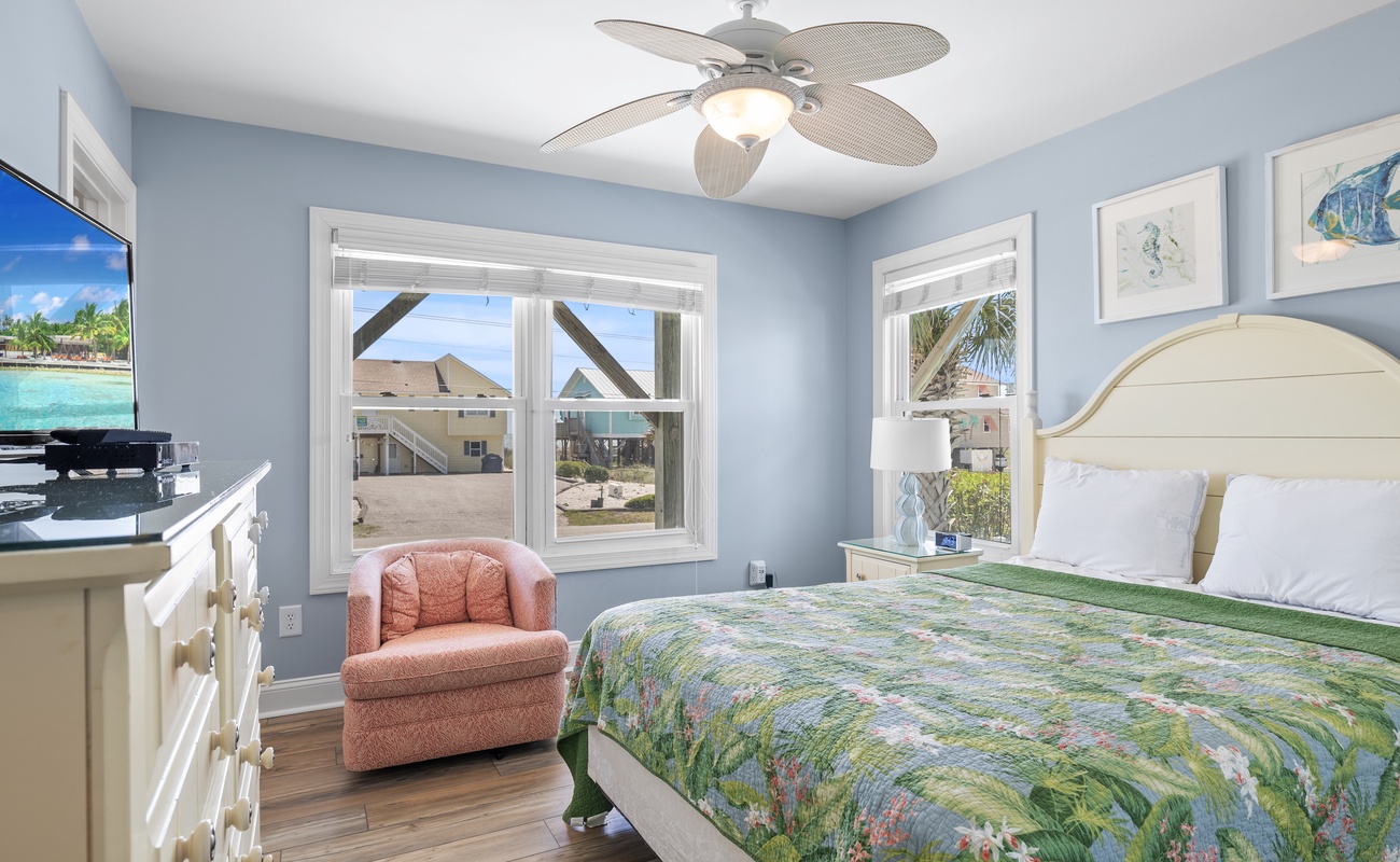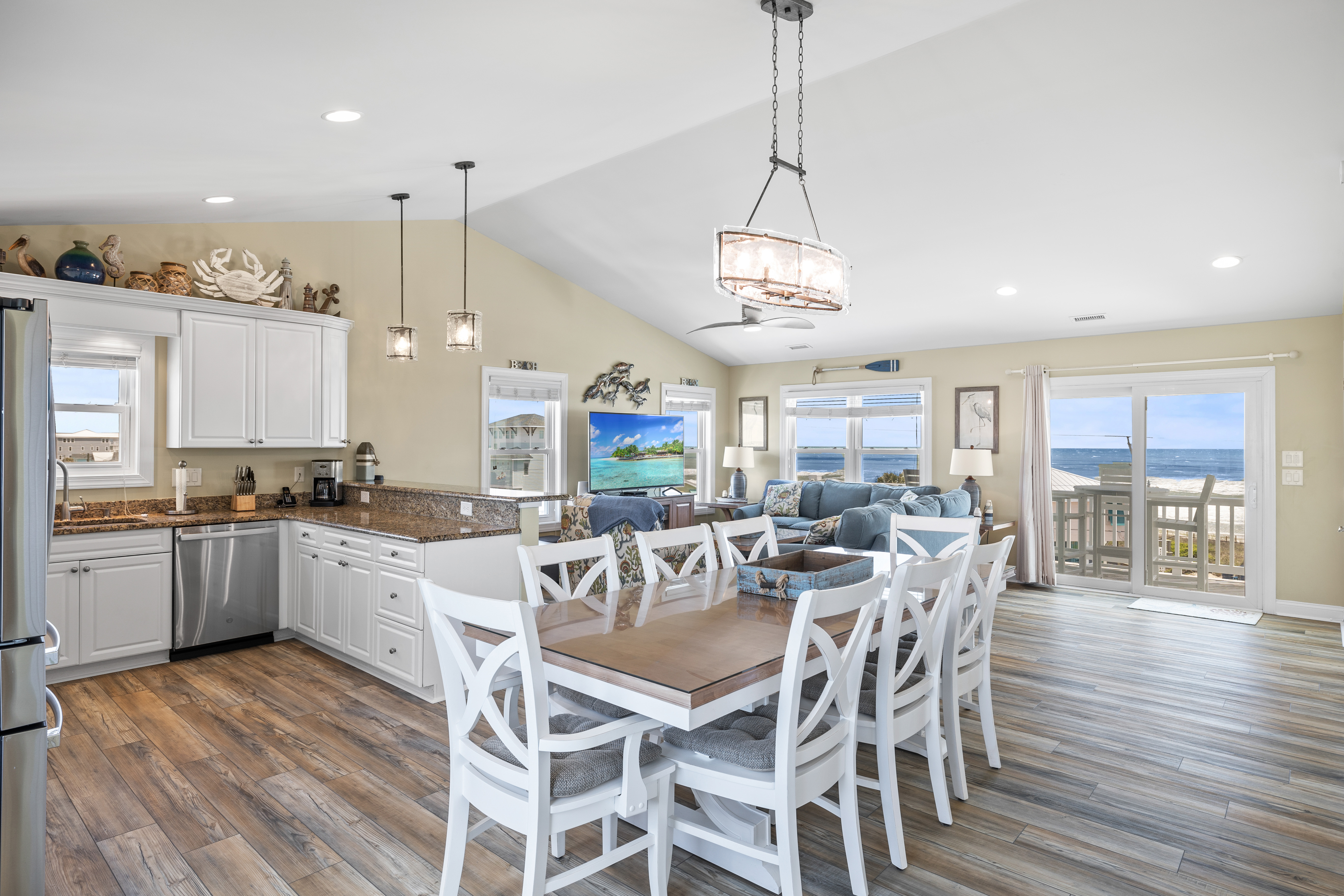 Level Three: Wow! There are Great Ocean and Sound views from every angle from this top level, making you feel like you are on top of the world! The Great Room has a Vaulted Ceiling, LVP and elegant Hardwood floors. The Living Room provides Ocean Views from every window, is delightfully furnished and decorated and is perfect for playing games, enjoying a movie or visiting with family. The Living Room has a Samsung 65" 4K UHD Smart LED with HDR TV, Blu-Ray player, and a High Definition Cable box so you won¡t miss any of your favorite shows! The Dining Room features a beautiful tropical dining table, and provides views of the Ocean and the Sound while dining. The Gourmet Kitchen has granite countertops, stainless steel appliances, and is loaded with top quality kitchenware and appliances. The breakfast bar adjoining the kitchen has seating for four. The Oceanview and Soundview Deck/Porch, which is accessed from the living room, runs across the enter front and side of the house. On the Oceanview Deck/Porch you will find two comfortable Polywood rocking chairs with a small table to relax and enjoy the ocean breeze, the Polywood bistro set with four captain chairs provides a great conversation area for taking in the ocean view or sipping that tropical beverage, or you can share a meal at the Polywood La Casa Cafe dining set which seats six. Bedroom #5 is a Oceanside Bedroom with Ocean Views, has a Queen size bed and French doors that open into the Great Room Area. This bedroom offers a large chest of drawers, two side tables for storage and a flat screen 32" LED 720p HDTV with Blu-Ray Player. The full bathroom on this level that has separate entrances to both the Great Room and to bedroom #5. The bathroom door to the great room can be locked to make Bedroom #5 a Master Bedroom with private bathroom.