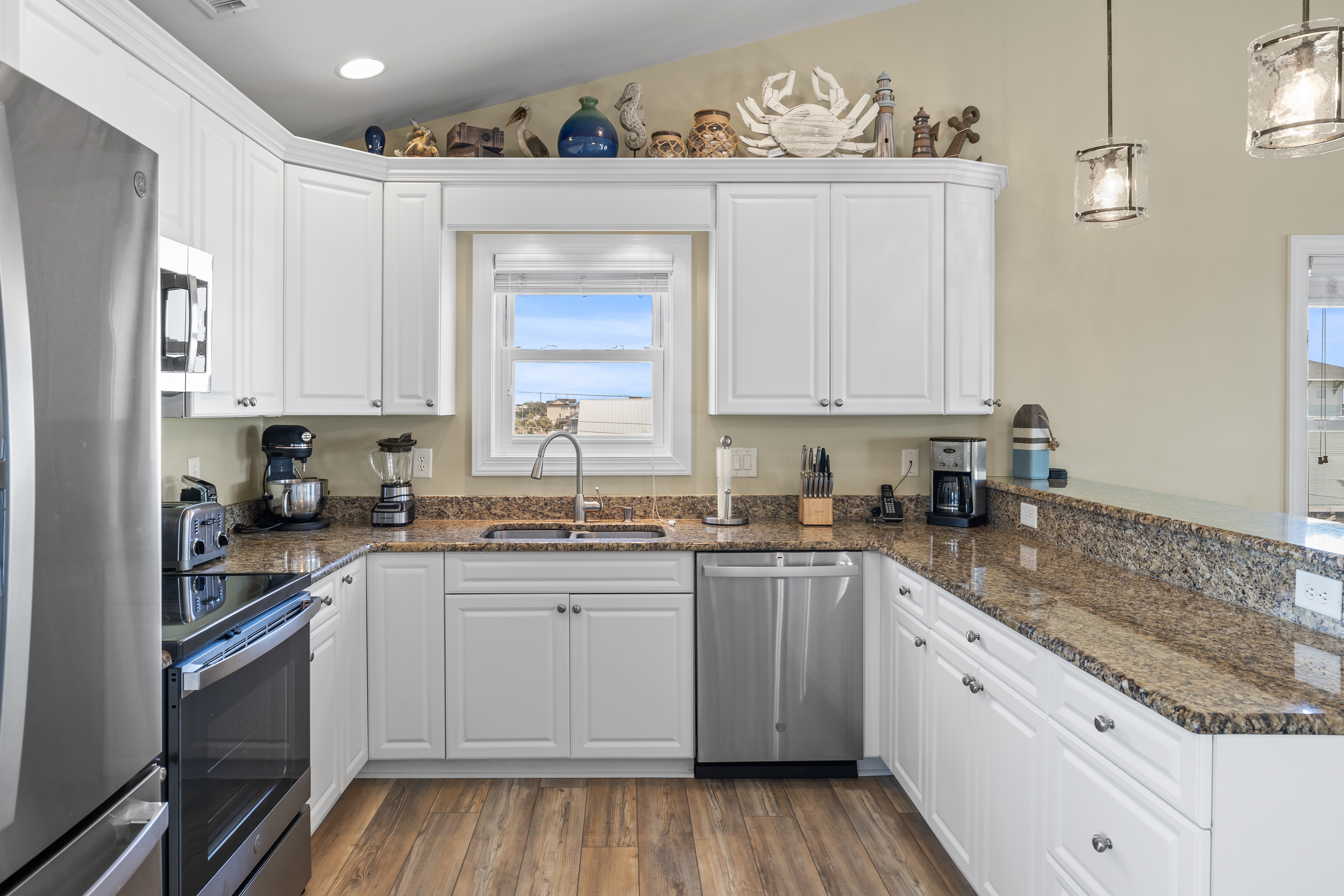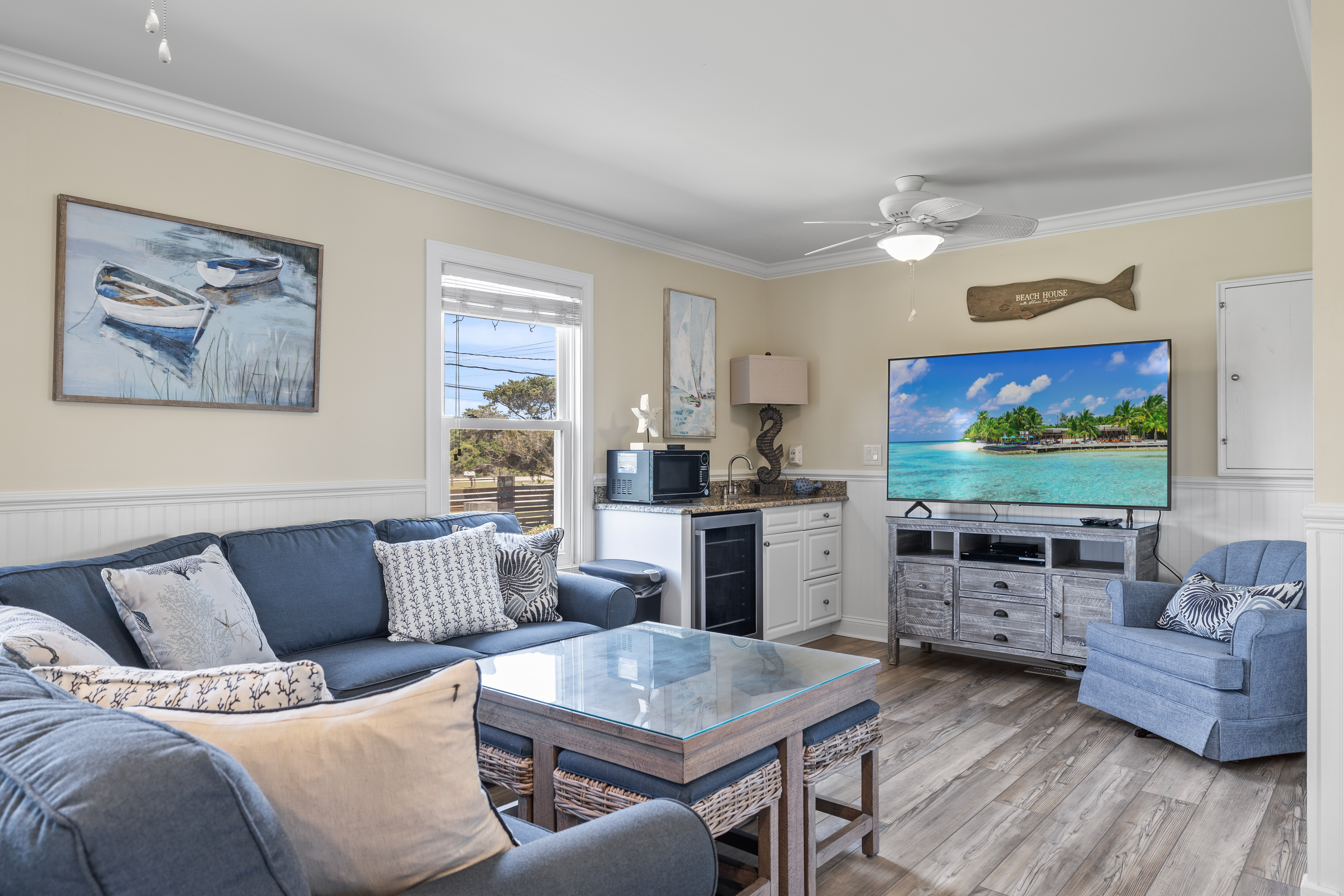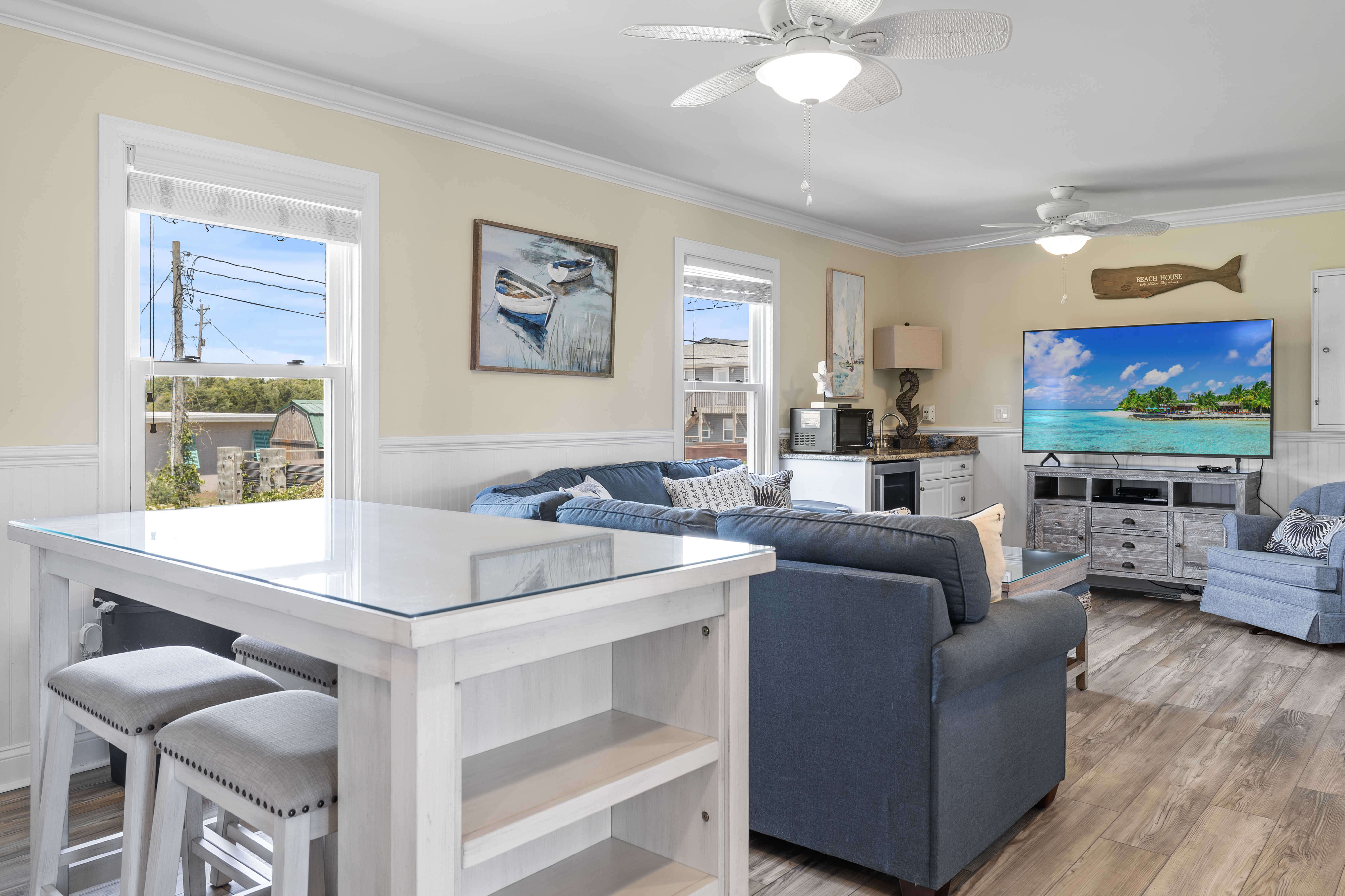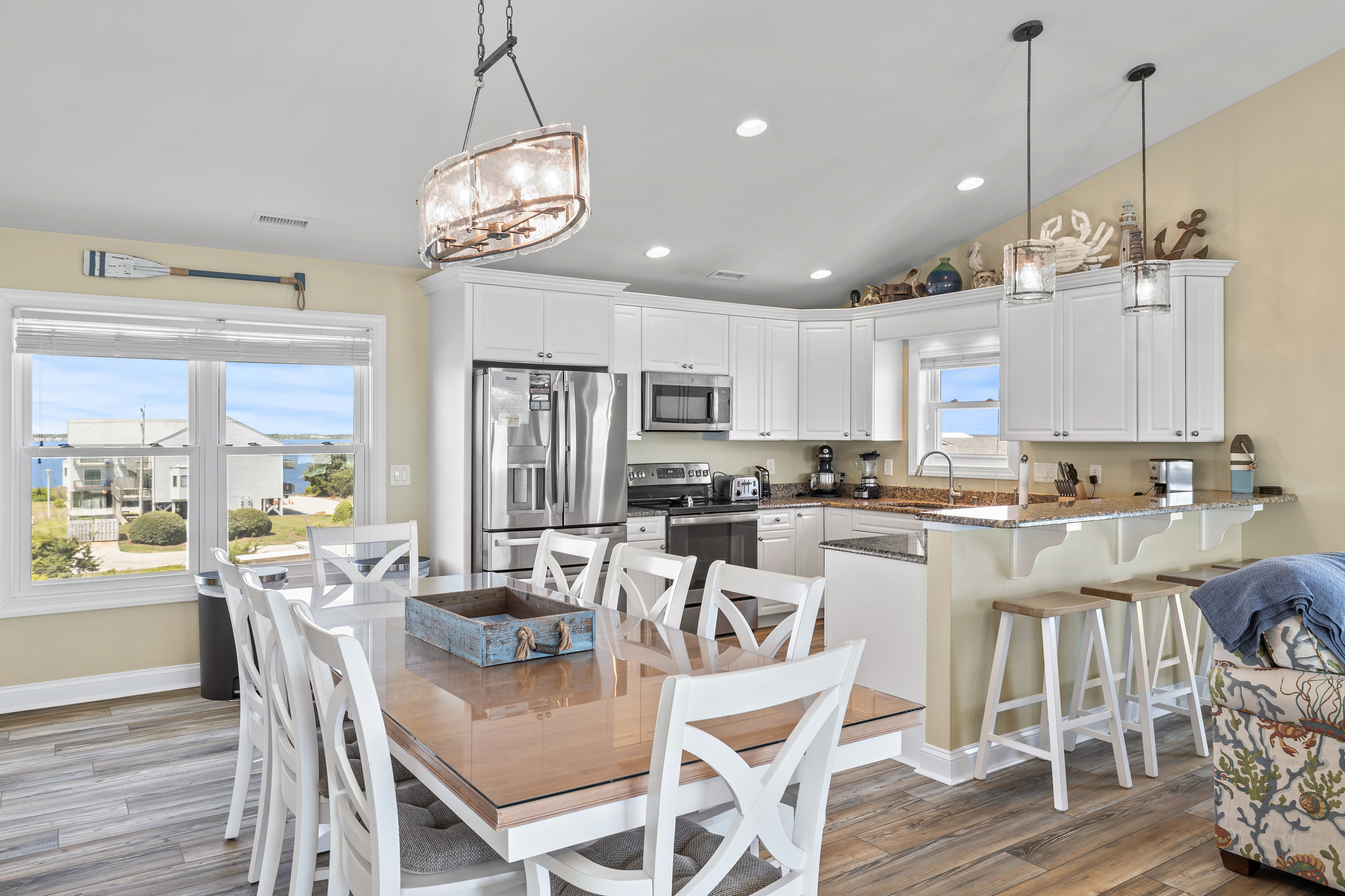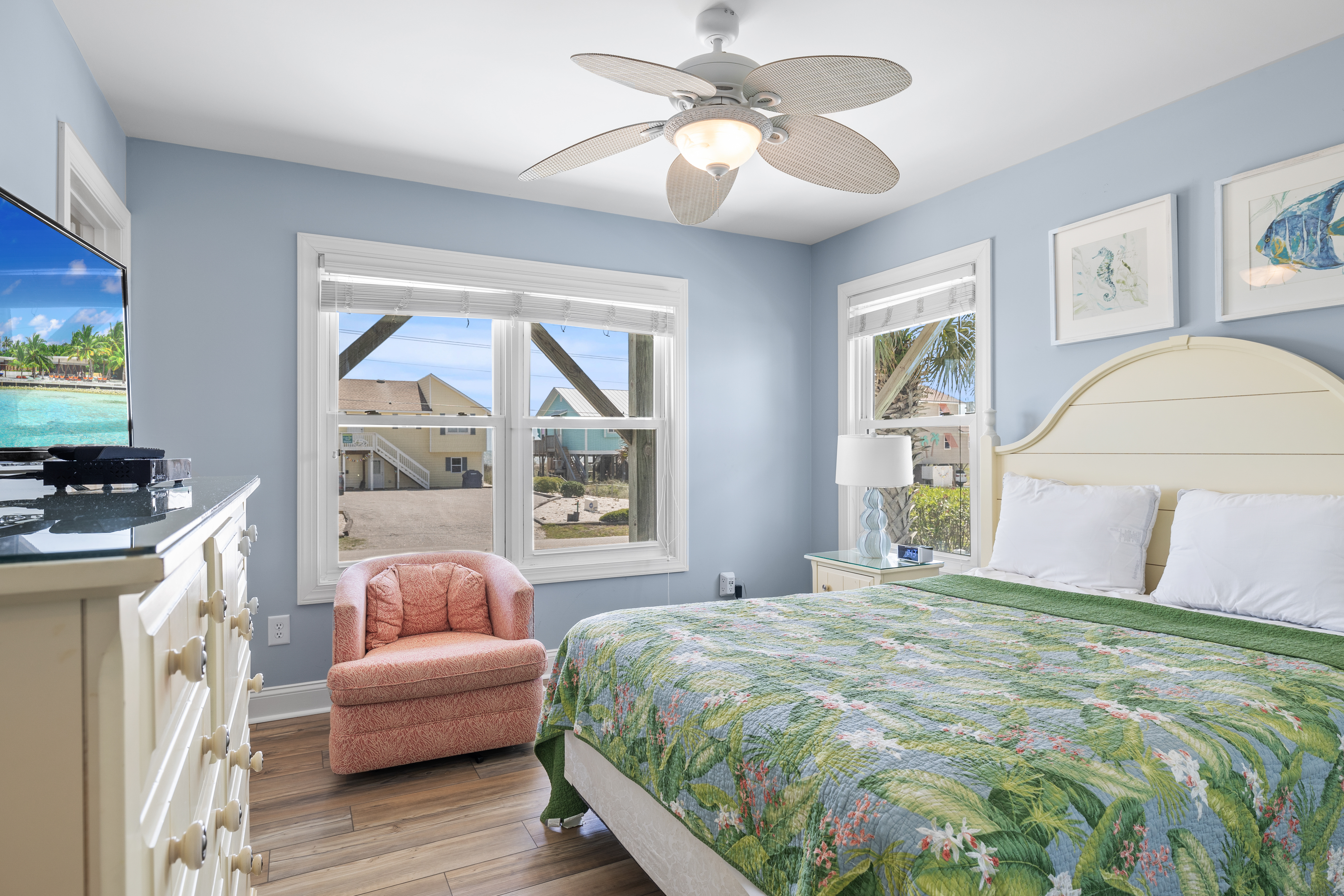 Level Three: Wow! There are Great Ocean and Sound views from every angle from this top level, making you feel like you are on top of the world! The Great Room has a Vaulted Ceiling, LVP and elegant Hardwood floors. The Living Room provides Ocean Views from every window, is delightfully furnished and decorated and is perfect for playing games, enjoying a movie or visiting with family. The Living Room has a Samsung 65" 4K UHD Smart LED with HDR TV, Blu-Ray player, and a High Definition Cable box so you won¡t miss any of your favorite shows! The Dining Room features a beautiful tropical dining table, and provides views of the Ocean and the Sound while dining. The Gourmet Kitchen has granite countertops, stainless steel appliances, and is loaded with top quality kitchenware and appliances. The breakfast bar adjoining the kitchen has seating for four. The Oceanview and Soundview Deck/Porch, which is accessed from the living room, runs across the enter front and side of the house. On the Oceanview Deck/Porch you will find two comfortable Polywood rocking chairs with a small table to relax and enjoy the ocean breeze, the Polywood bistro set with four captain chairs provides a great conversation area for taking in the ocean view or sipping that tropical beverage, or you can share a meal at the Polywood La Casa Cafe dining set which seats six. Bedroom #5 is a Oceanside Bedroom with Ocean Views, has a Queen size bed and French doors that open into the Great Room Area. This bedroom offers a large chest of drawers, two side tables for storage and a flat screen 32" LED 720p HDTV with Blu-Ray Player. The full bathroom on this level that has separate entrances to both the Great Room and to bedroom #5. The bathroom door to the great room can be locked to make Bedroom #5 a Master Bedroom with private bathroom.