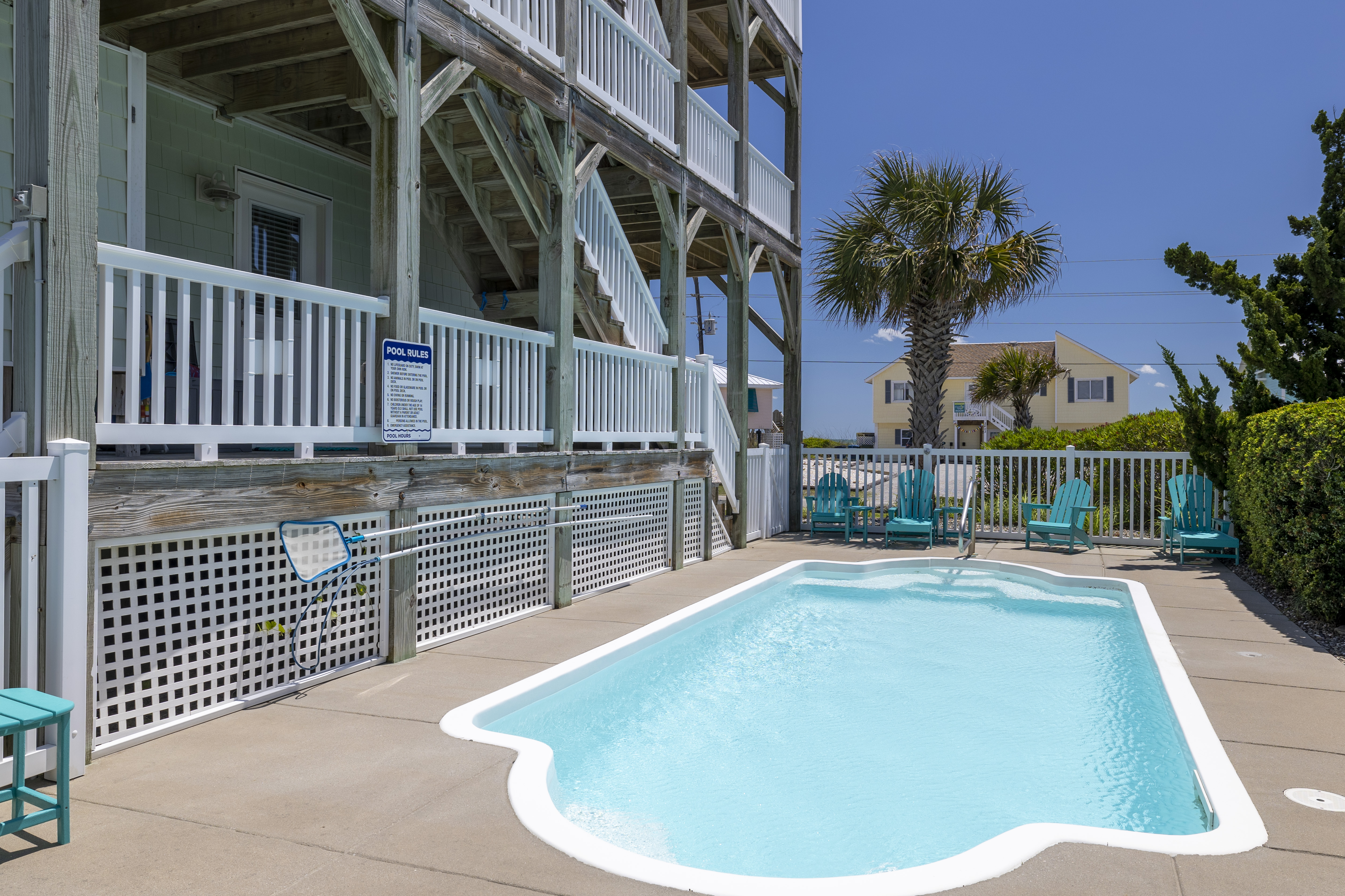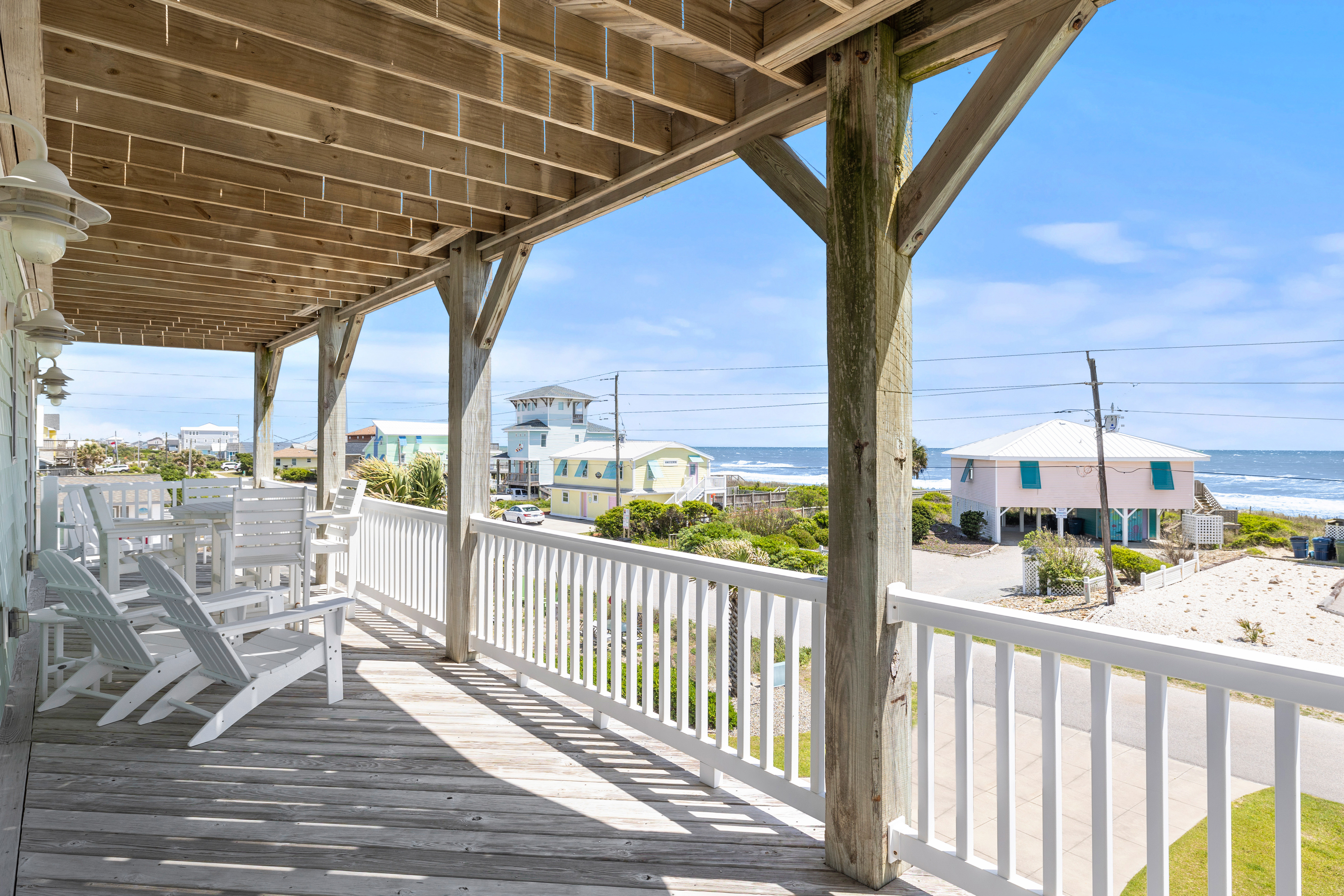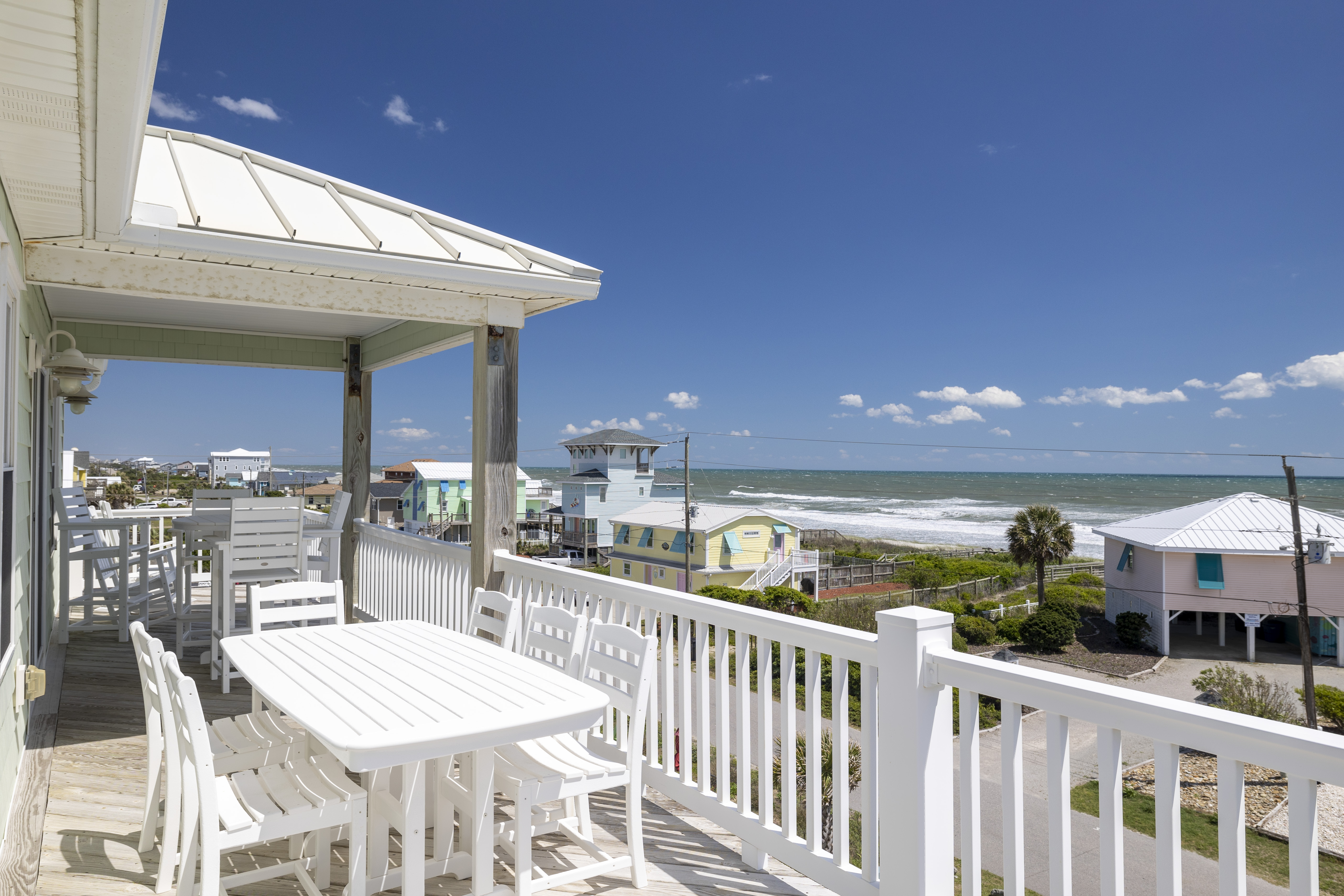 An Emerald Breeze was built in 2009, Almost Oceanfront, 5 Bedroom, 4 Bath Custom Designed Home located across from a Public Beach Access. This home has a Reverse Floor Plan, great Water Views from every room, and Ocean Views from every bedroom. It also has been Professionally Decorated, looks like a Model Home, and has tons of things to do during your stay! Have some family fun in the first level Game Room/Theater Room playing one of the many games, watching a High Definition Blu-Ray/DVD with the Samsung 65" 4K UHD Smart LED with HDR wide screen home theater TV, or surfing the web using the free High speed Wireless Internet Access. When you are ready to try some outside activities, put on your bathing suits and take a dip in the Private Oceanview Swimming Pool (may be heated for an additional $650/week + tax from March 1 to November 1), relax in the Hot Tub, enjoy the great Ocean and Sound Views from the 3 levels of Decks, play a little Volleyball in the landscaped back yard, or head over to the Beach using the beach access across the street!
