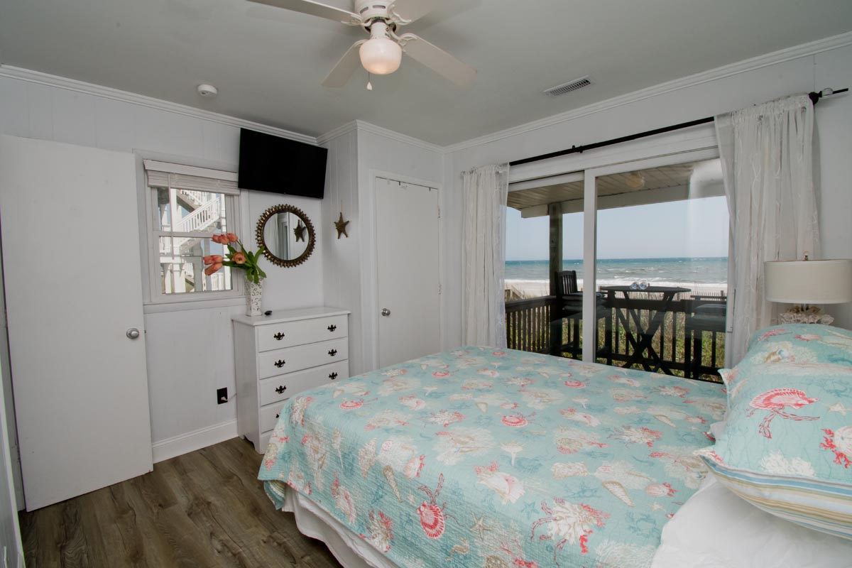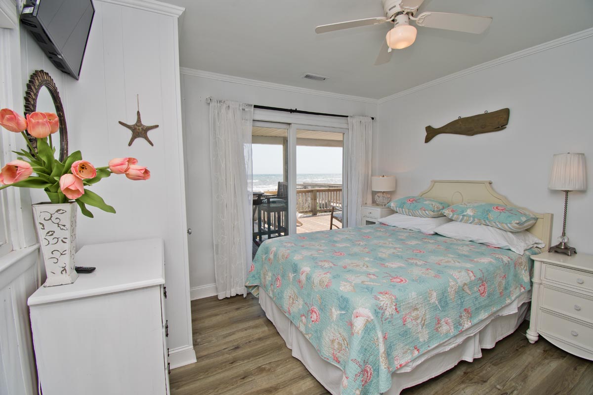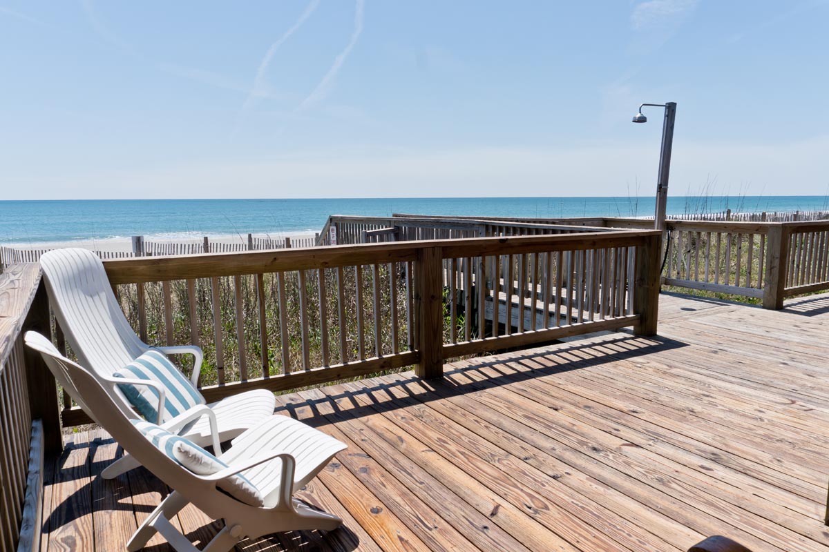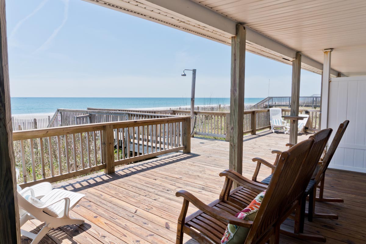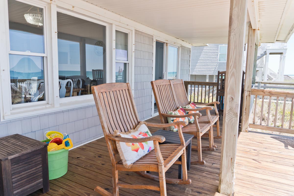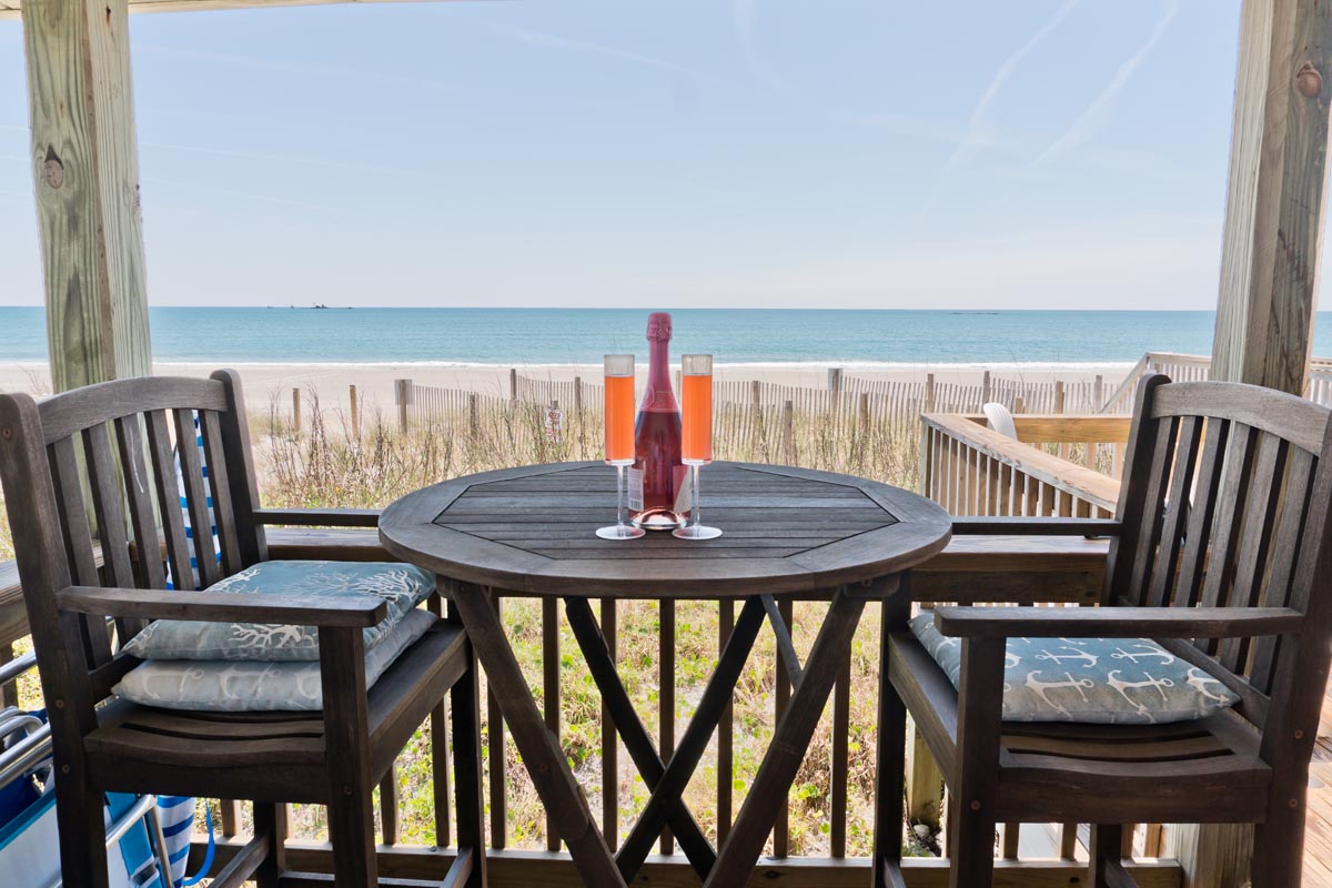At Anchor East you don’t get any closer to the beach! Beautiful Oceanfront views from the Living Area, Dining Area, and Master bedroom. Enjoy the coastal breezes under the fully covered porch sipping on Iced Tea relaxing in the teak rockers or get sun kissed reclining in the resin beach chairs on the sun deck or have lunch and cocktails around the teak bistro table and chairs. Master bedroom has its own oceanfront deck access. Oceanfront deck Side tables that also double as deck coolers for your favorite refreshment.