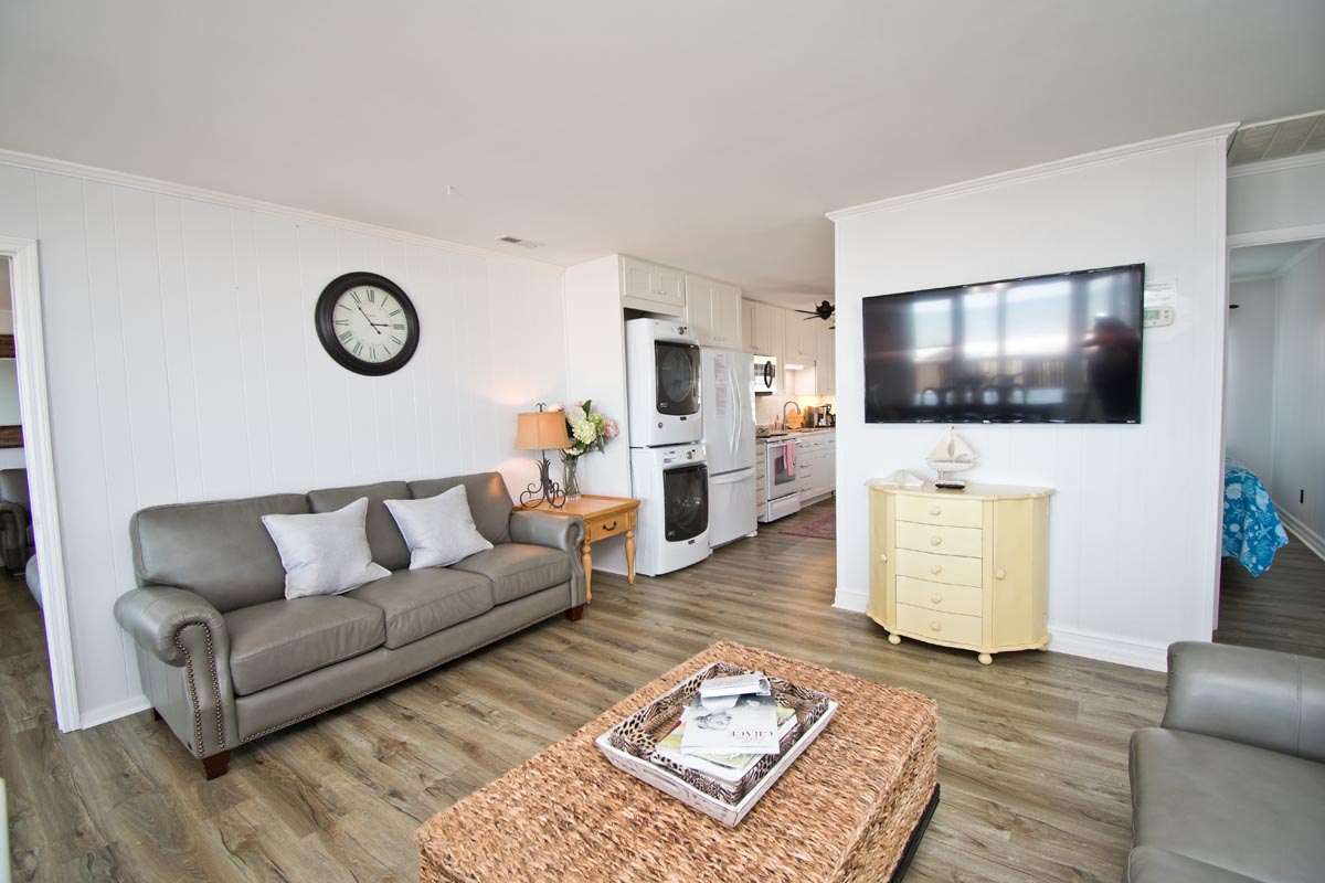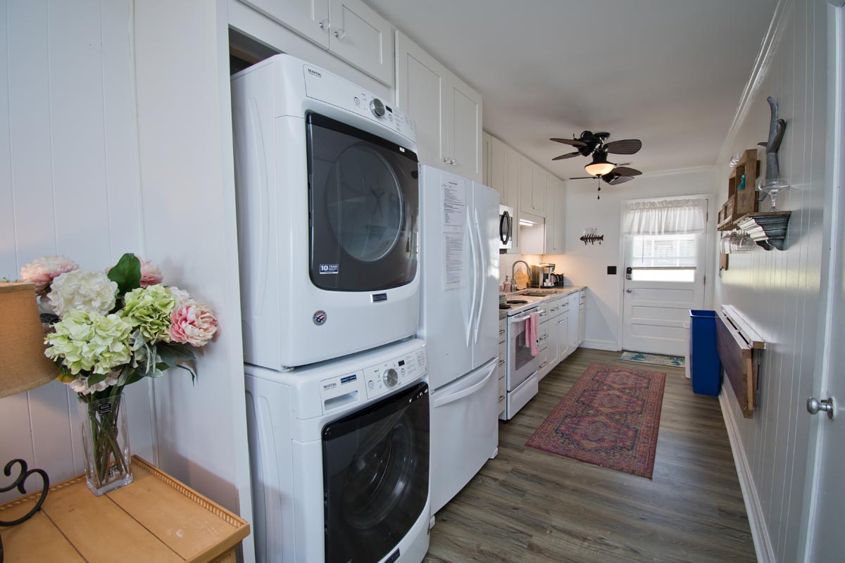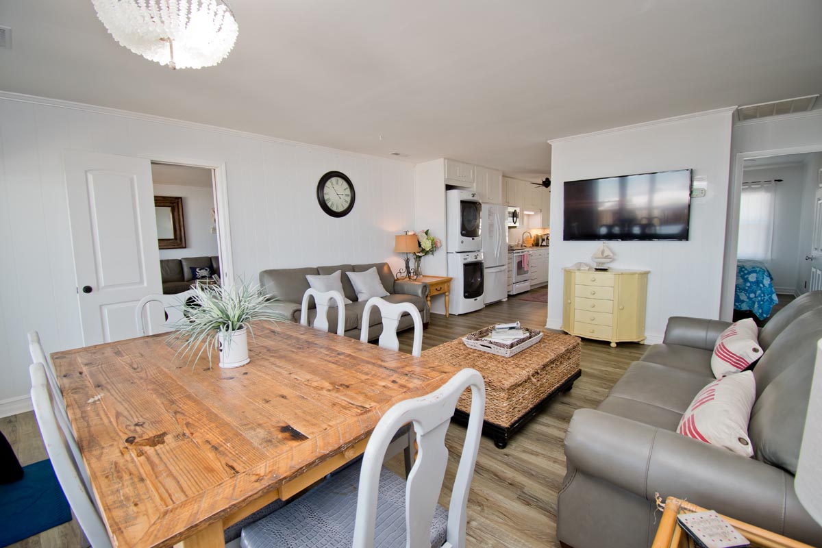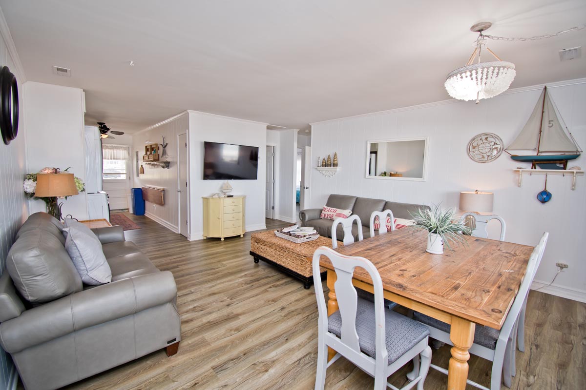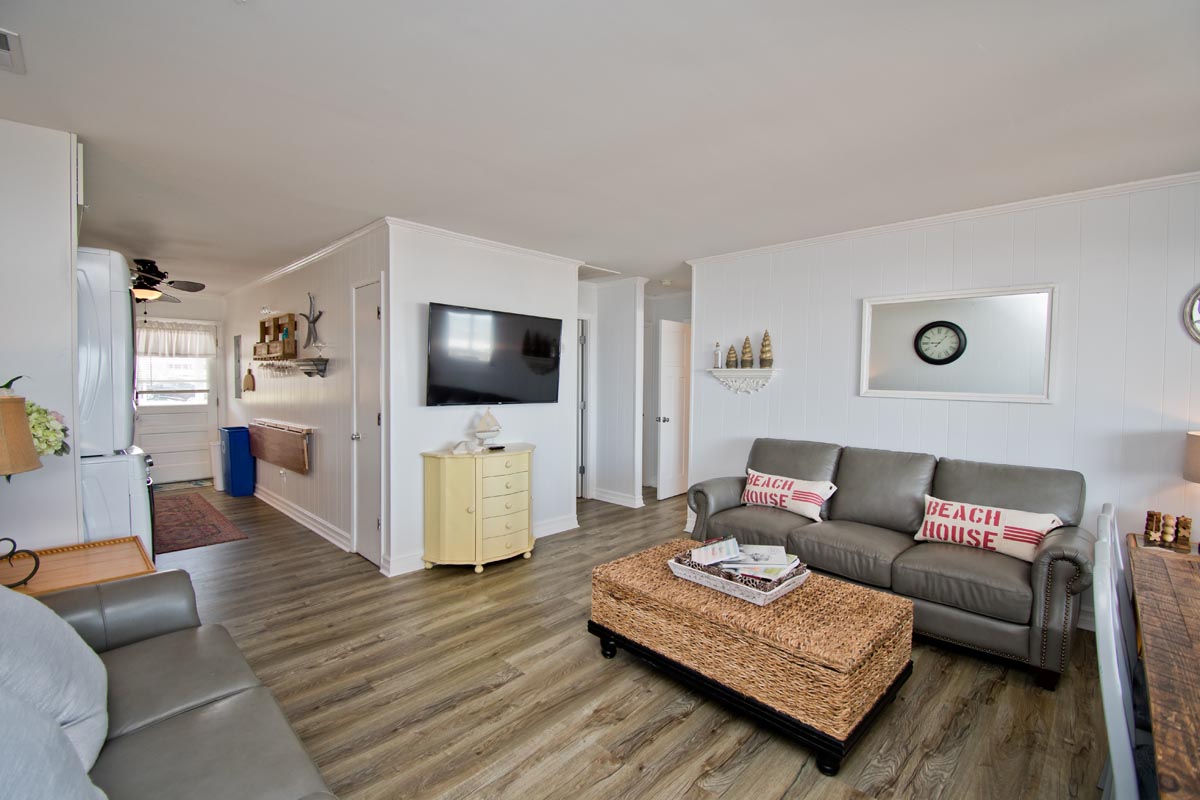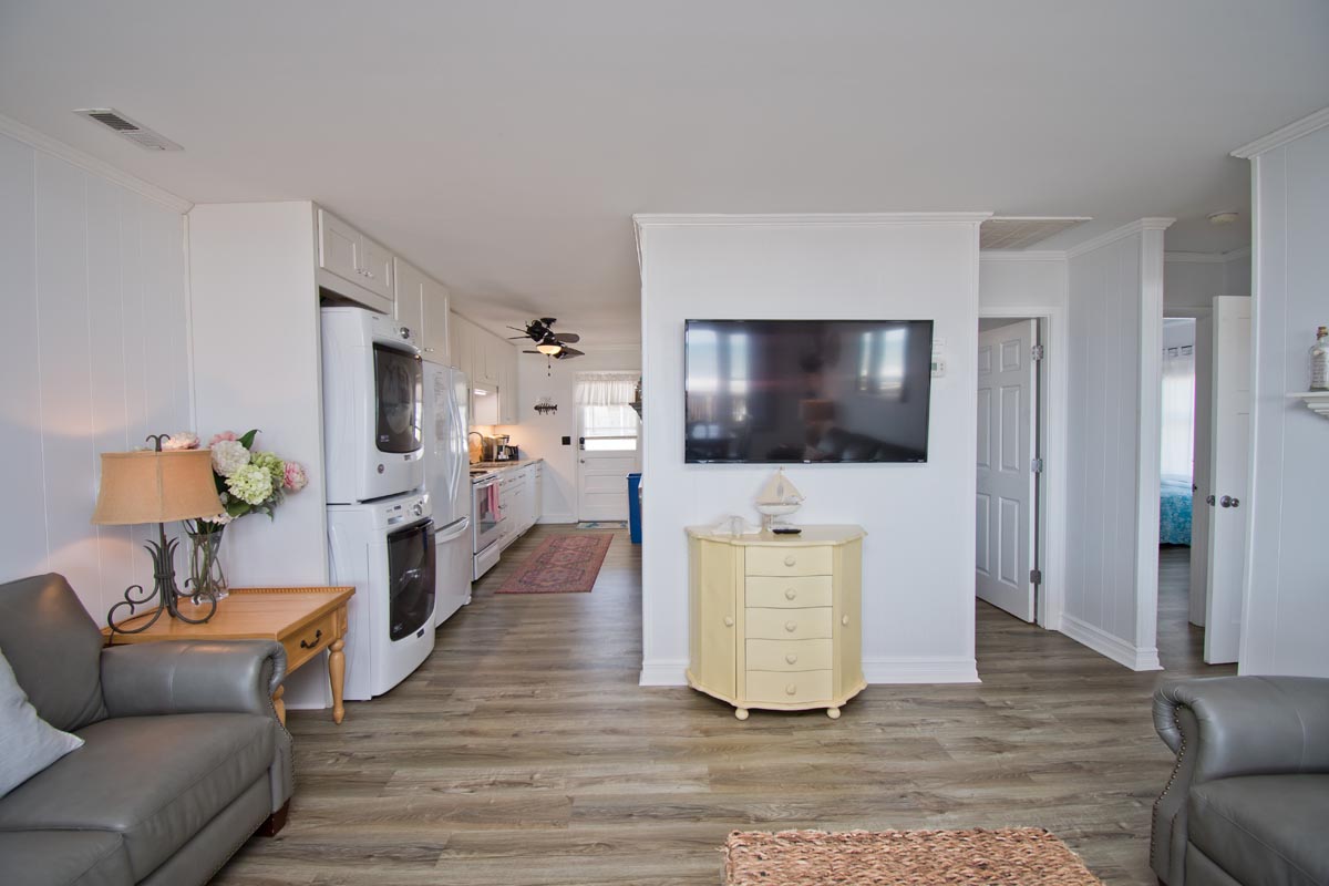 Amenities include: High-Speed Wireless Internet, Outdoor Teak Bistro seating and Teak Rockers, Interior Washer and Dryer, Full Size Microwave, a Park-Style Charcoal Grill, Beach Chairs and Shibumi, Ample Parking, Inner Connecting Door, an Outdoor Shower (cold only), Furniture, Hardwood Floors throughout. 55" 4k Ultra HD in Living Area, and TCL Roku TVs in Master and streetside bedroom.. To make sharing your vacation easier, a connecting door between duplexes,At Anchor East/West, allows for convenient access and a shared living space when renting both halves.