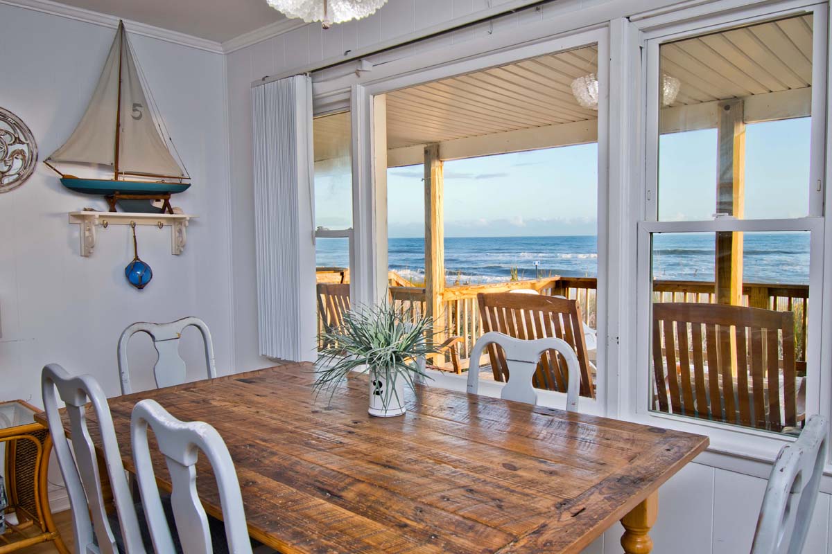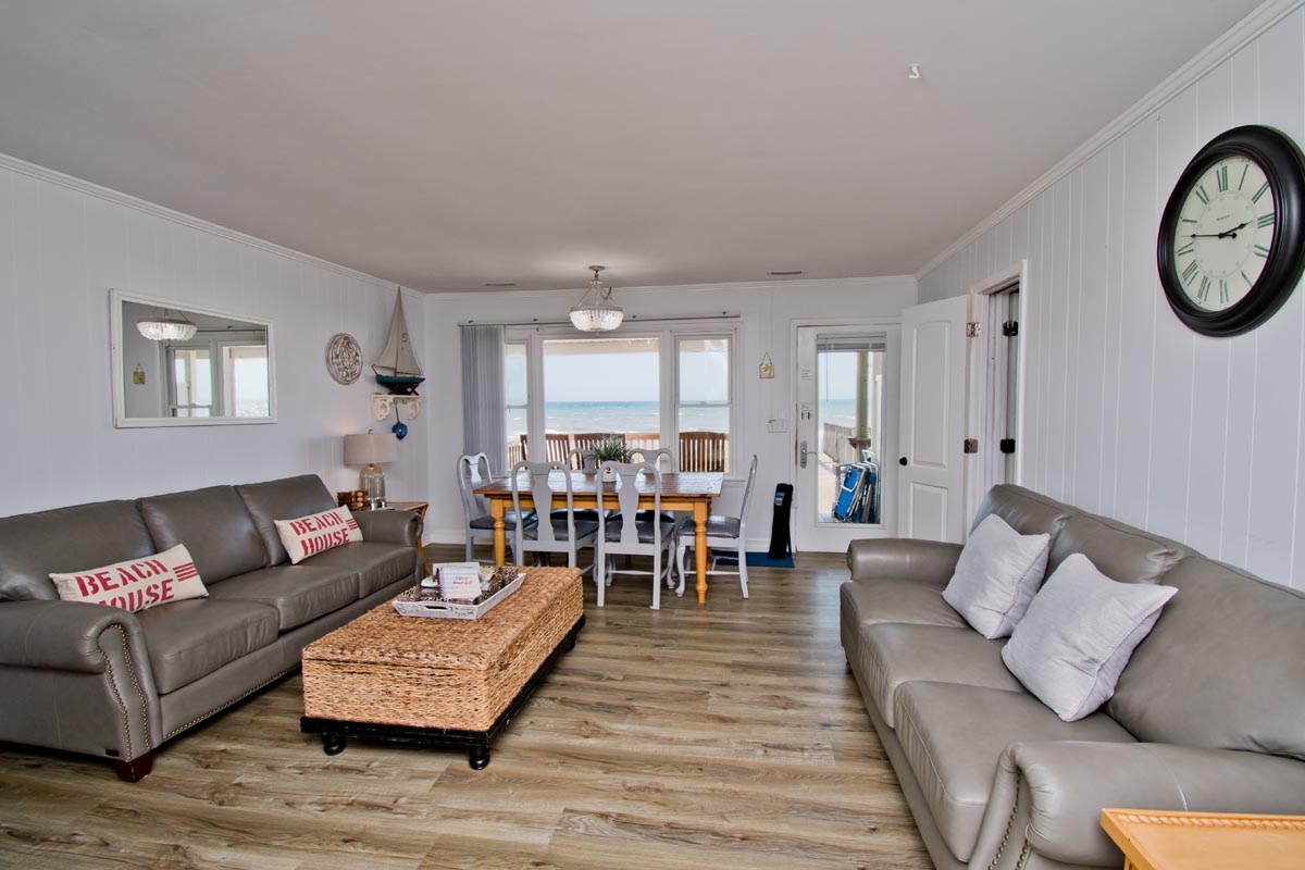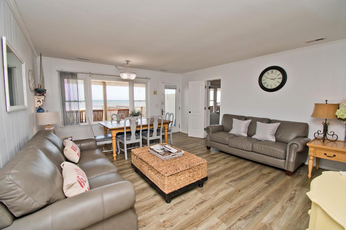 Oceanfront Living room has two large comfortable top grain leather sofas. Oceanfront Dining seating for 6. All smart Roku TVs.