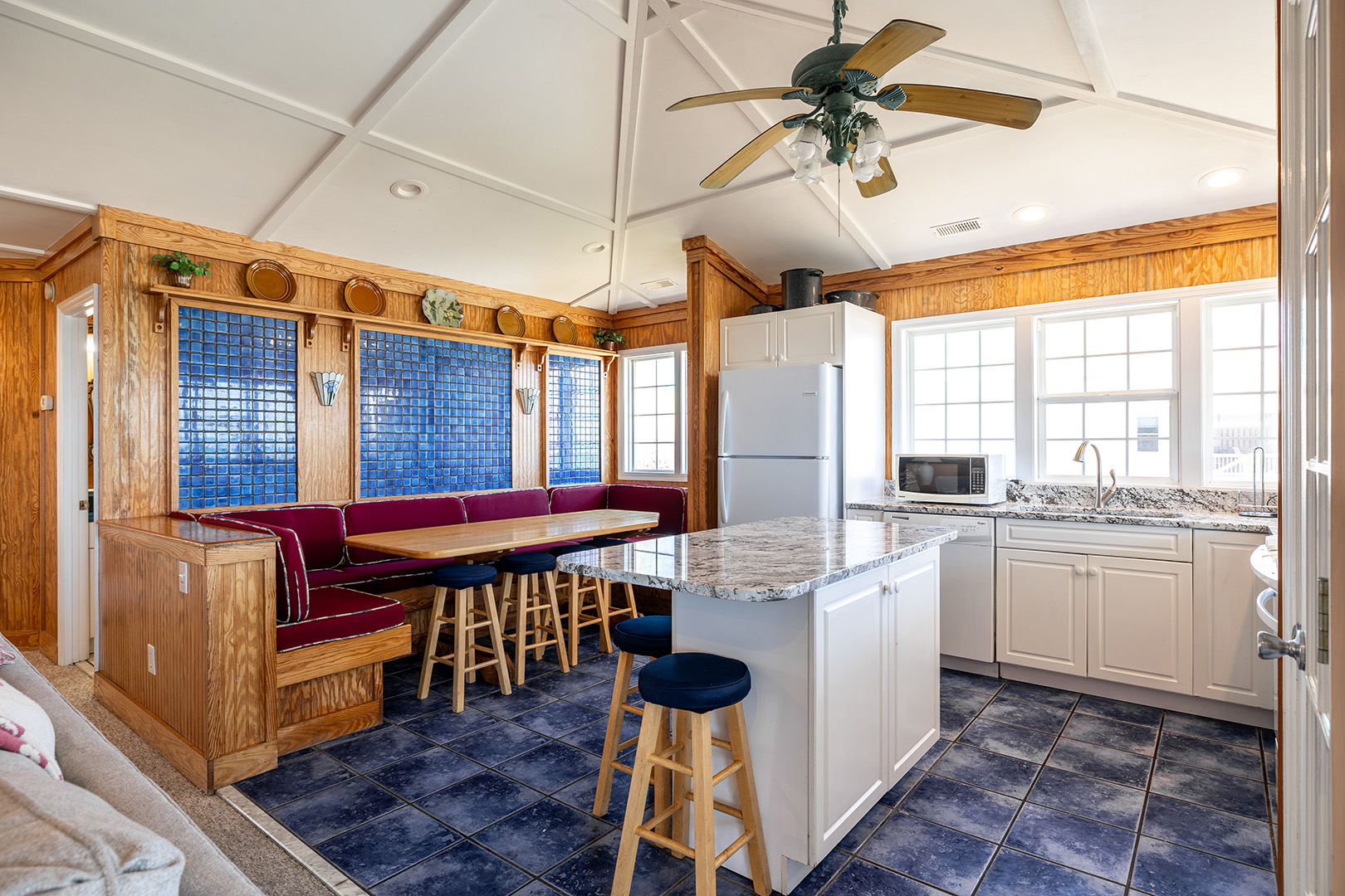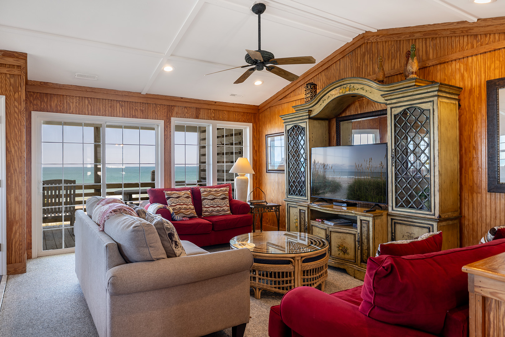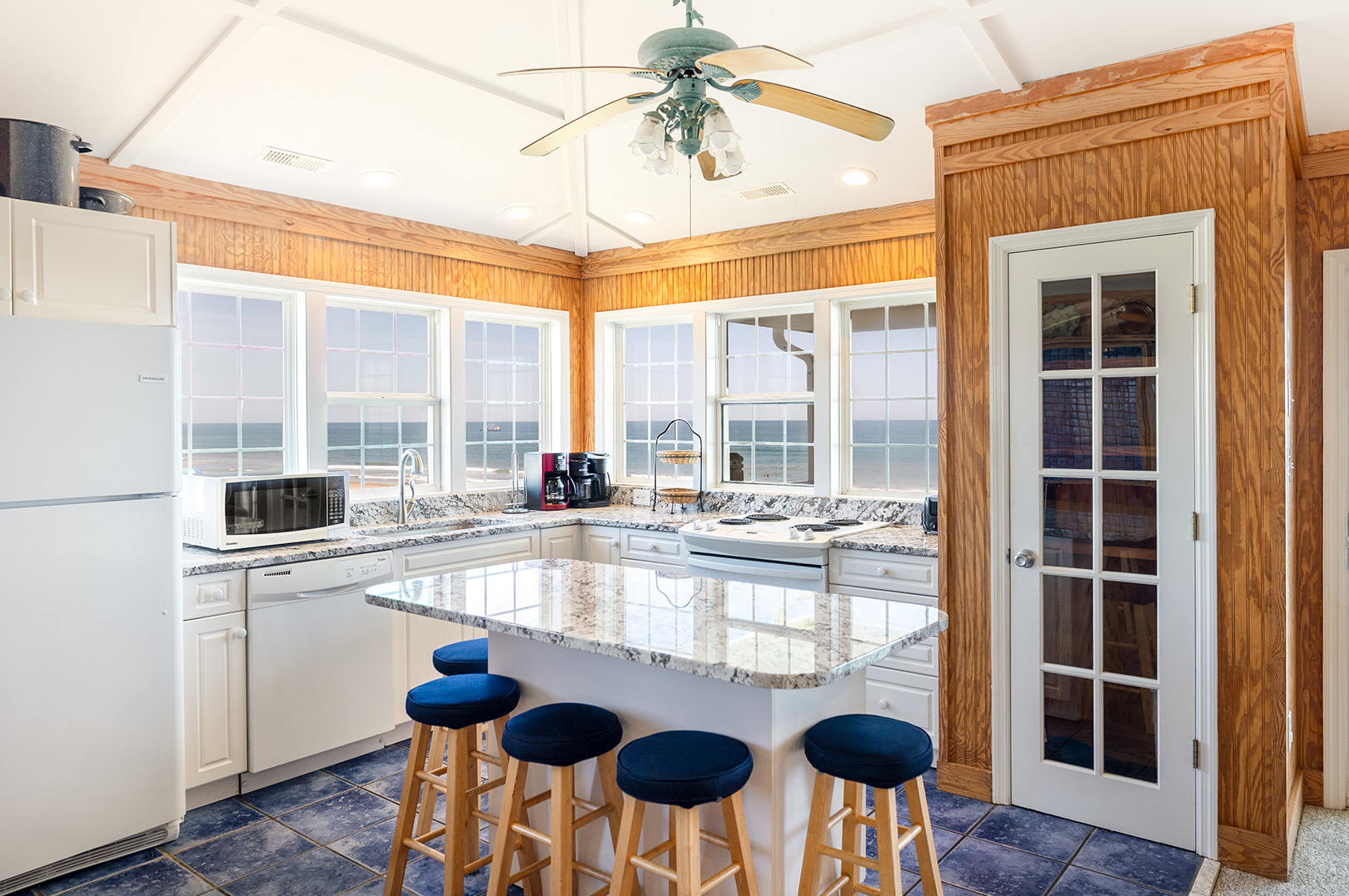 Level Two: Oceanfront Living and Dining Areas with Cathedral Ceilings and a large Covered Deck overlooking the Pool. The Kitchen has the best view of any on the beach and a large Island Bar which also has a Microwave and a Dishwasher. Oceanview Bedroom #4 has a Queen Bed, a Twin Bed and a Private Deck.