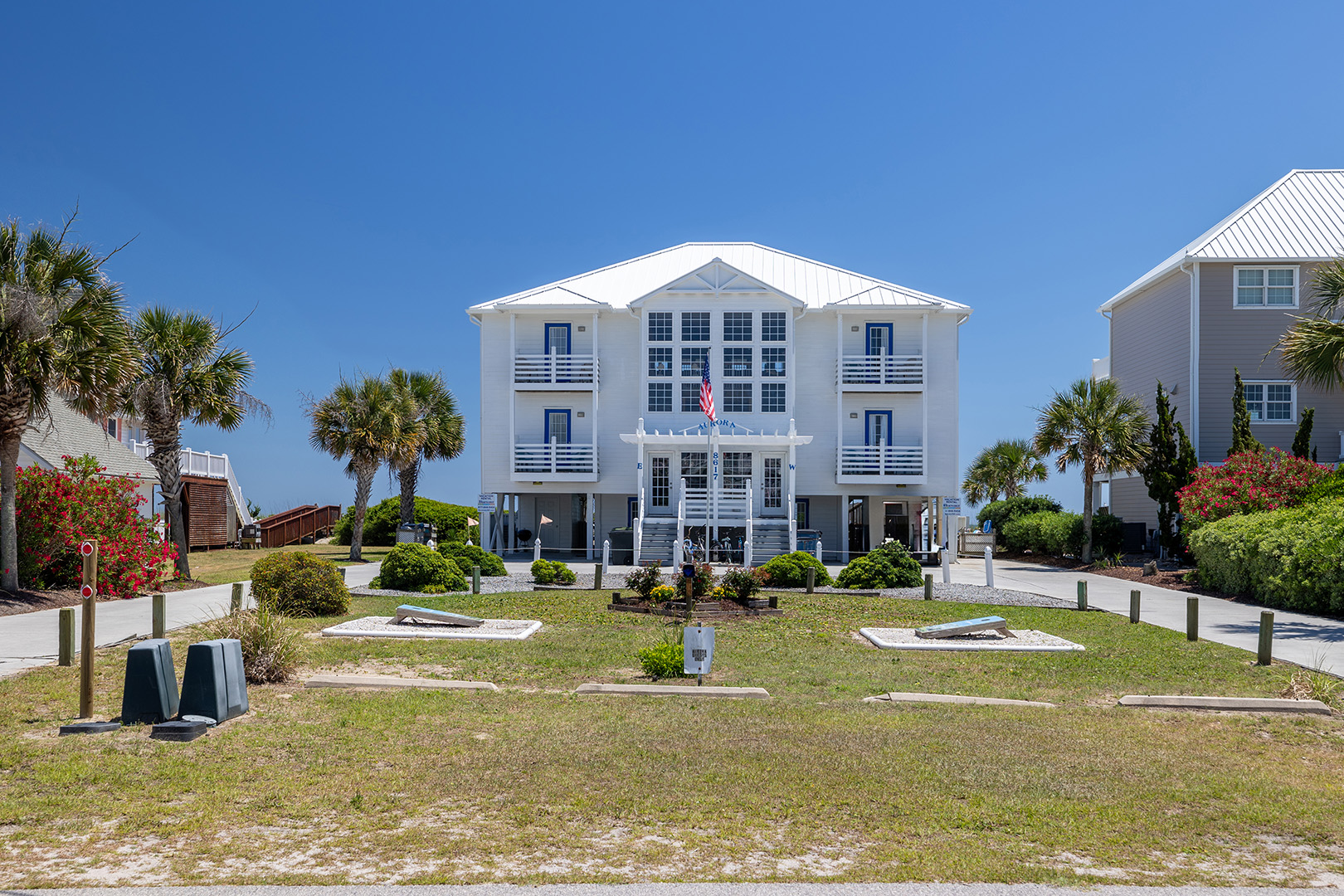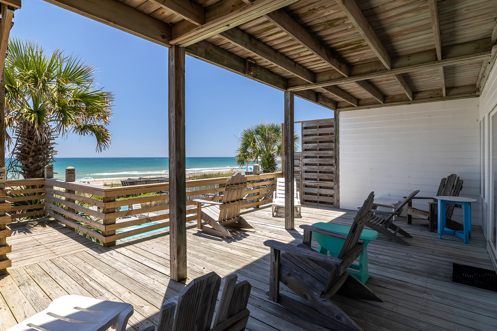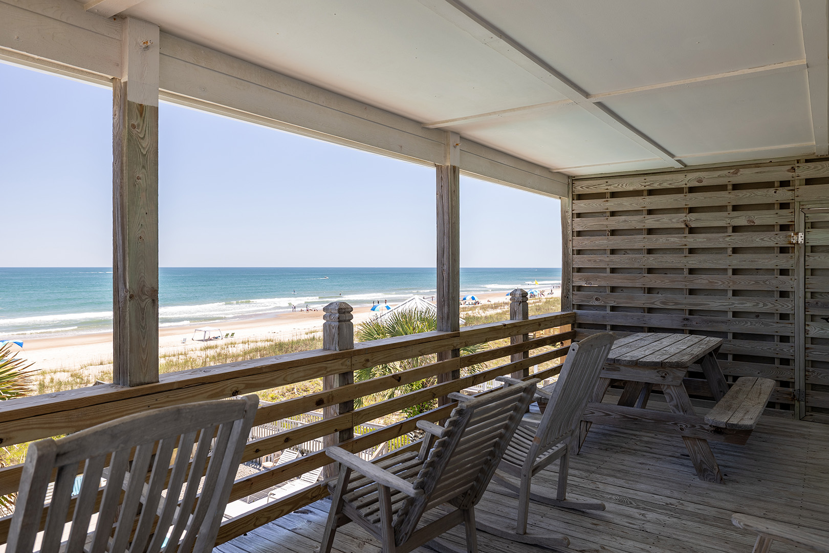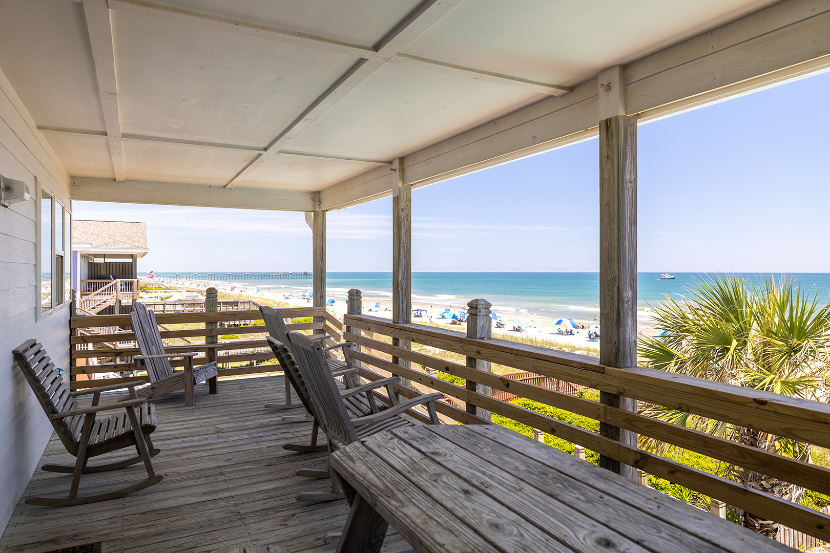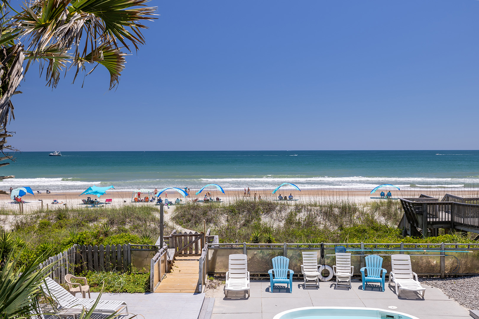 Aurora East is an Oceanfront Duplex with a Swimming Pool (shared with the adjacent side), a Private Hot Tub, and High Speed Internet Access! (Bring your own computer.) Just steps to the ocean. Within walking distance to fishing pier, restaurants, shopping and small theme park! Open and Covered decks with beautiful Ocean Views, with table, chairs, and Rockers. Aurora East is equipped with a Water Softener, Fax Machine, Beach Chairs, Bicycles and a variety of sports equipment. Ceiling Fans in all rooms!