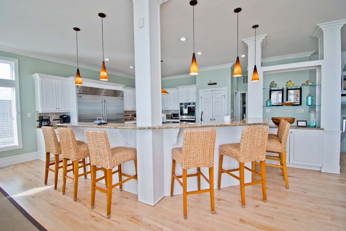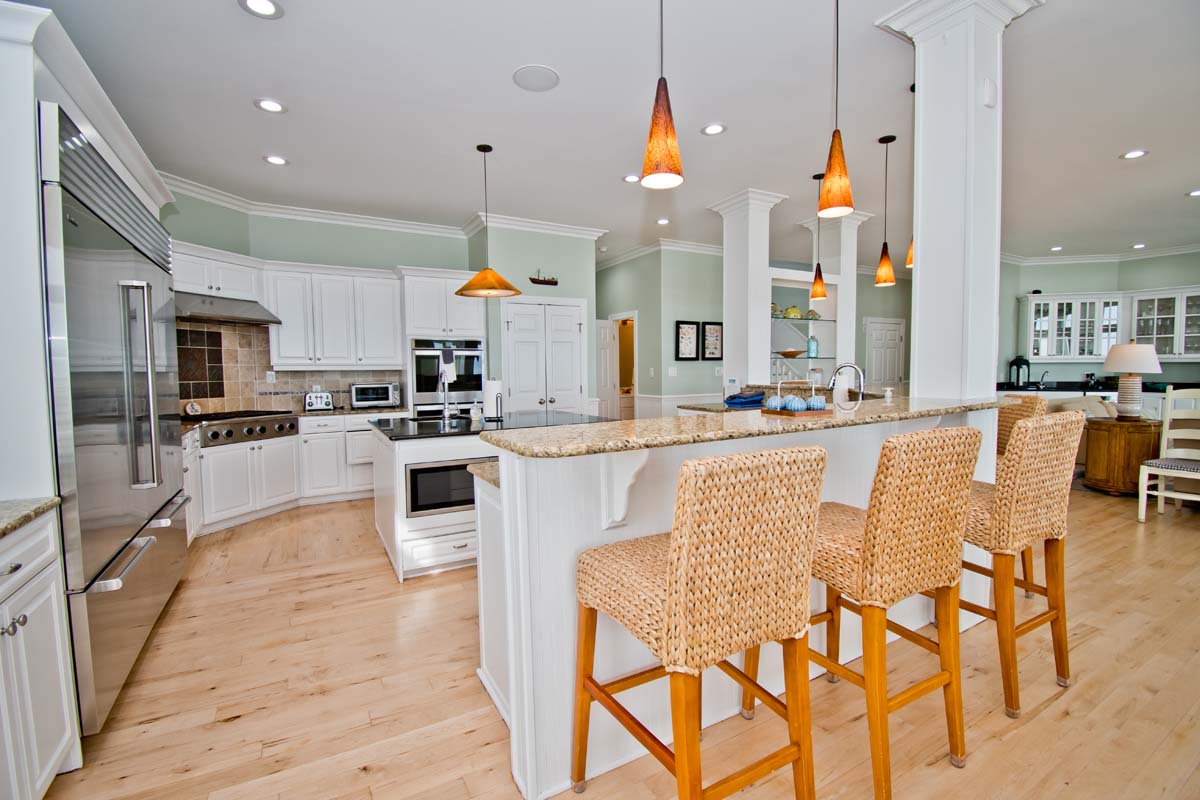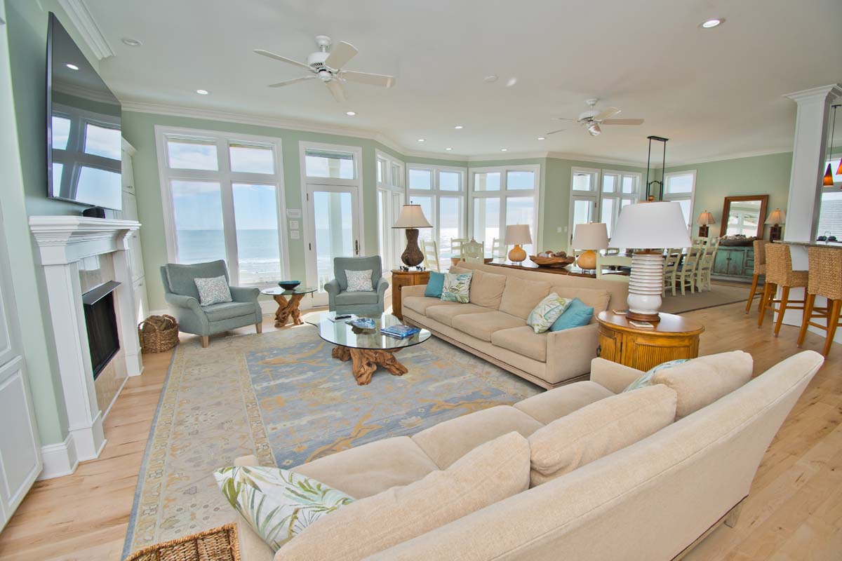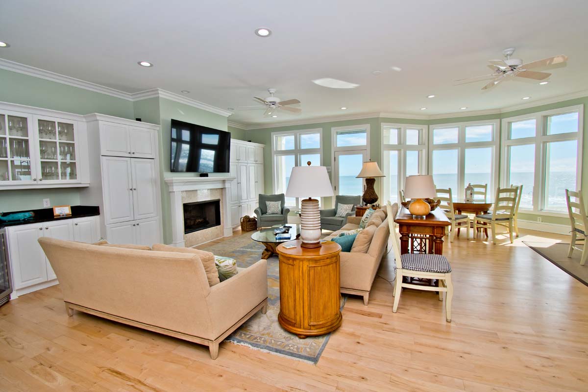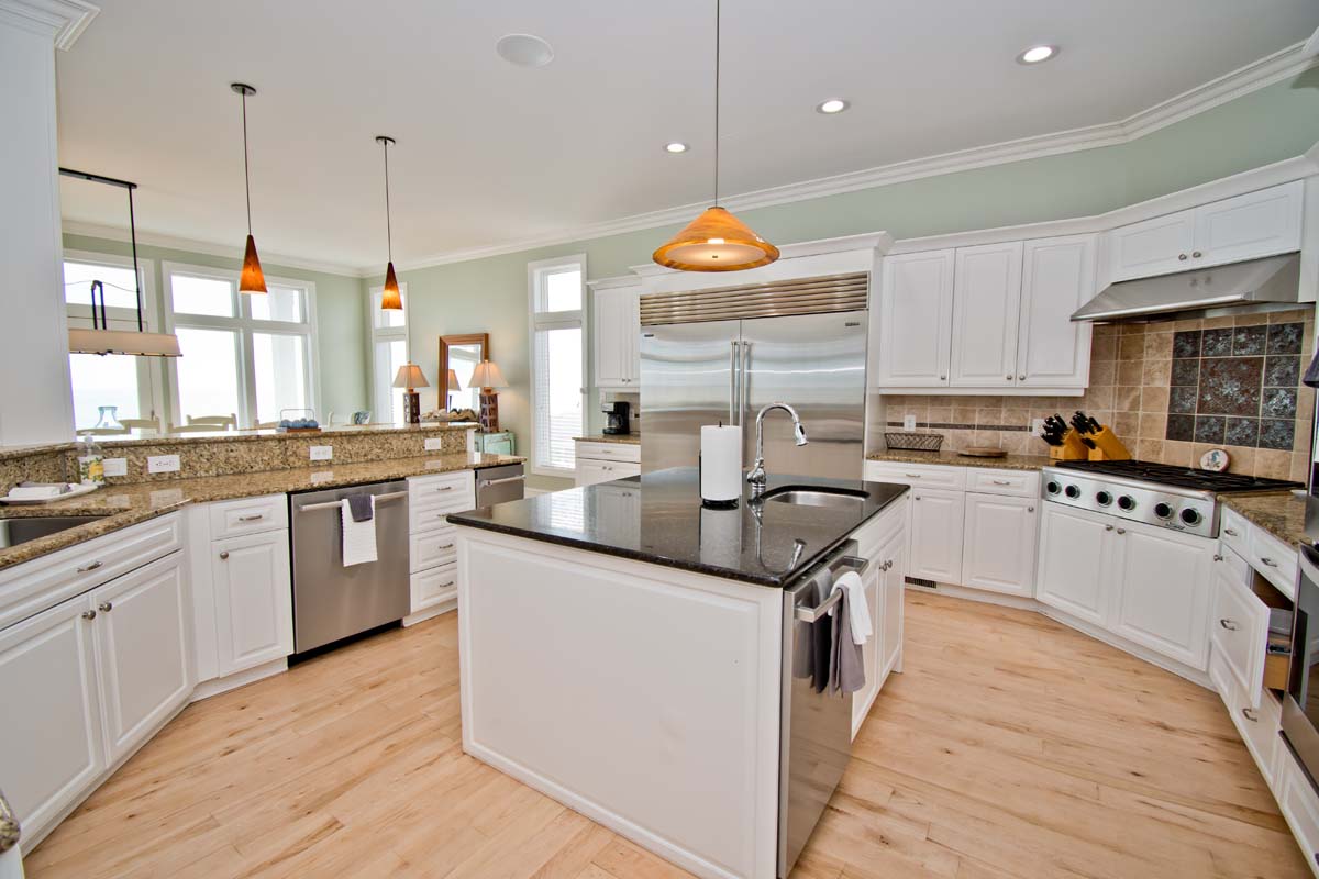 Level Two: The bright and open living area sits atop hardwood floors and boasts a gas fireplace, flat screen TV and opens to the oceanfront covered deck. The dining table seats twelve and the wrap around kitchen bar seats eight. The spacious gourmet kitchen is nothing short of well-equipped; Stainless steel appliances include a double wall oven, 2 dishwashers, 2 refrigerators and freezers, freestanding ice maker and wide granite countertops and island provide plenty of space to mix your favorite drink or whip together a fresh seafood dinner. Directly off the Kitchen is a Half Bathroom and Office area with an ocean view and cozy sofas. The first of 6 master suites is on this level. Bedroom #1 has a king size bed, private bath, flat screen TV, BluRay Player, Whirlpool Tub, stand alone shower and sweeping natural light. Bedroom #2 is also an oceanfront room with 2 twin bunks, private bathroom.