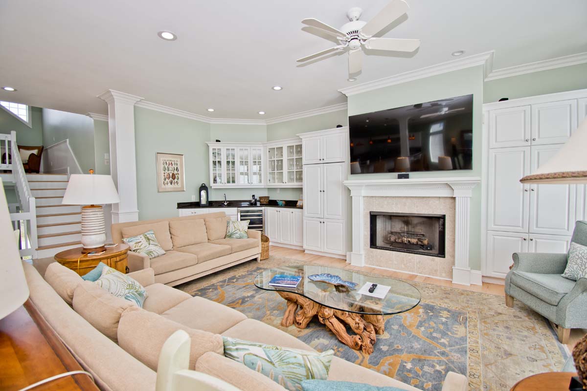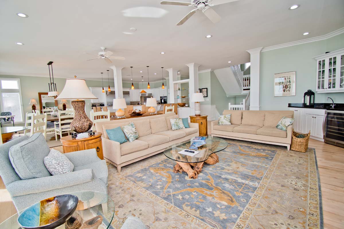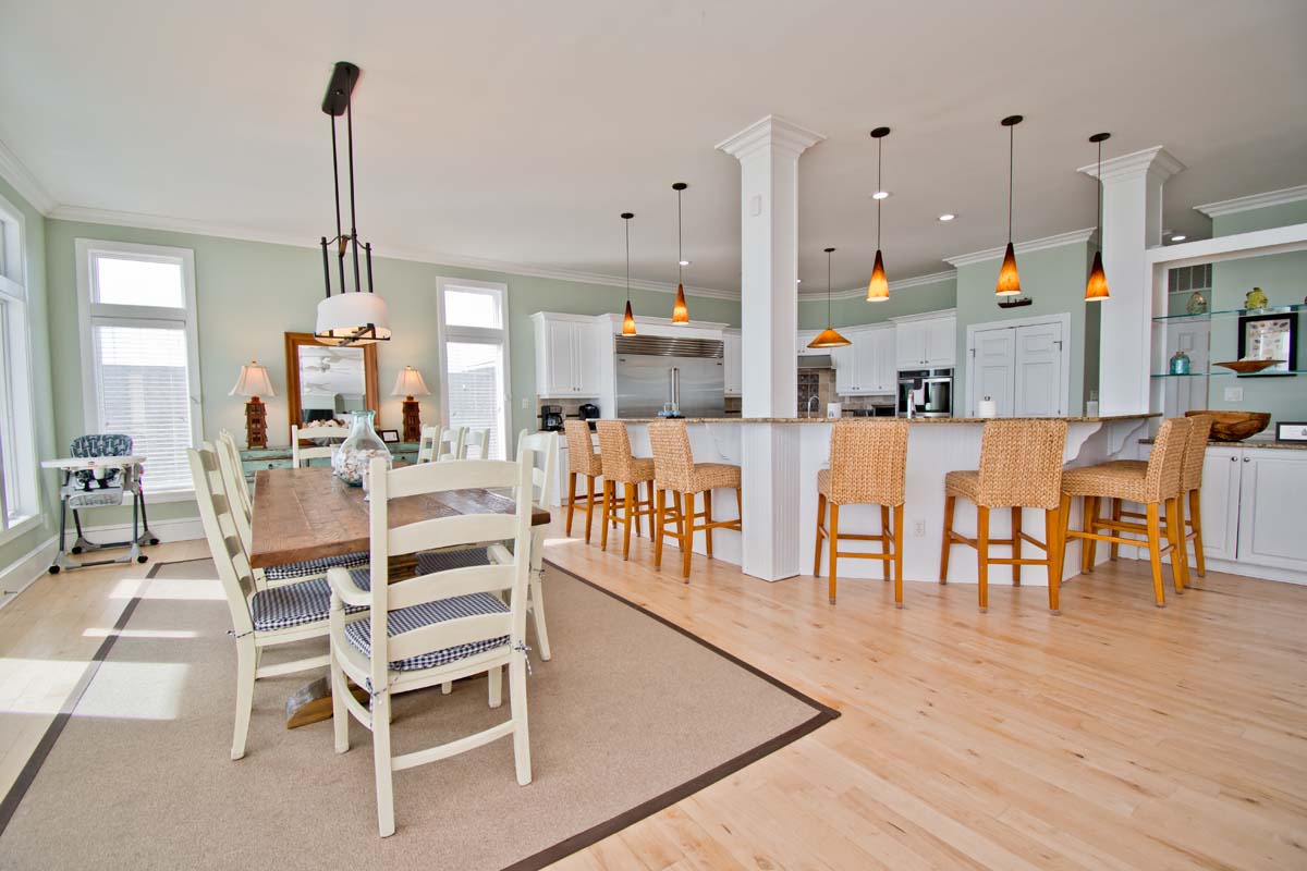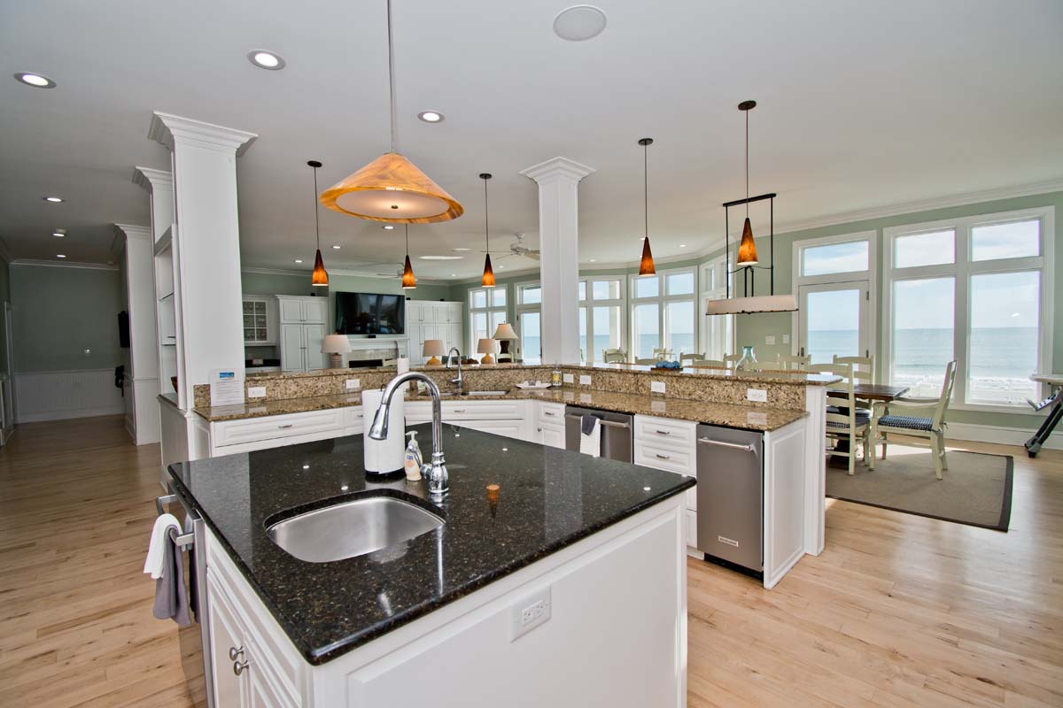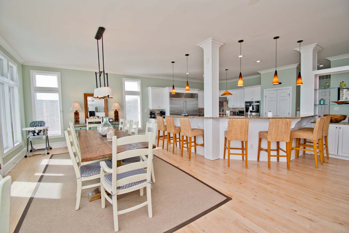 Level Two: The bright and open living area sits atop hardwood floors and boasts a gas fireplace, flat screen TV and opens to the oceanfront covered deck. The dining table seats twelve and the wrap around kitchen bar seats eight. The spacious gourmet kitchen is nothing short of well-equipped; Stainless steel appliances include a double wall oven, 2 dishwashers, 2 refrigerators and freezers, freestanding ice maker and wide granite countertops and island provide plenty of space to mix your favorite drink or whip together a fresh seafood dinner. Directly off the Kitchen is a Half Bathroom and Office area with an ocean view and cozy sofas. The first of 6 master suites is on this level. Bedroom #1 has a king size bed, private bath, flat screen TV, BluRay Player, Whirlpool Tub, stand alone shower and sweeping natural light. Bedroom #2 is also an oceanfront room with 2 twin bunks, private bathroom.
