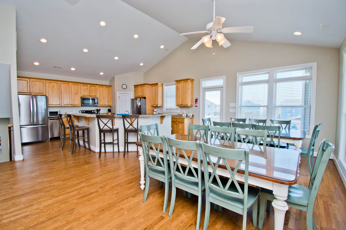 -Dining area: two tables with seating for sixteen, four bar stools and views of the ocean
