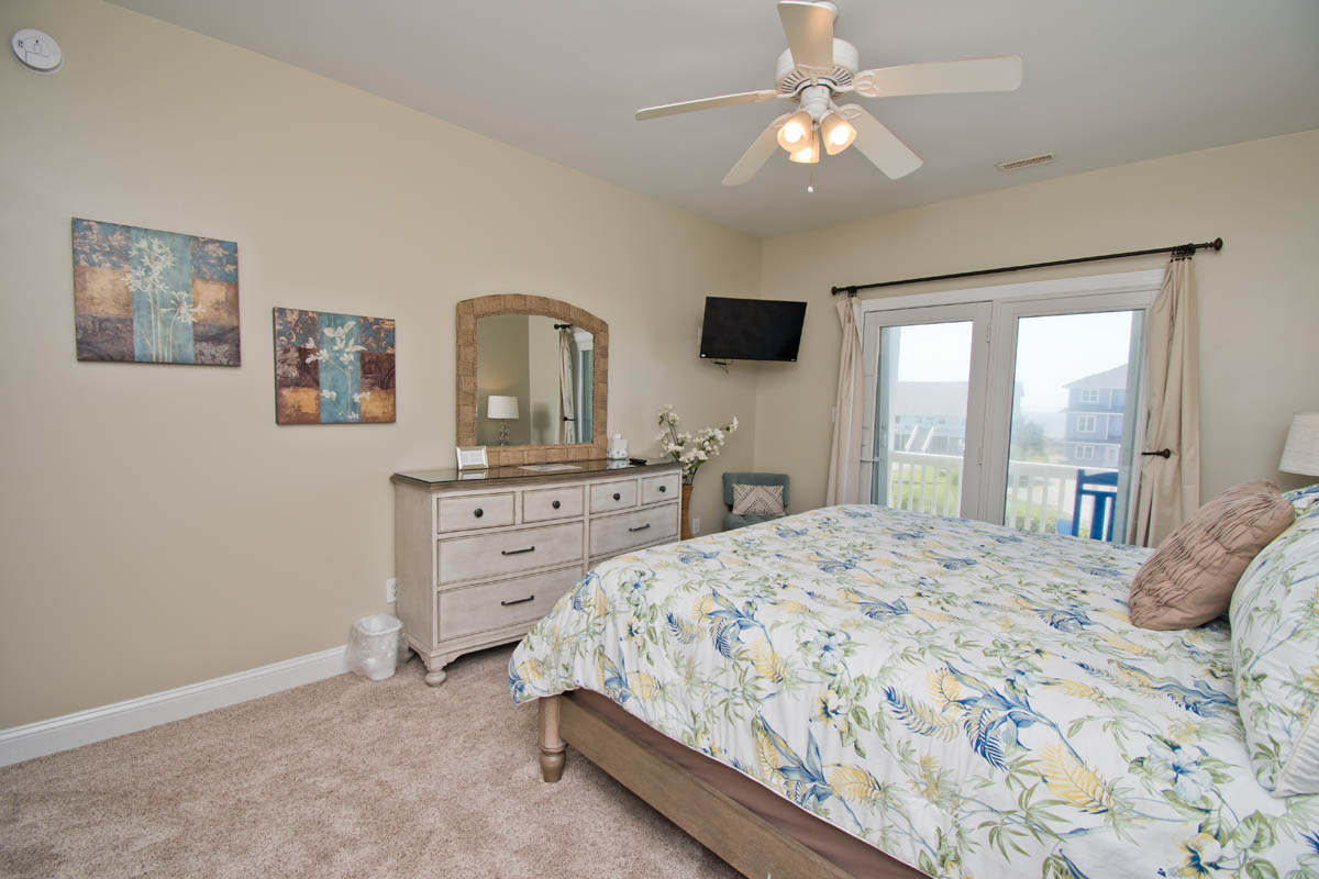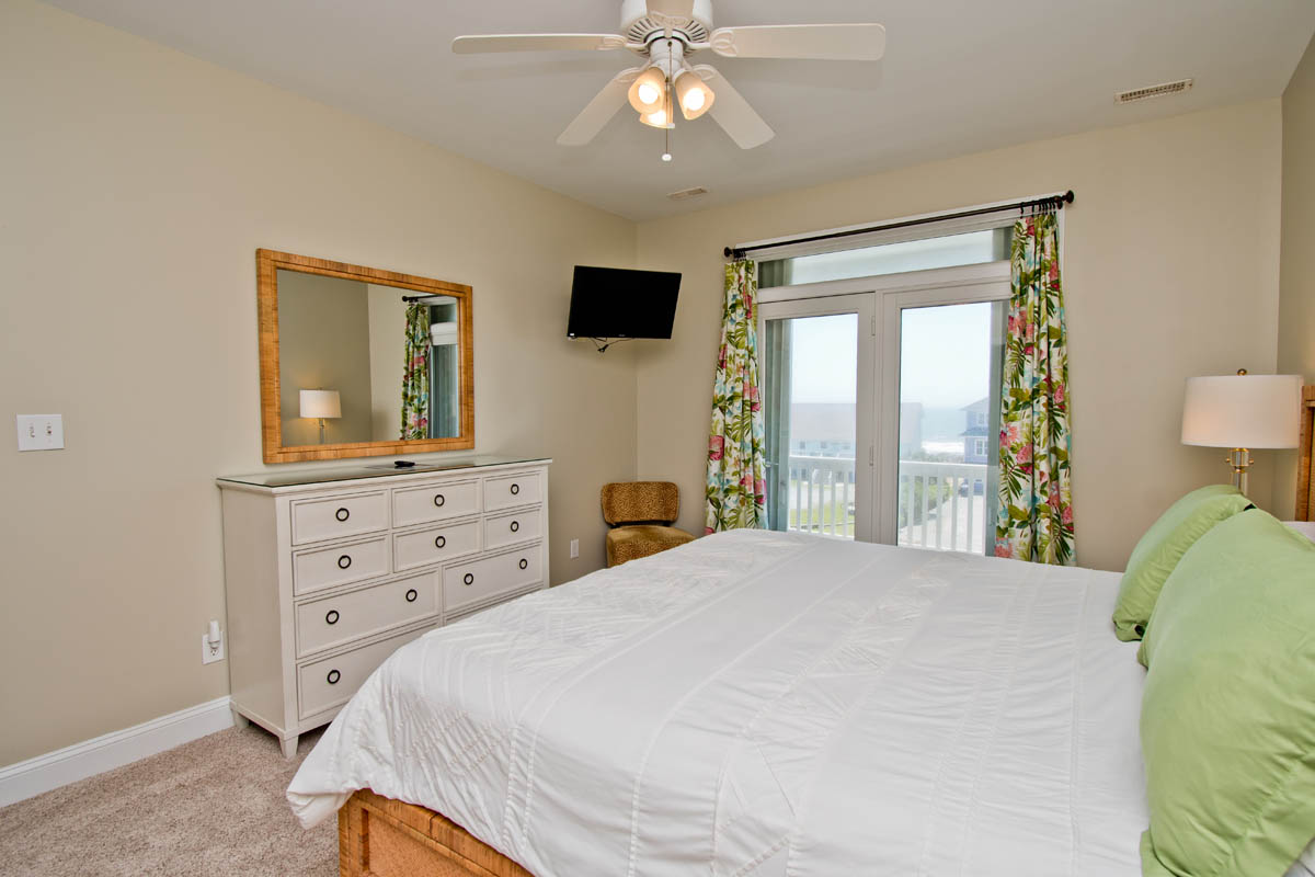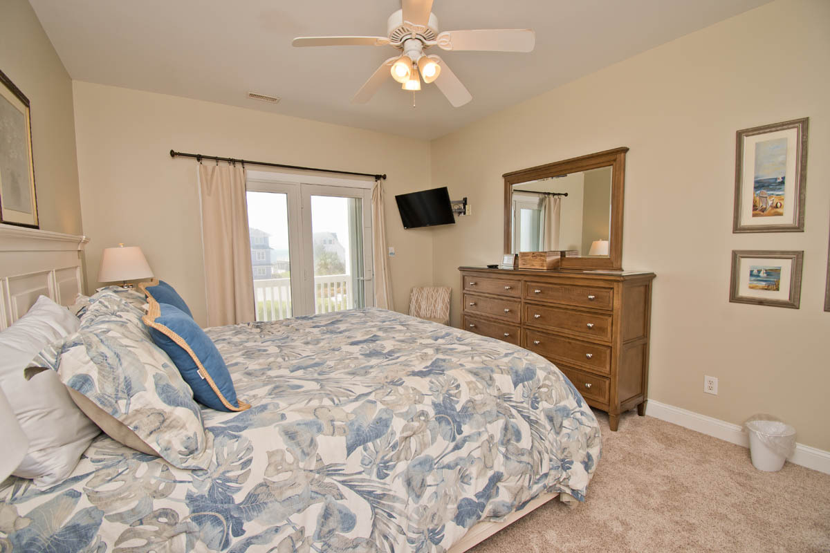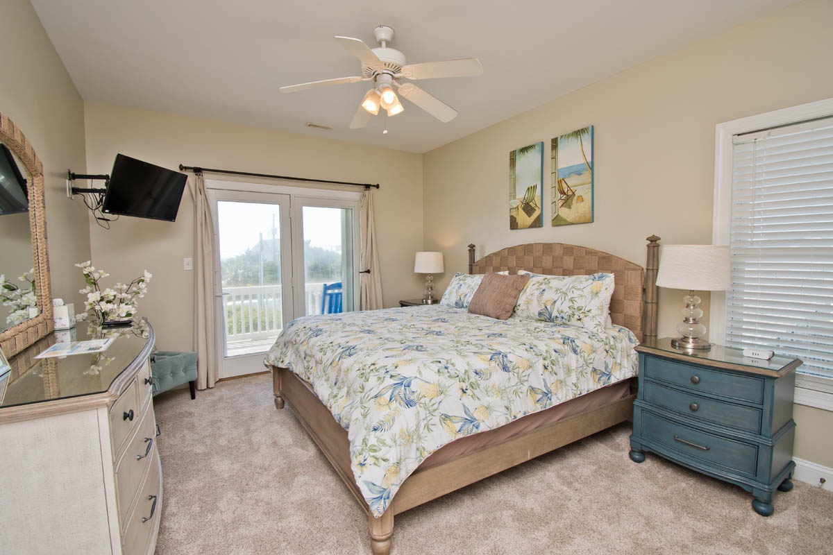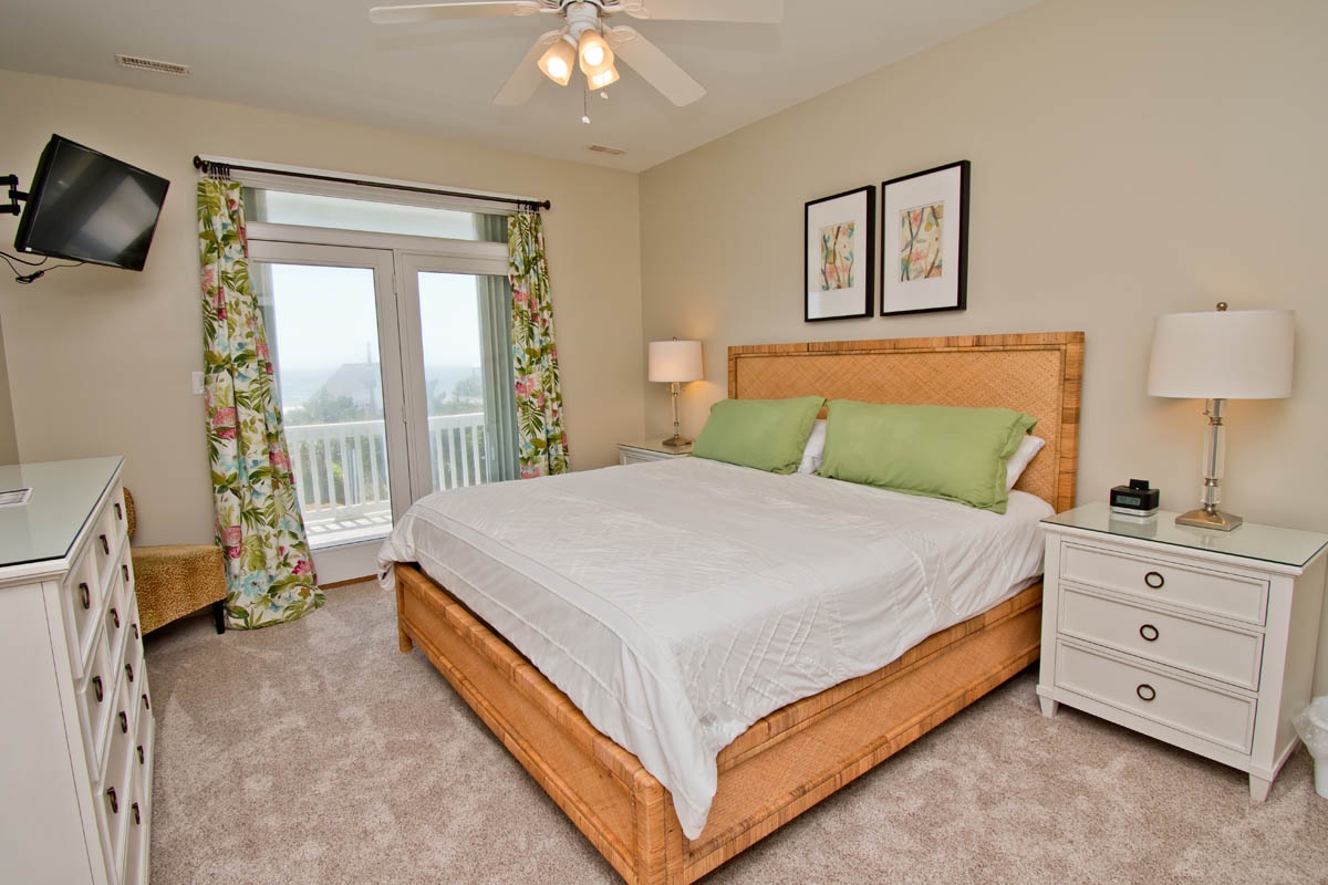 -Bedroom #7: ocean-side master suite with king bed, TV, jetted tub, separate shower, and direct access to the ocean-side deck