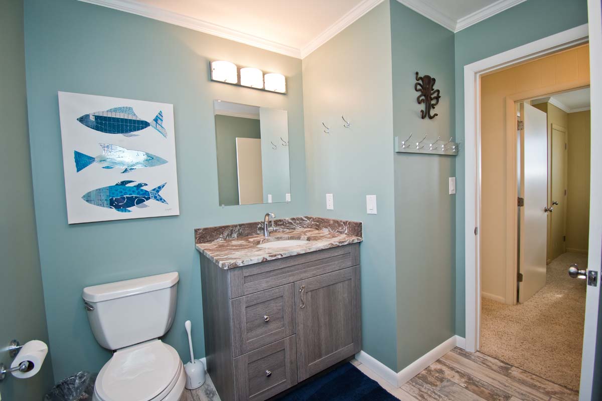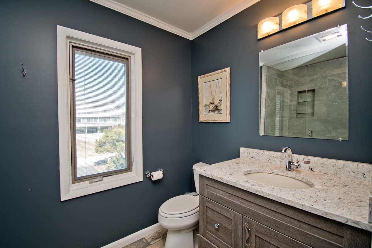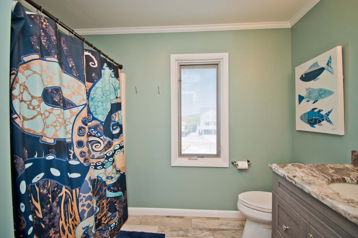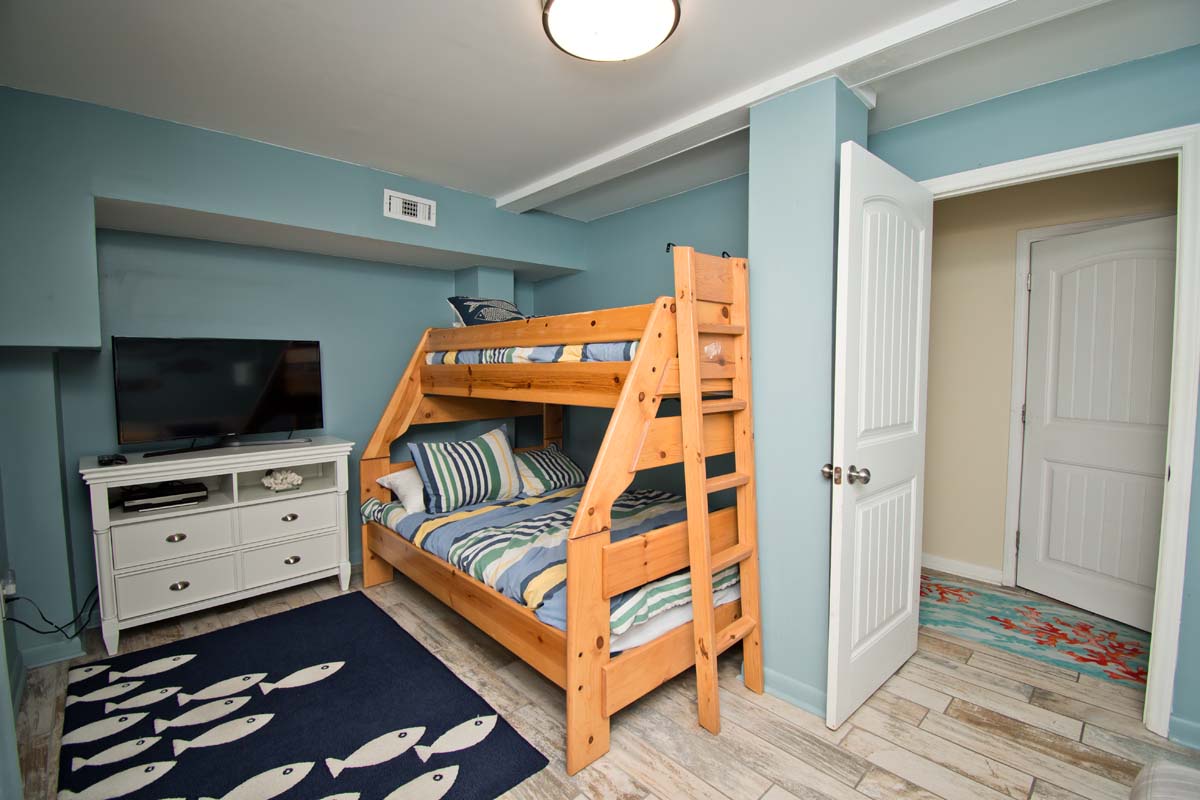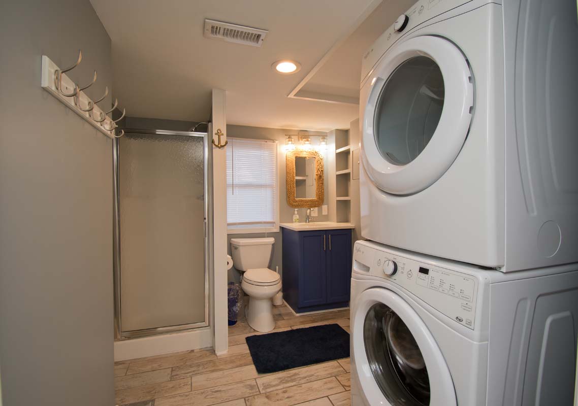 Ground Level: Enclosed Hot/Cold Outdoor Shower under deck. Bedroom #1 has a Twin/Double Bunk Set and Flat Screen TV. Laundry Room with a Washer/Dryer. There is also a full bath on this level.