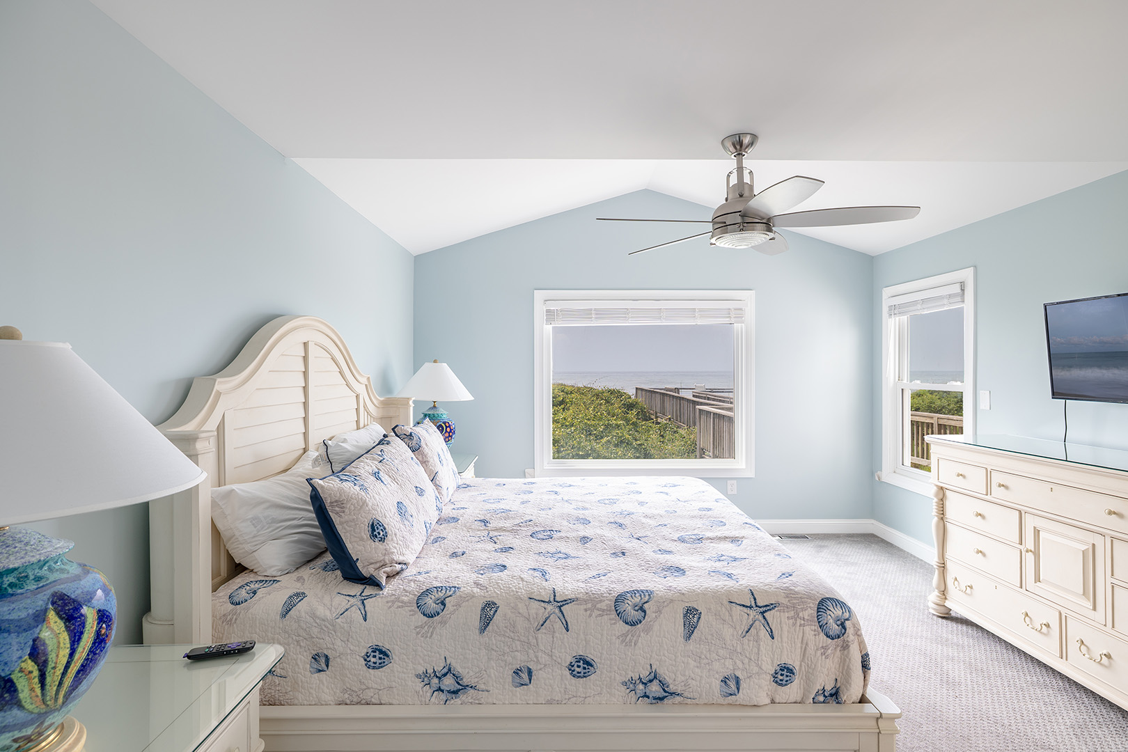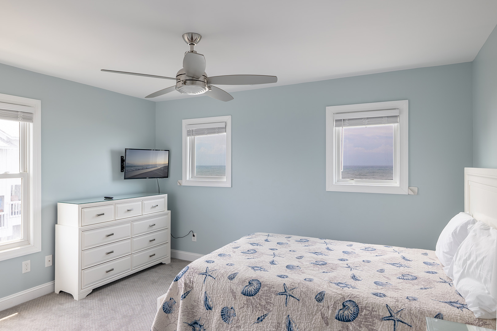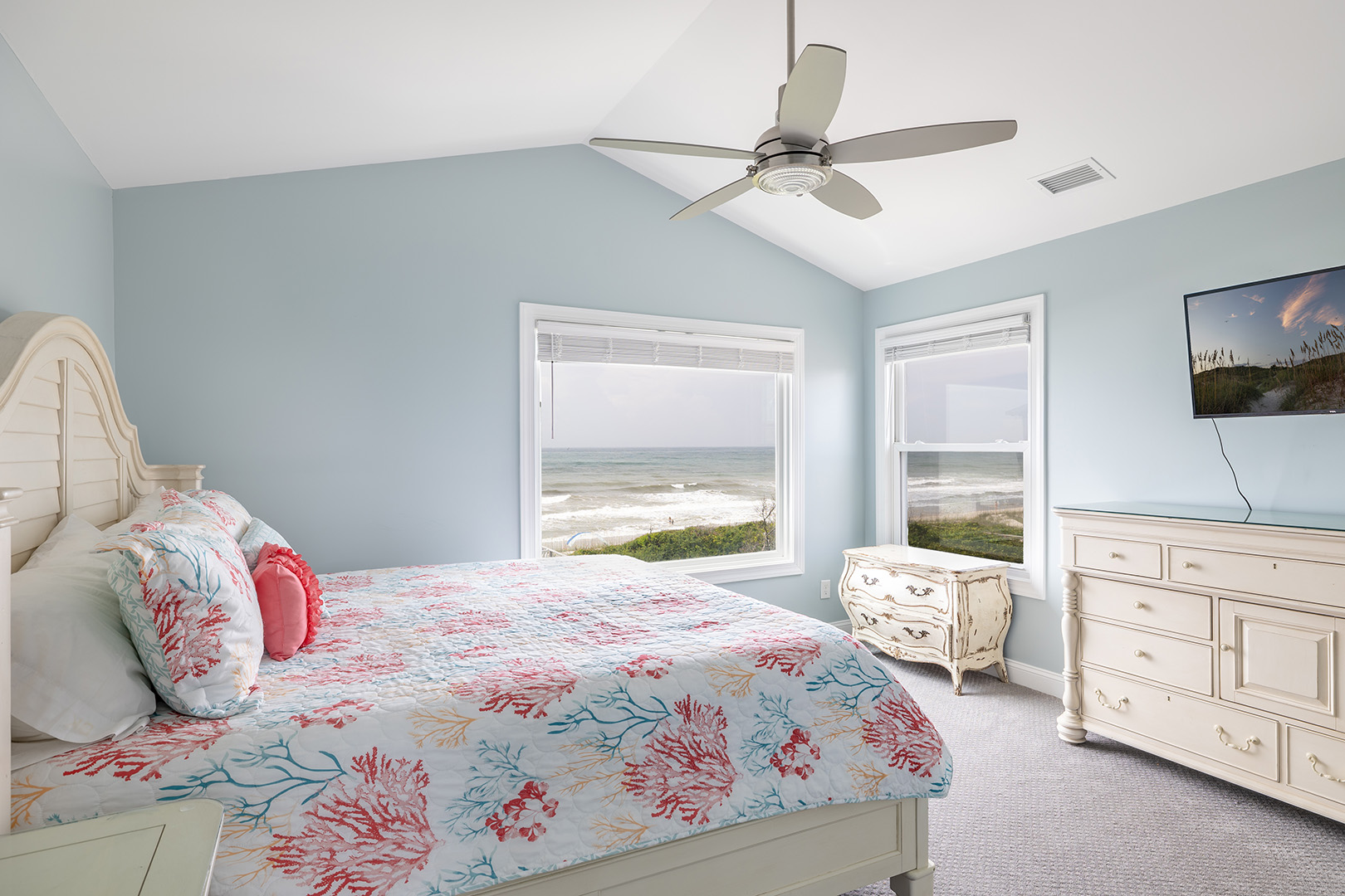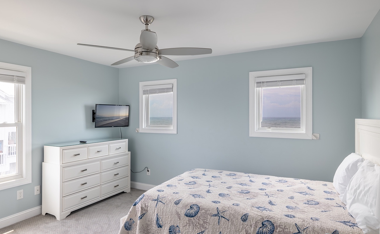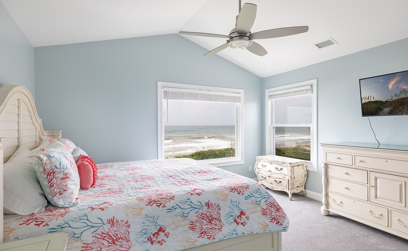 Upstairs, the second level offers three beautifully decorated bedrooms and two bathrooms. Bedroom #2 includes a king bed with panoramic ocean views, smart TV, and its own private bathroom, creating a peaceful retreat. Bedroom #3 offers a comfortable queen bed and smart TV, and shares a full bath with Bedroom #4, which features another king bed and smart TV ideal for families or groups traveling together.