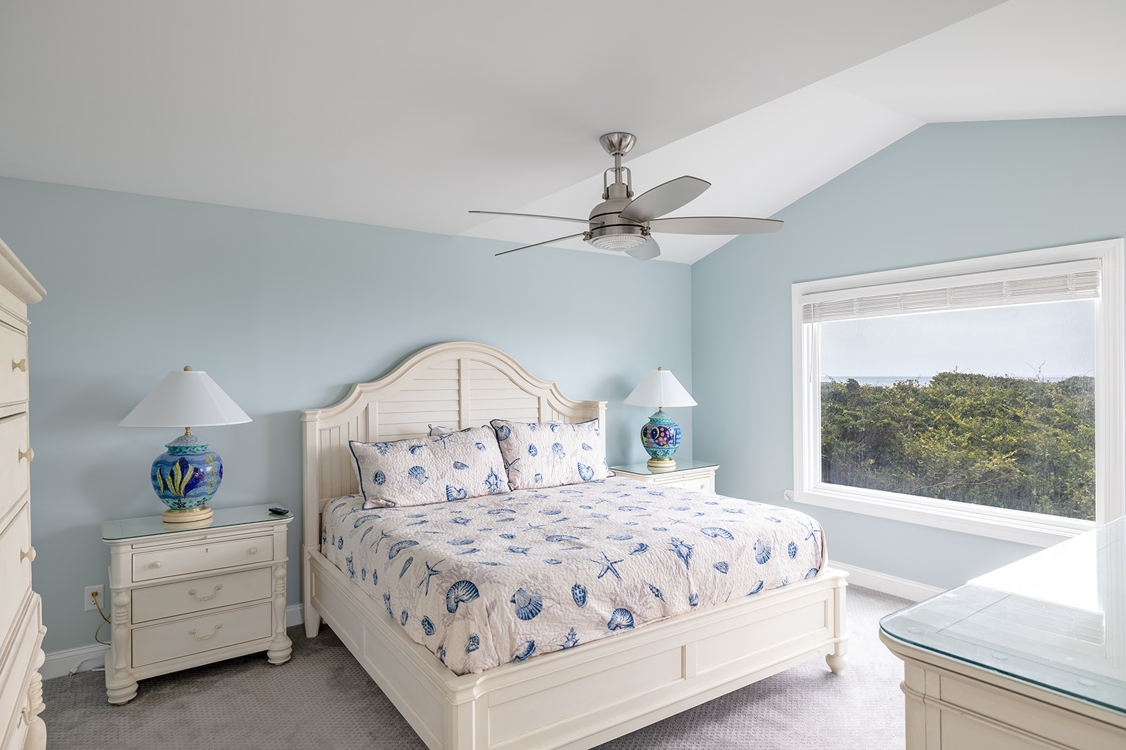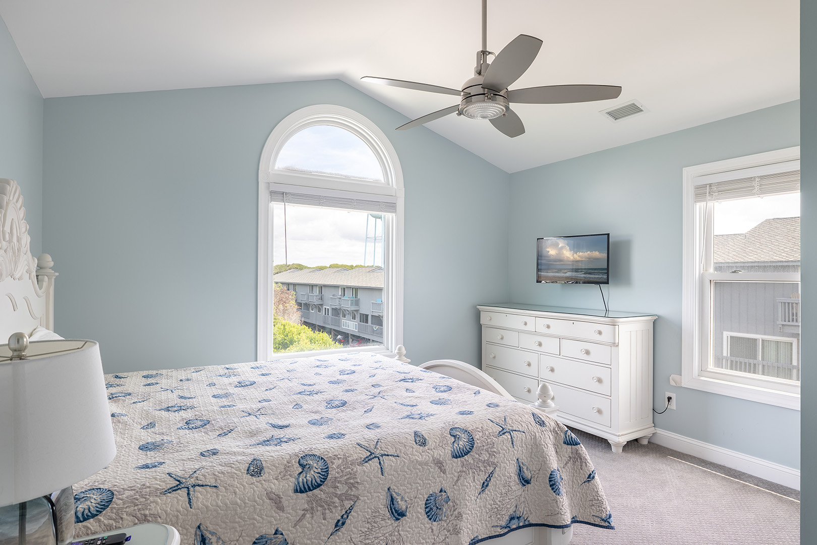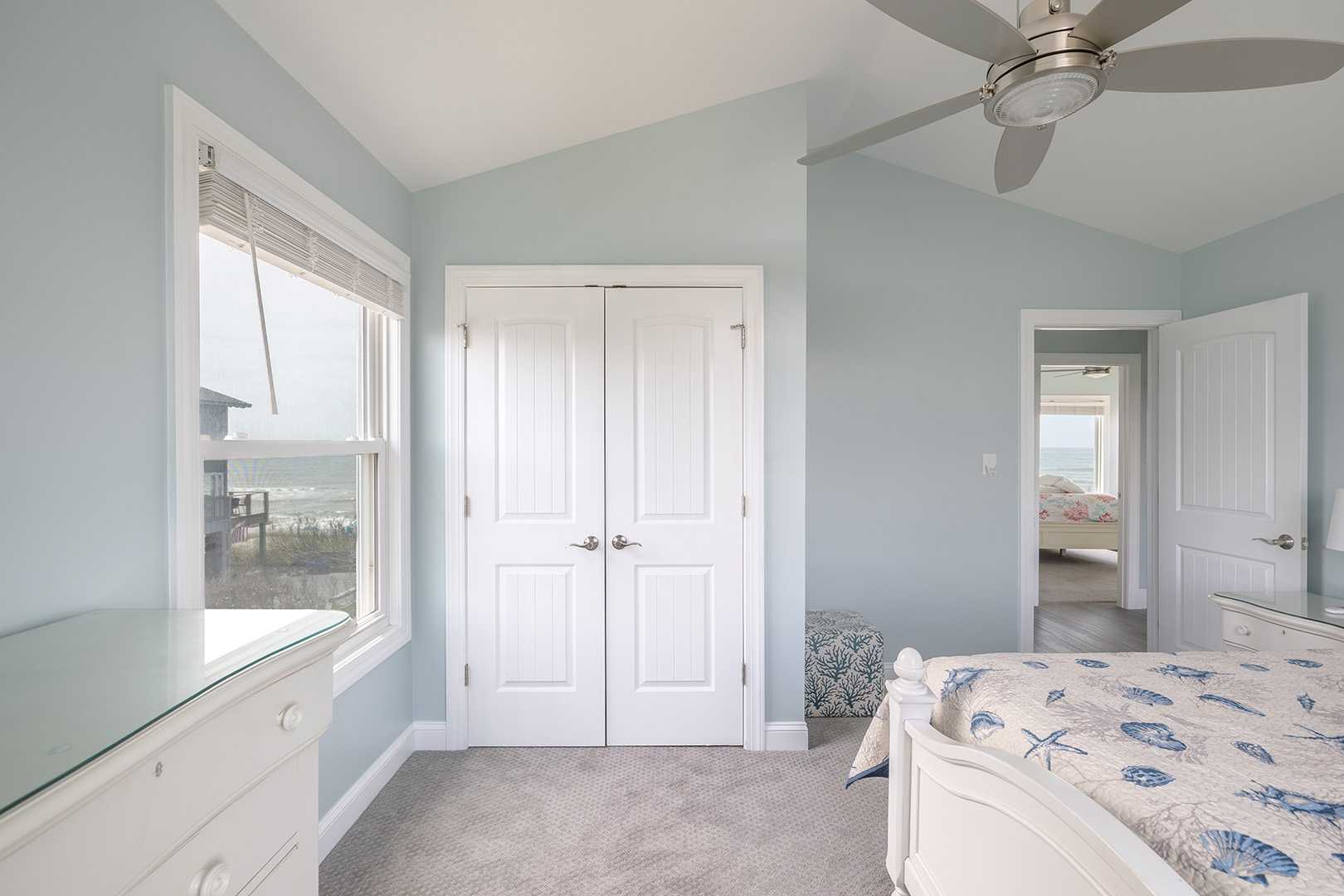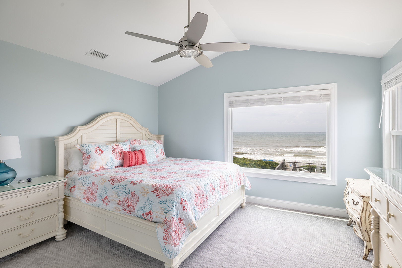 Upstairs, the second level offers three beautifully decorated bedrooms and two bathrooms. Bedroom #2 includes a king bed with panoramic ocean views, smart TV, and its own private bathroom, creating a peaceful retreat. Bedroom #3 offers a comfortable queen bed and smart TV, and shares a full bath with Bedroom #4, which features another king bed and smart TV ideal for families or groups traveling together.