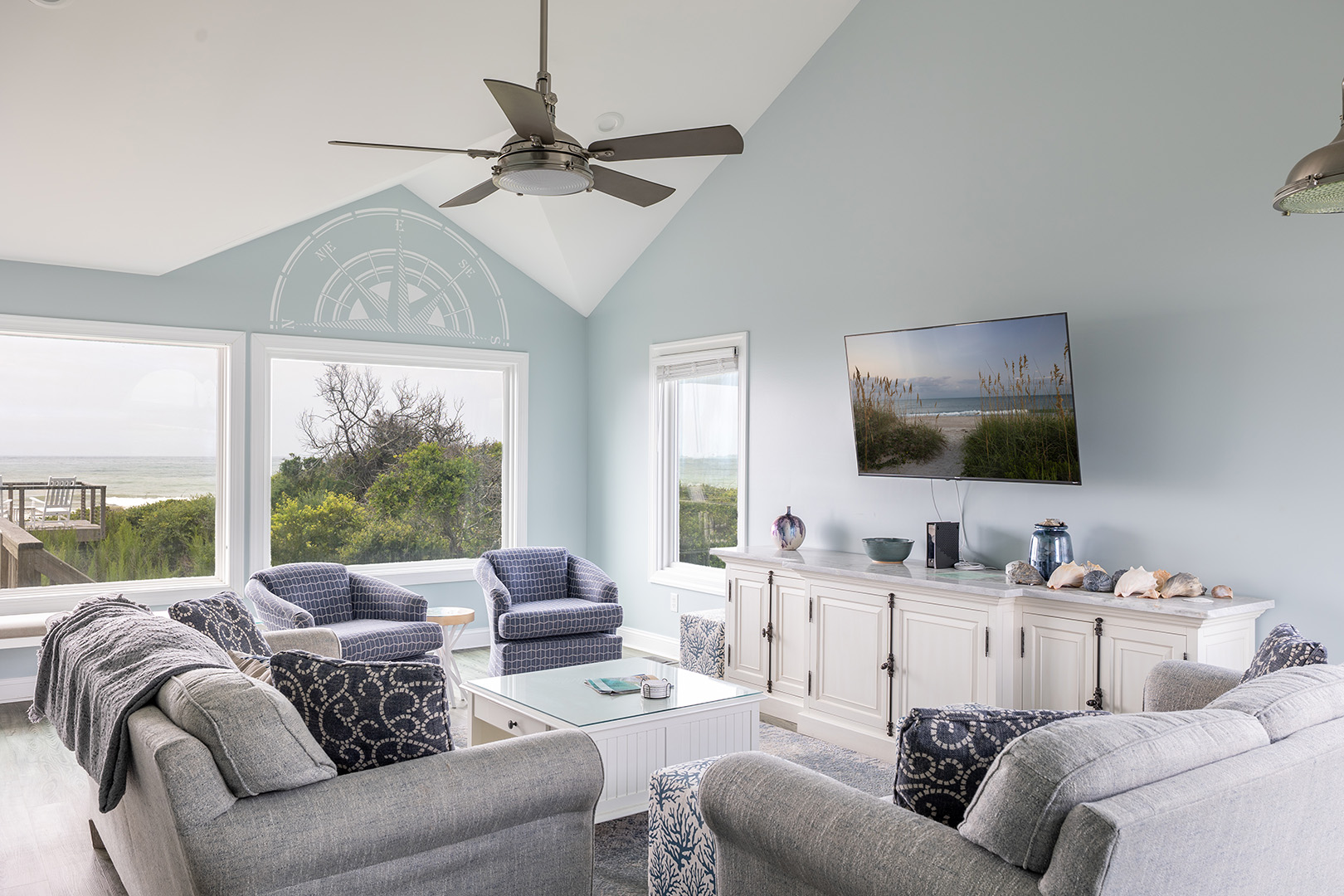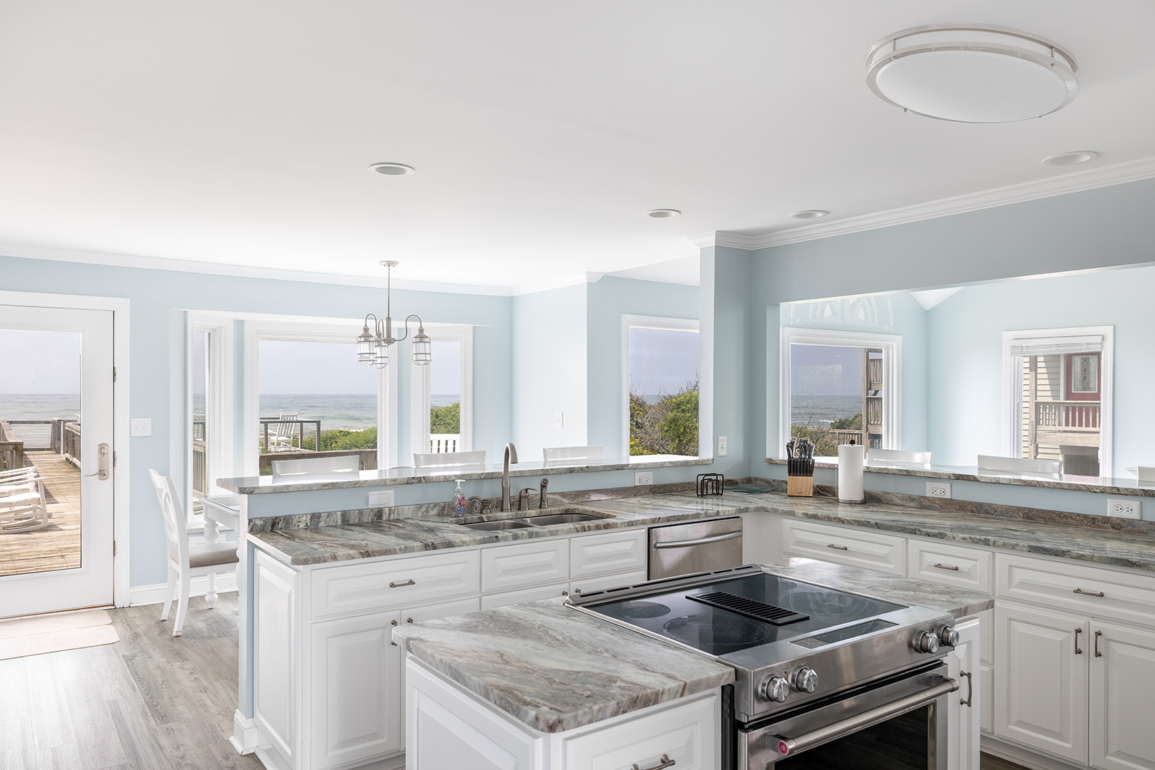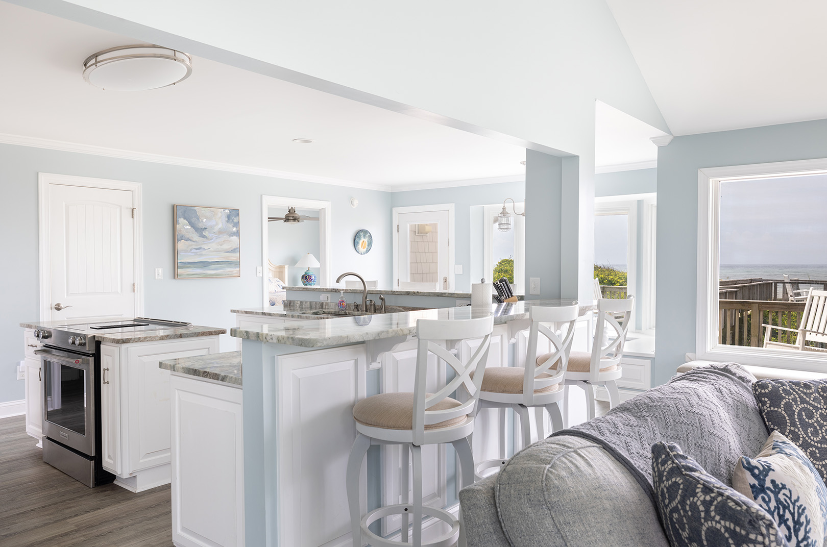 Step inside and feel your worries melt away. The first floor features an inviting open-concept living area, where panoramic ocean views greet you through expansive windows. On this level you will find the fully equipped, gourmet kitchen boasts stainless steel appliances, granite countertops, and a spacious island perfect for preparing meals and entertaining. Just beyond the living area, step onto your large oceanfront deck for savoring the sea breeze, dolphin and whale watching, and stunning sunrises and sunsets. Also on this level, you'll find a charming bonus room with a desk and a cozy daybed perfect for afternoon naps, reading, or extra sleeping space. Bedroom #1 features a king bed, smart TV, and a private bathroom, while a convenient half bath is also available for guests on this floor.