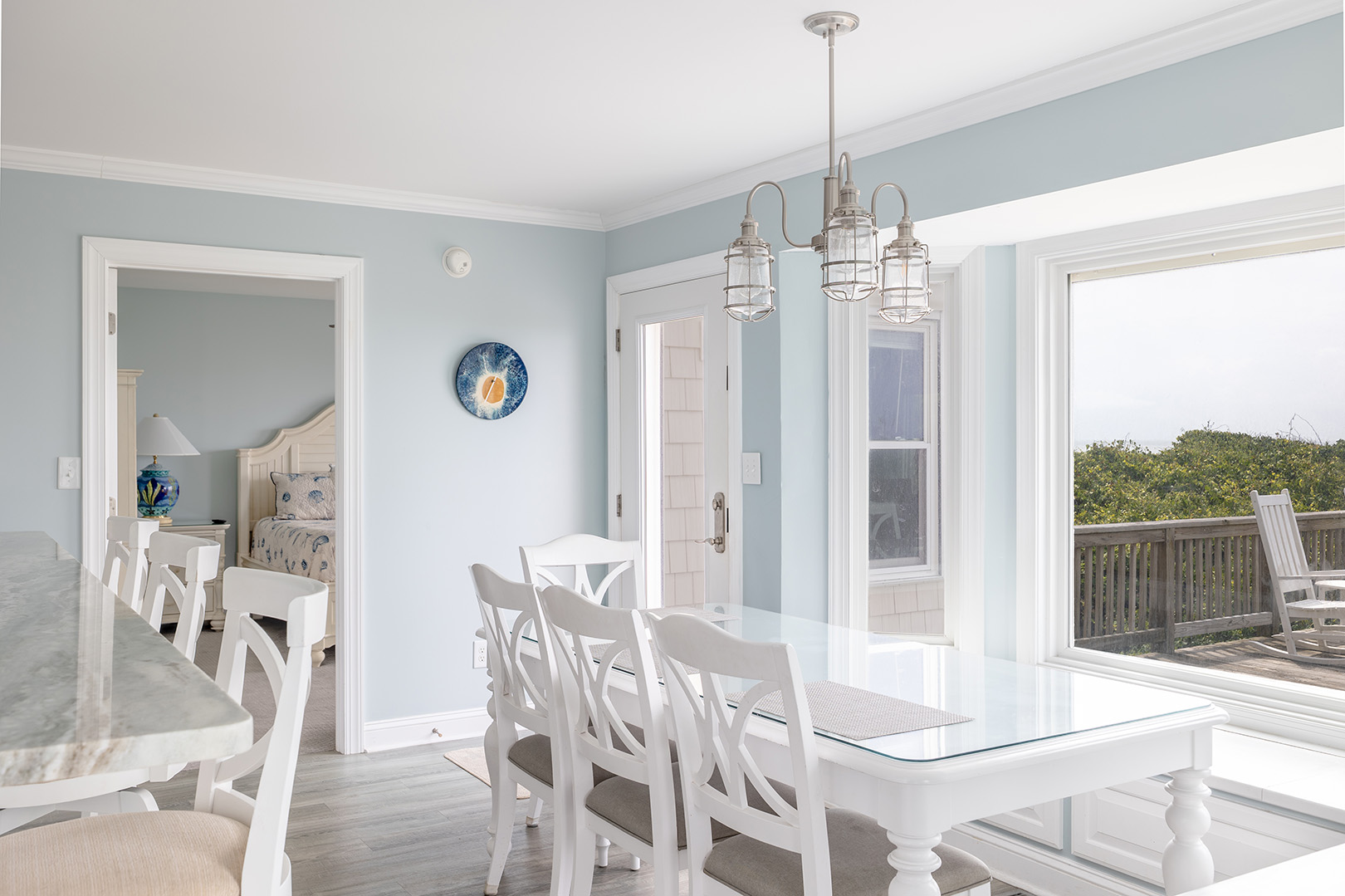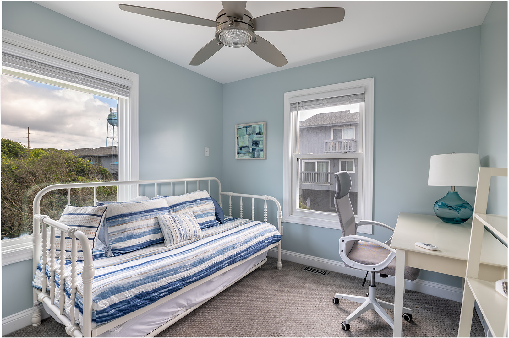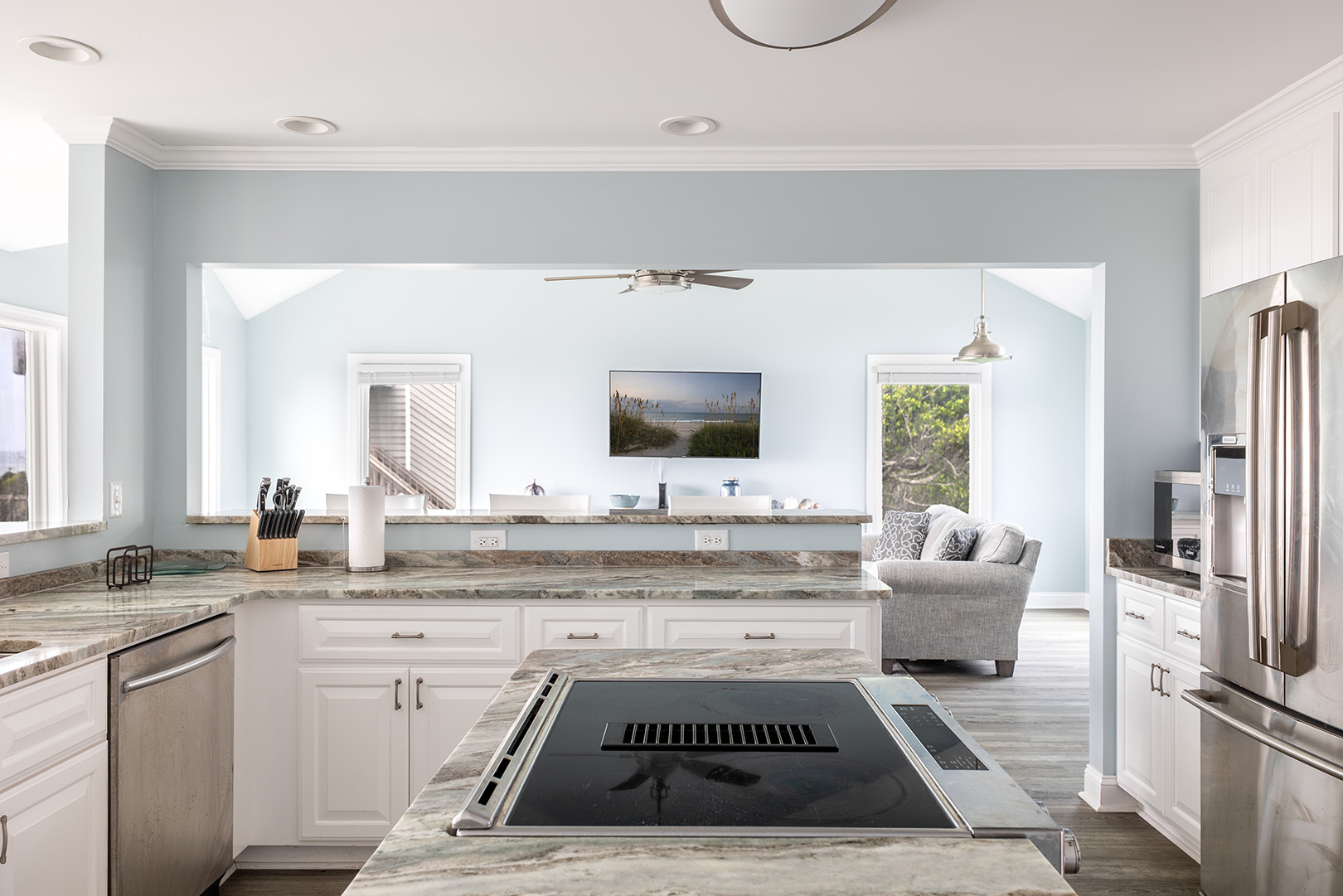 Step inside and feel your worries melt away. The first floor features an inviting open-concept living area, where panoramic ocean views greet you through expansive windows. On this level you will find the fully equipped, gourmet kitchen boasts stainless steel appliances, granite countertops, and a spacious island perfect for preparing meals and entertaining. Just beyond the living area, step onto your large oceanfront deck for savoring the sea breeze, dolphin and whale watching, and stunning sunrises and sunsets. Also on this level, you'll find a charming bonus room with a desk and a cozy daybed perfect for afternoon naps, reading, or extra sleeping space. Bedroom #1 features a king bed, smart TV, and a private bathroom, while a convenient half bath is also available for guests on this floor.
