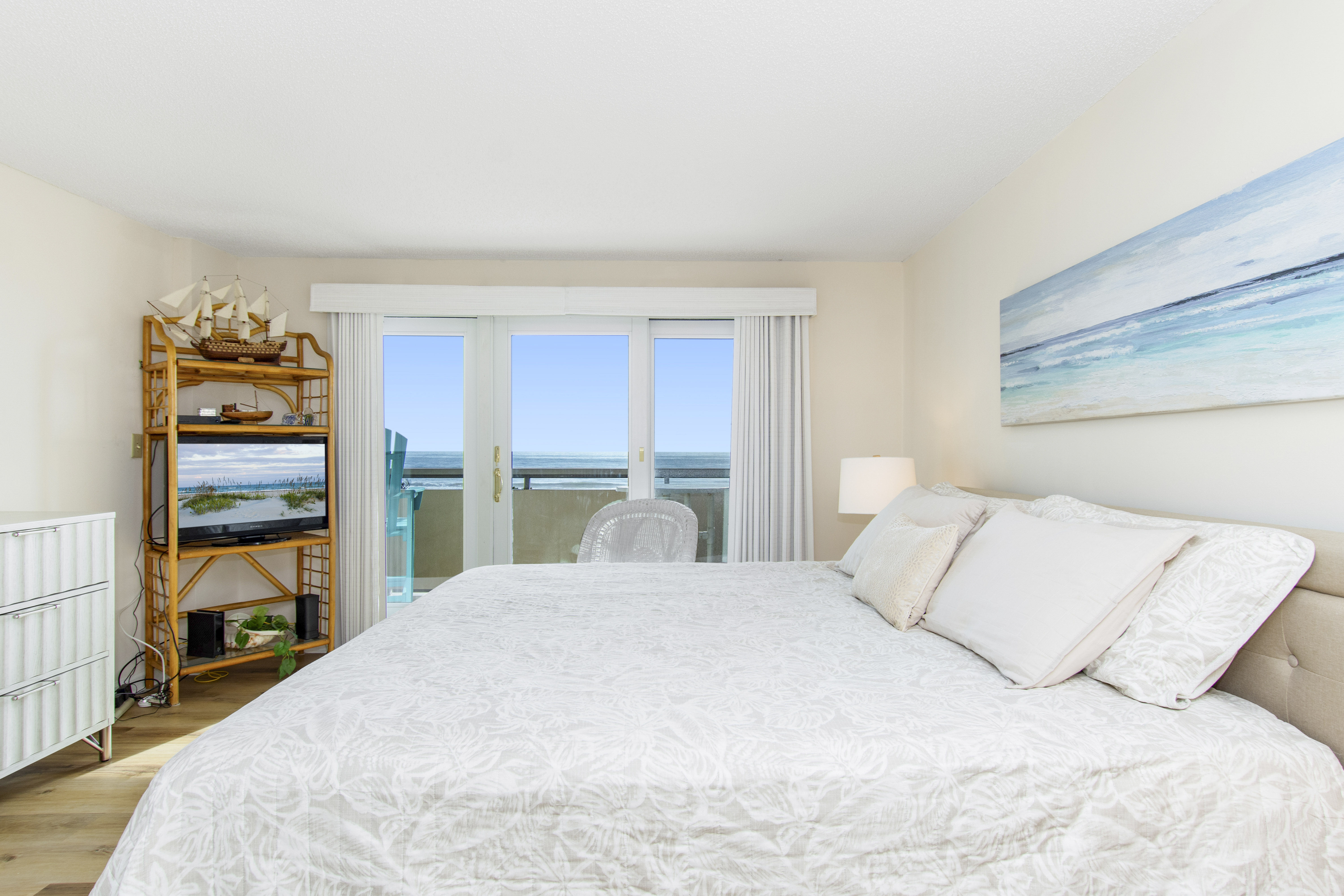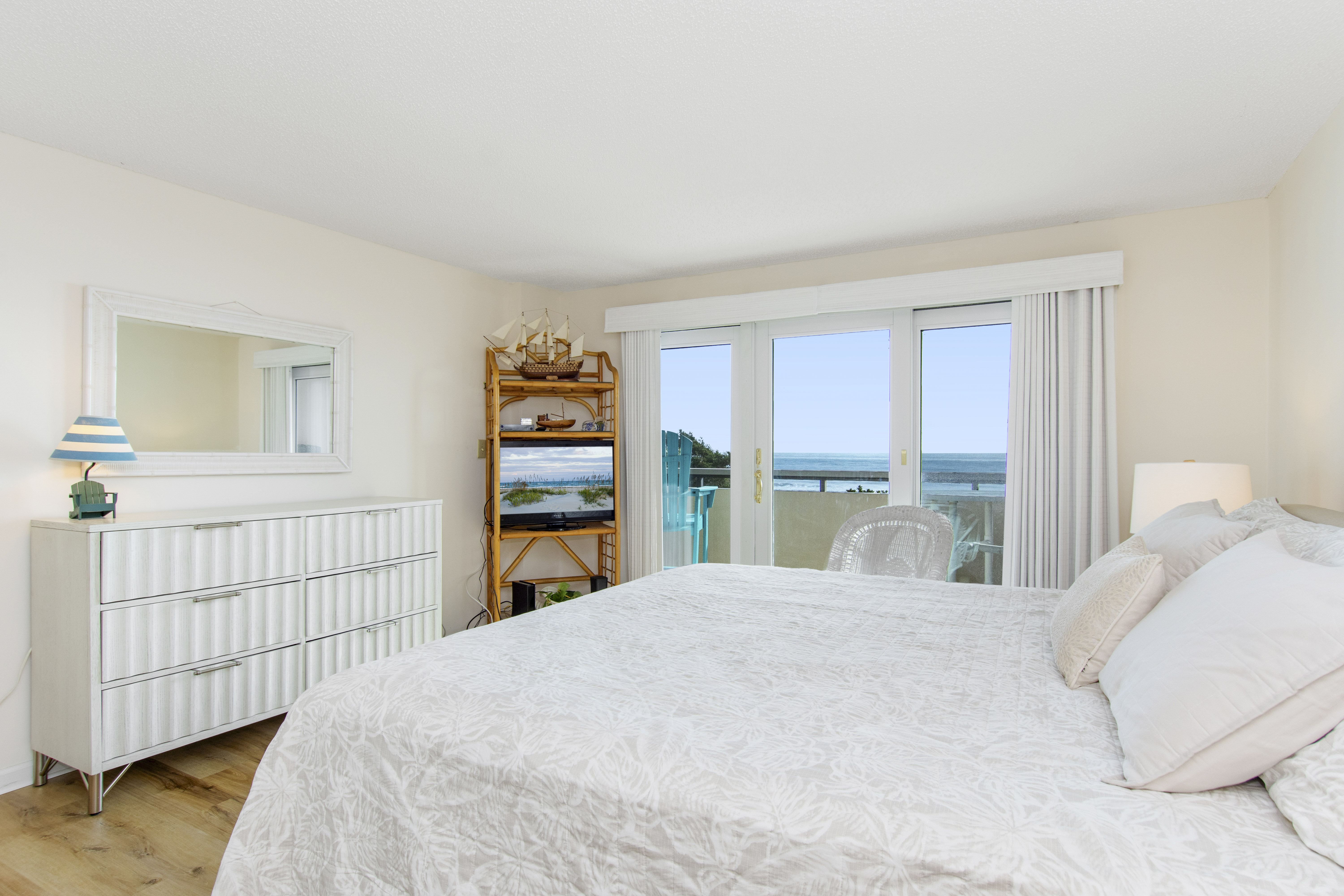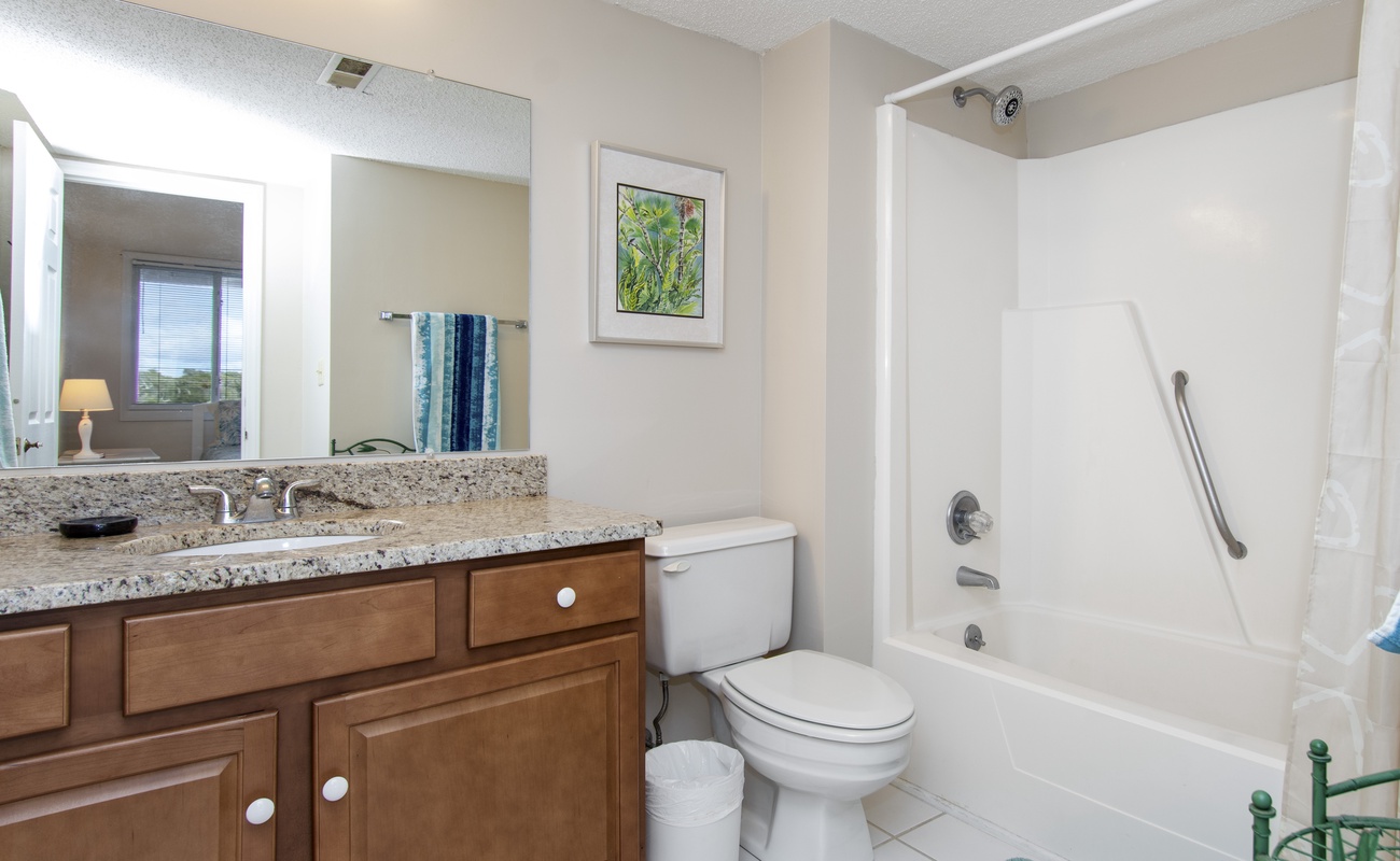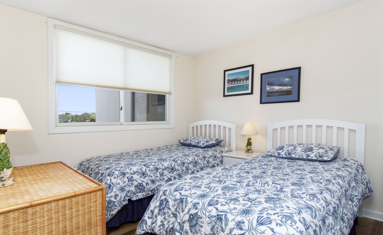Beachwalk 202 is a bright and beachy, second floor, Oceanfront condo, surrounded by lush foliage. Bedroom #1 has a King Bed, TV, Balcony Access, and a Private Bathroom. Bedroom #2 has a Double Bed, with private bath. Bedroom #3 has 2 Twin Beds, and a Private Bathroom. High Speed Wireless Internet Access Provided!