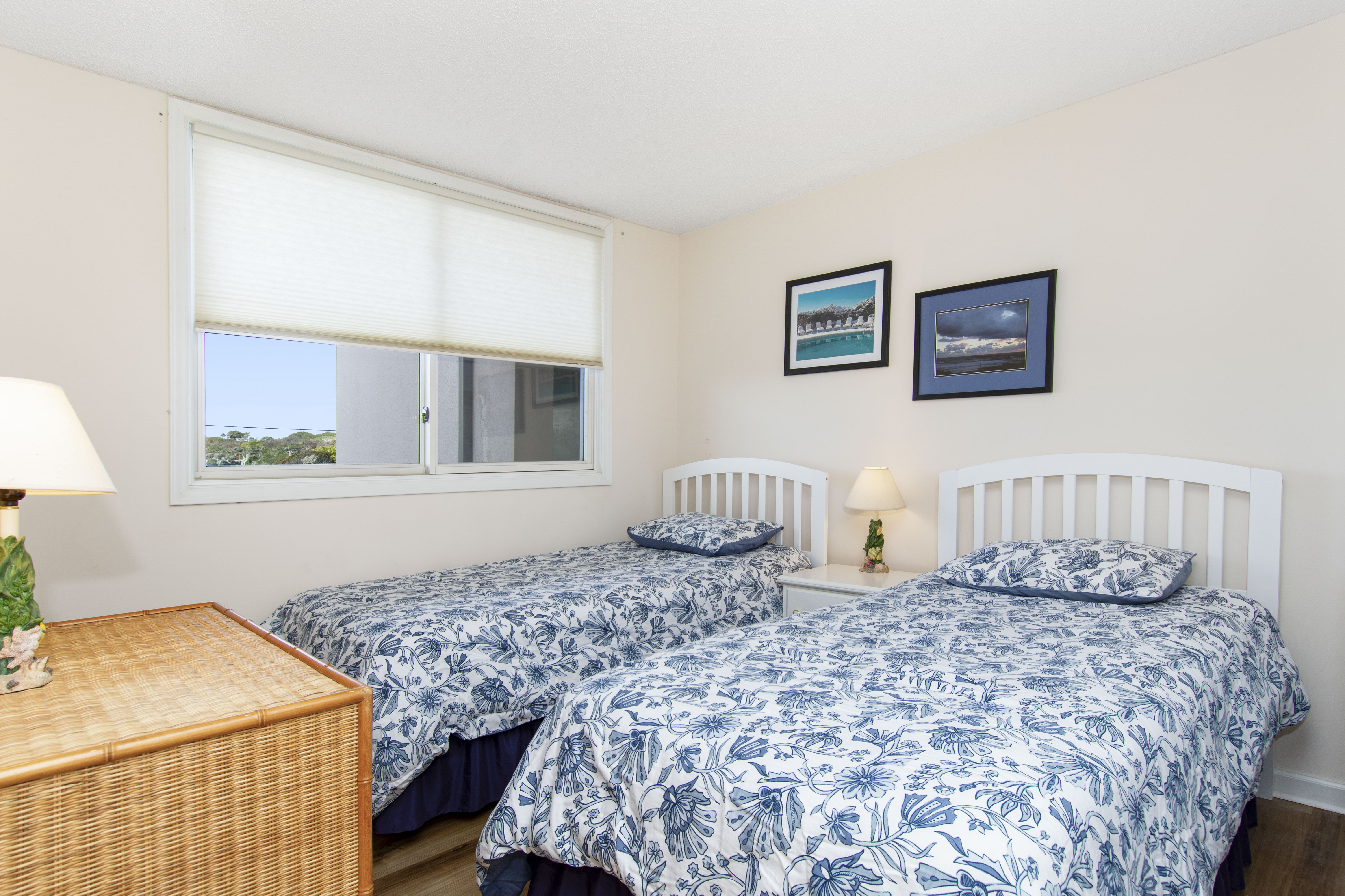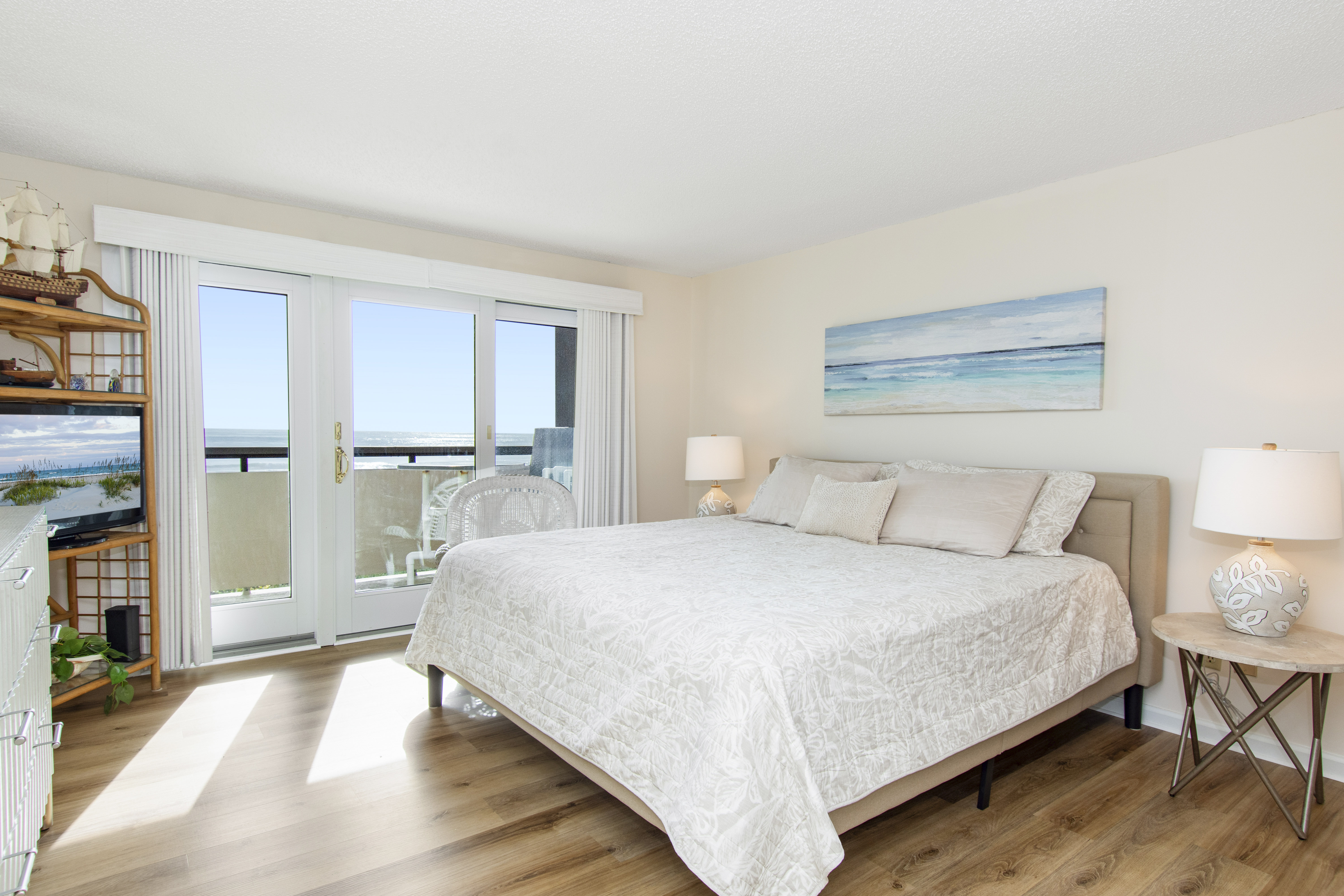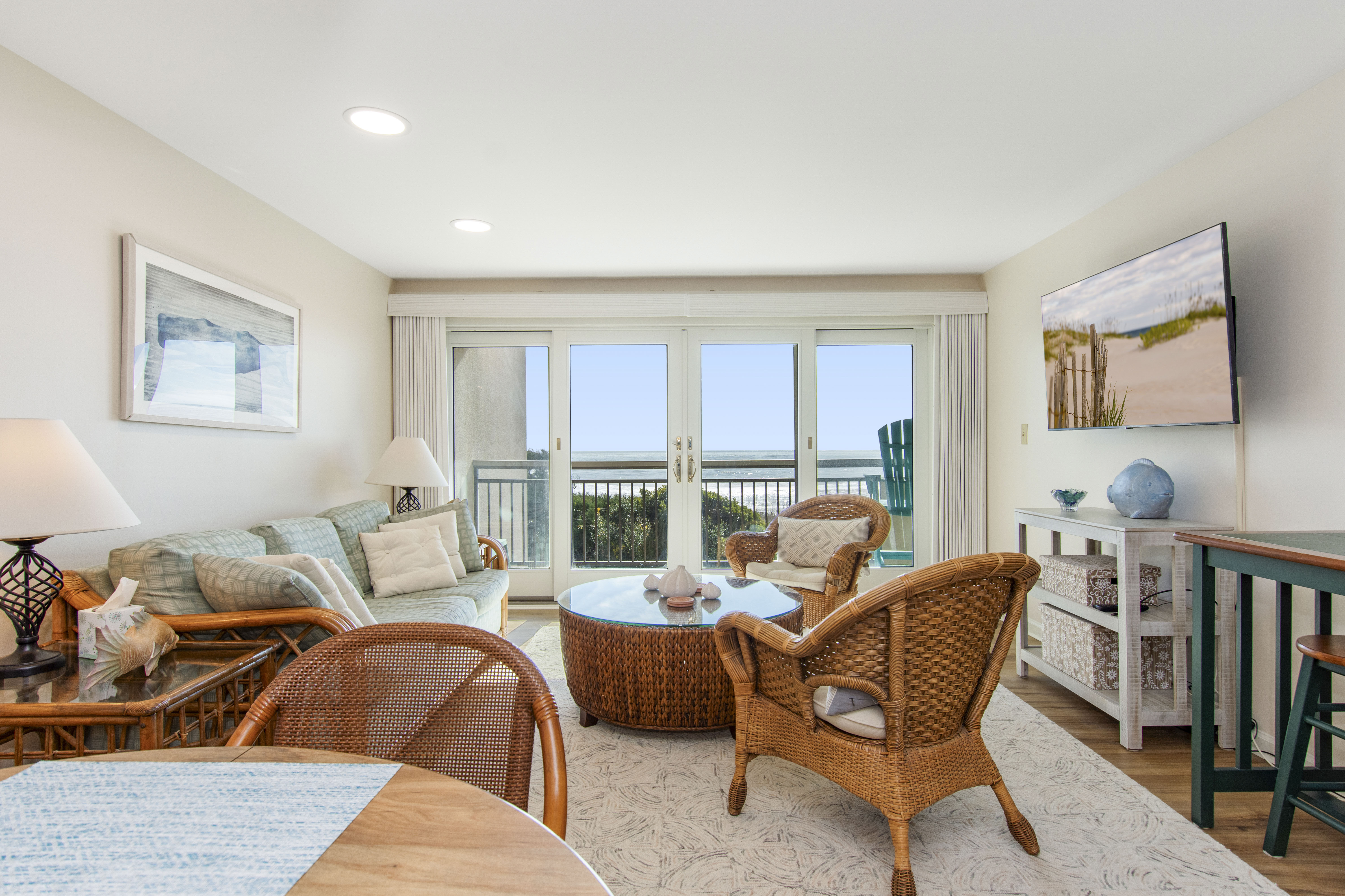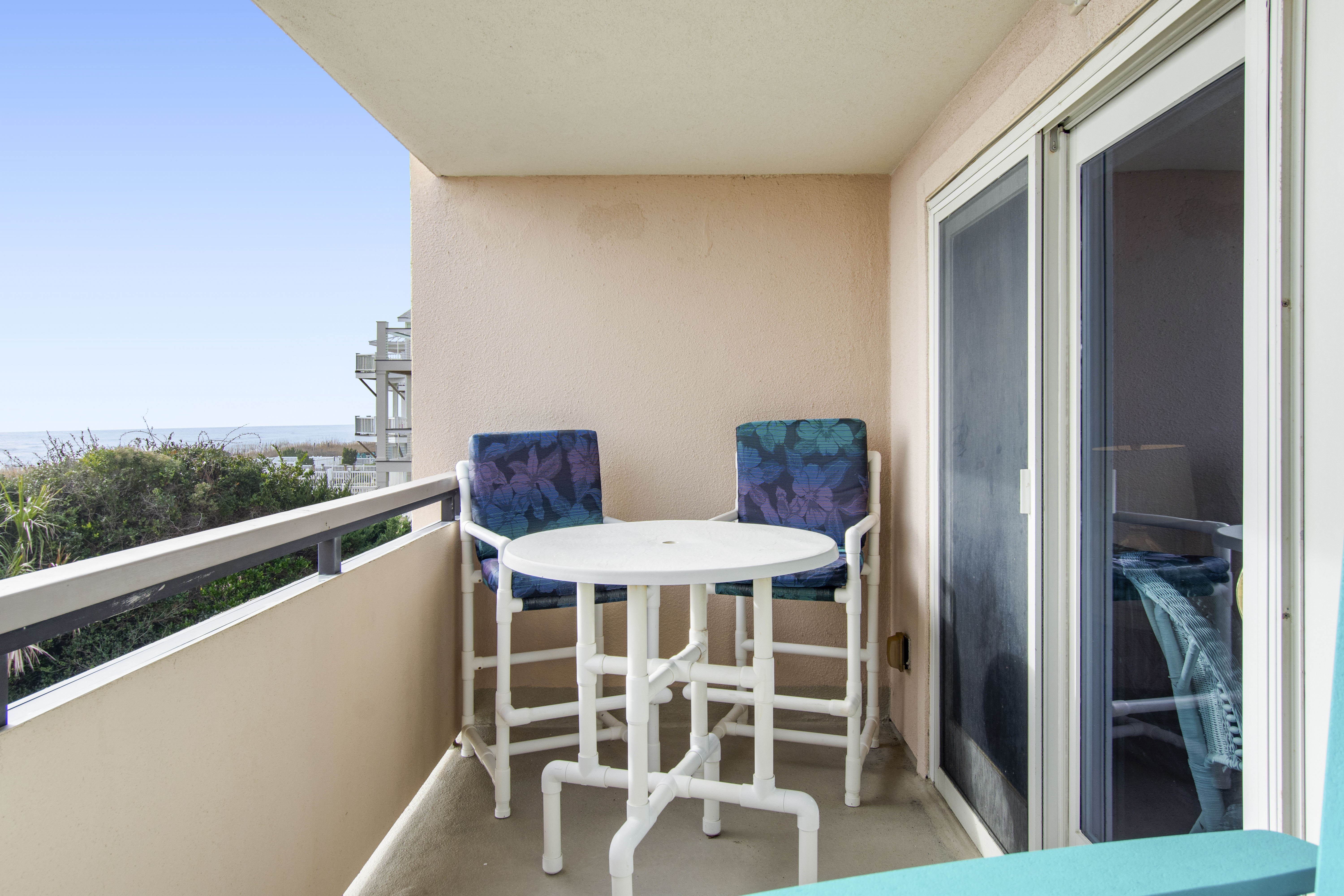 Beachwalk 202 is a bright and beachy, second floor, Oceanfront condo, surrounded by lush foliage. Bedroom #1 has a King Bed, TV, Balcony Access, and a Private Bathroom. Bedroom #2 has a Double Bed, with private bath. Bedroom #3 has 2 Twin Beds, and a Private Bathroom. High Speed Wireless Internet Access Provided!