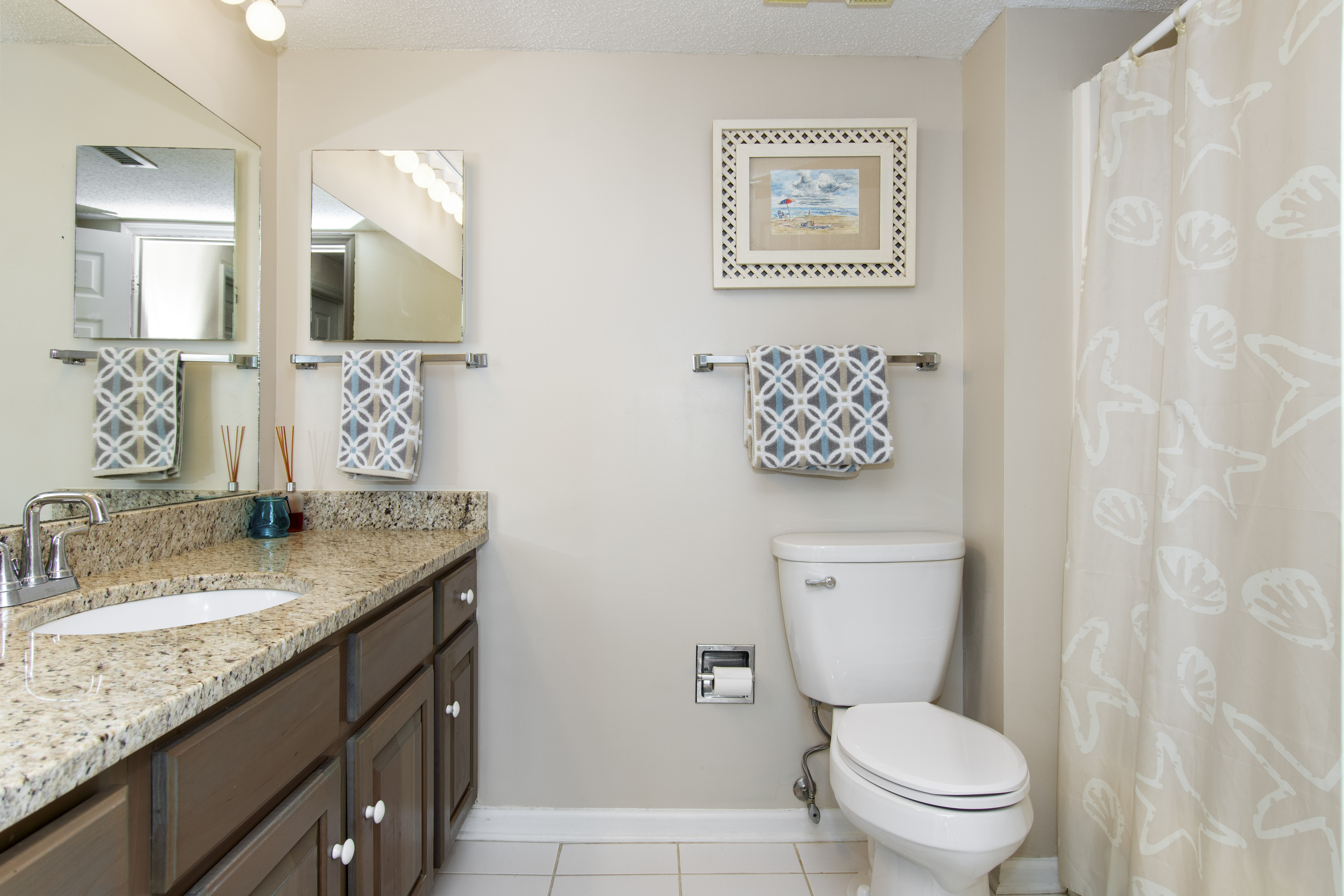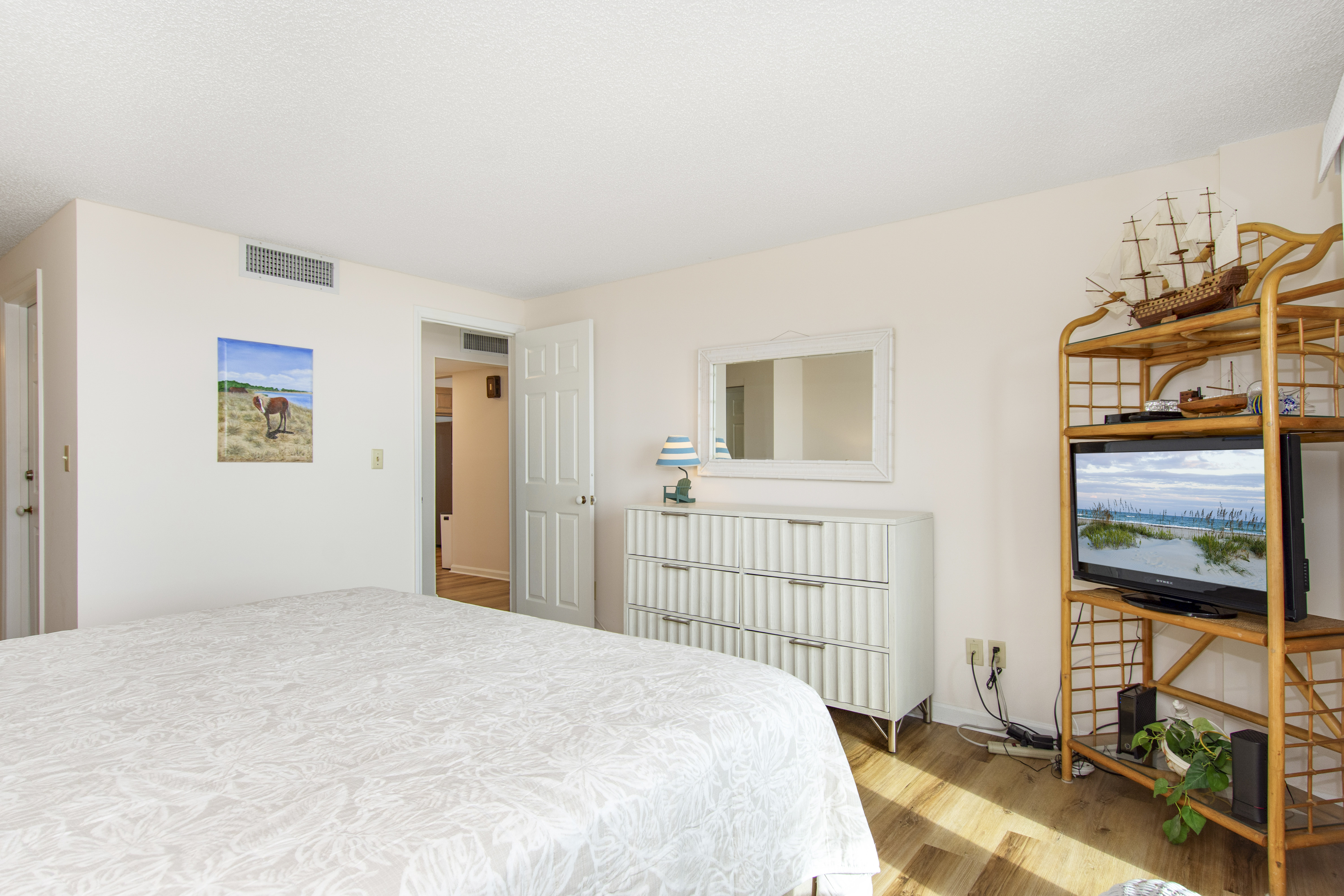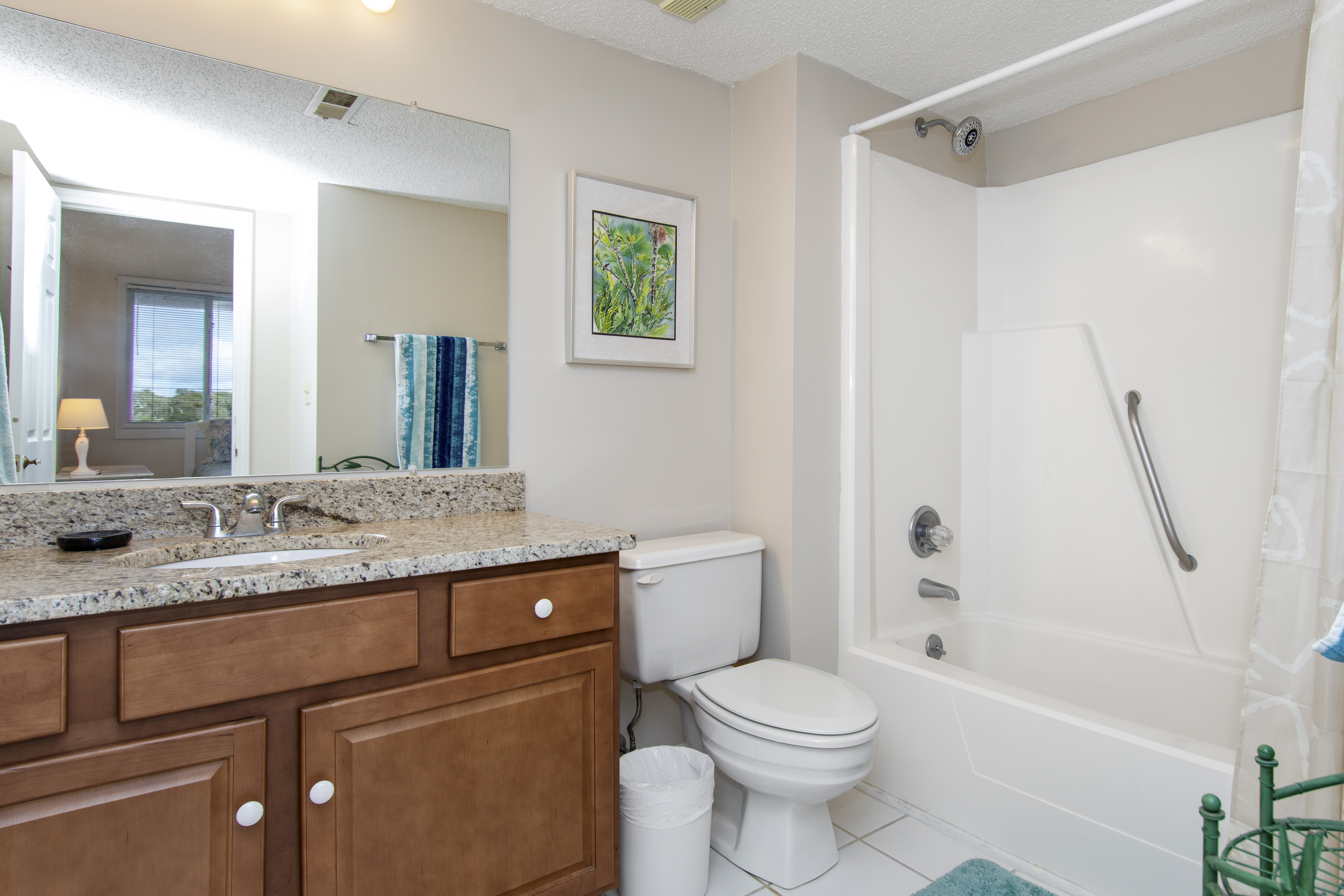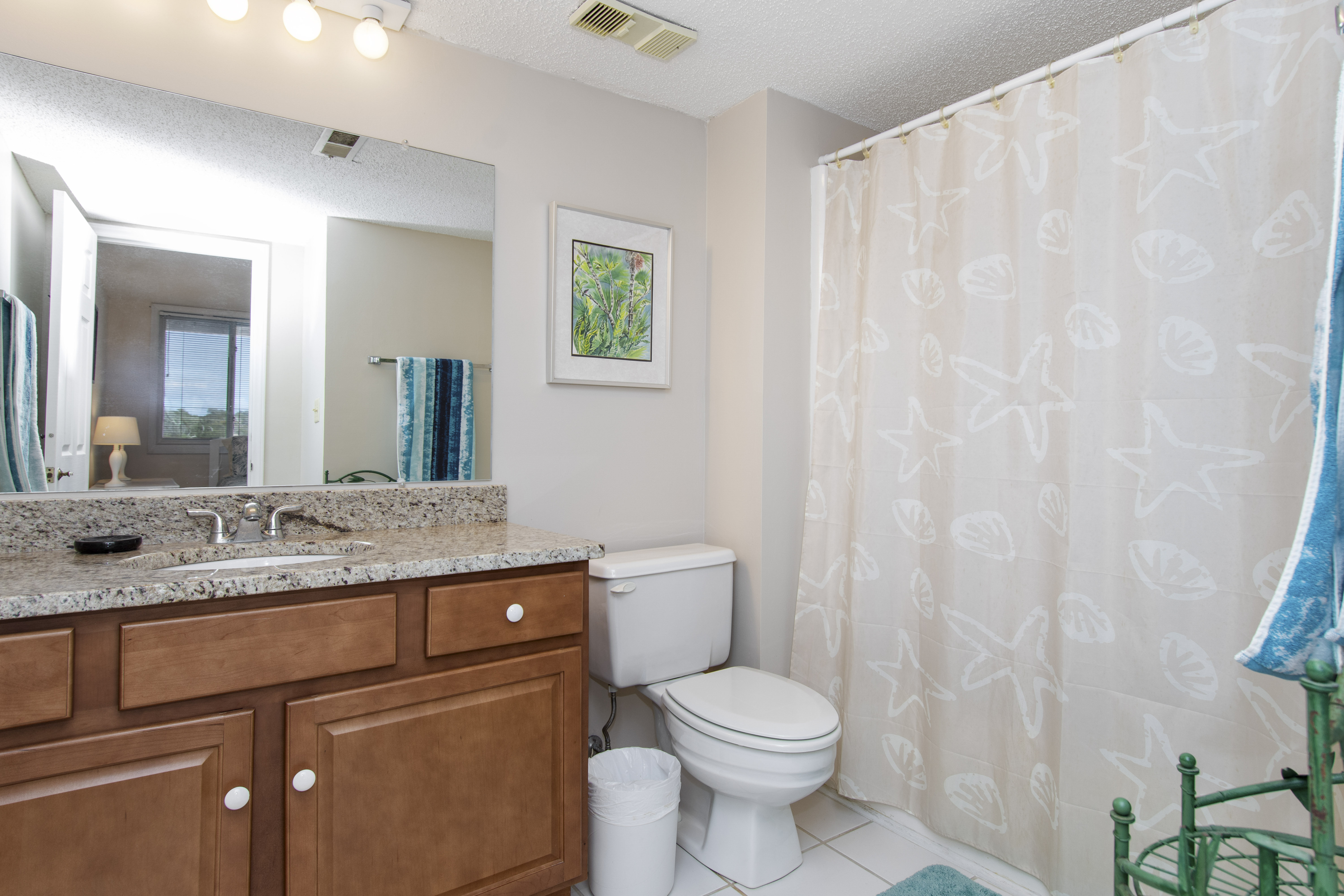 Beachwalk 202 is a bright and beachy, second floor, Oceanfront condo, surrounded by lush foliage. Bedroom #1 has a King Bed, TV, Balcony Access, and a Private Bathroom. Bedroom #2 has a Double Bed, with private bath. Bedroom #3 has 2 Twin Beds, and a Private Bathroom. High Speed Wireless Internet Access Provided!