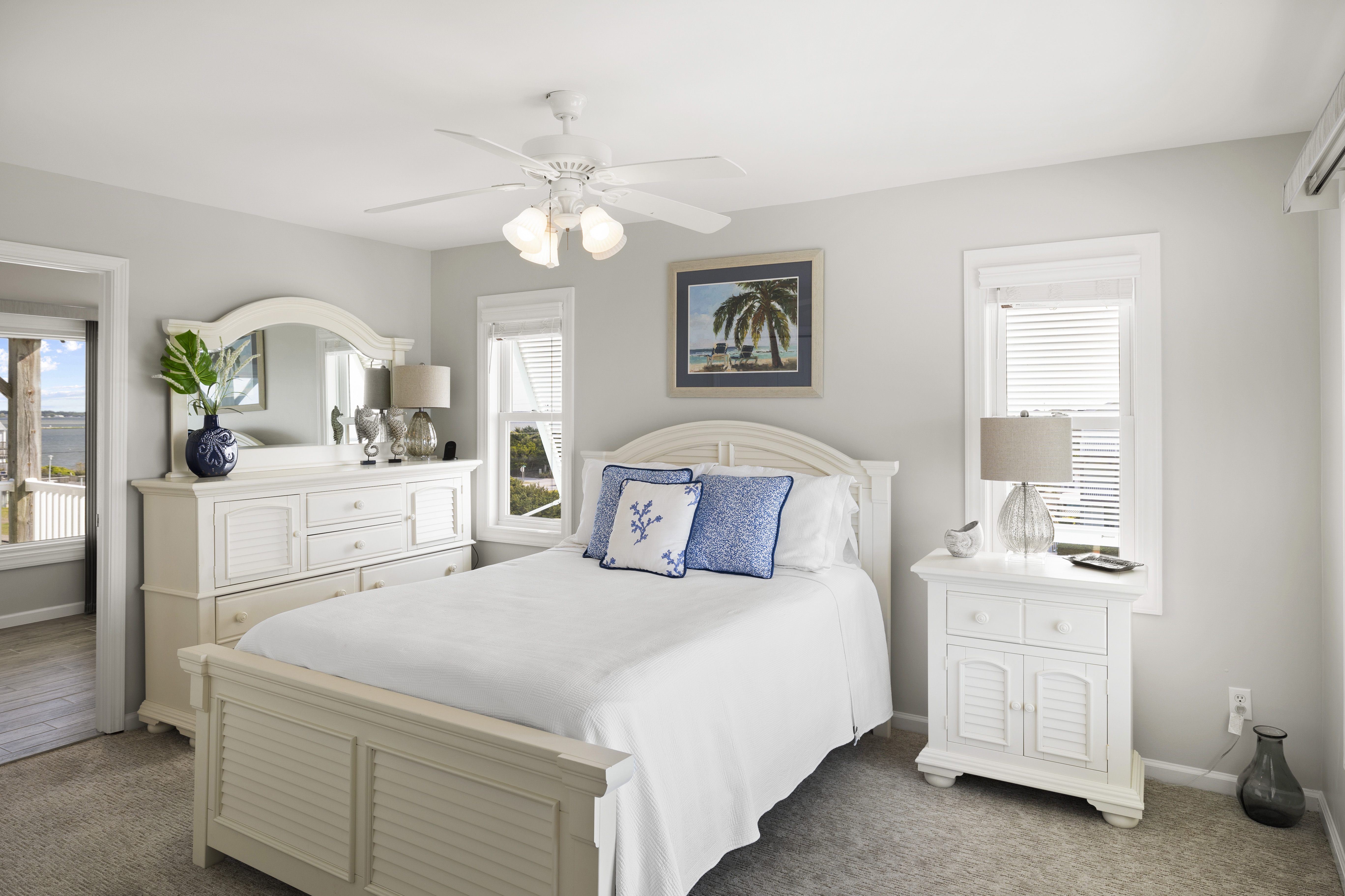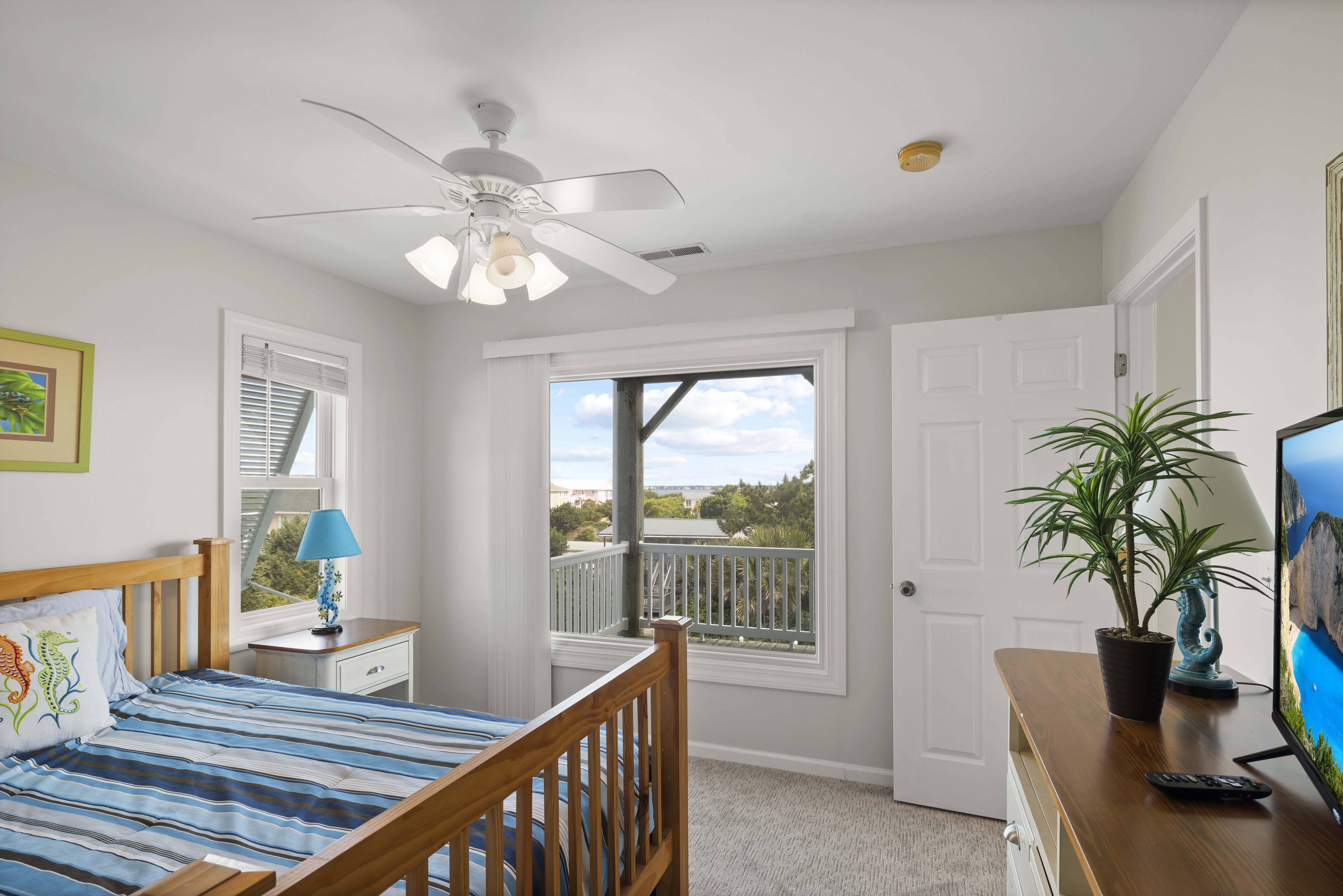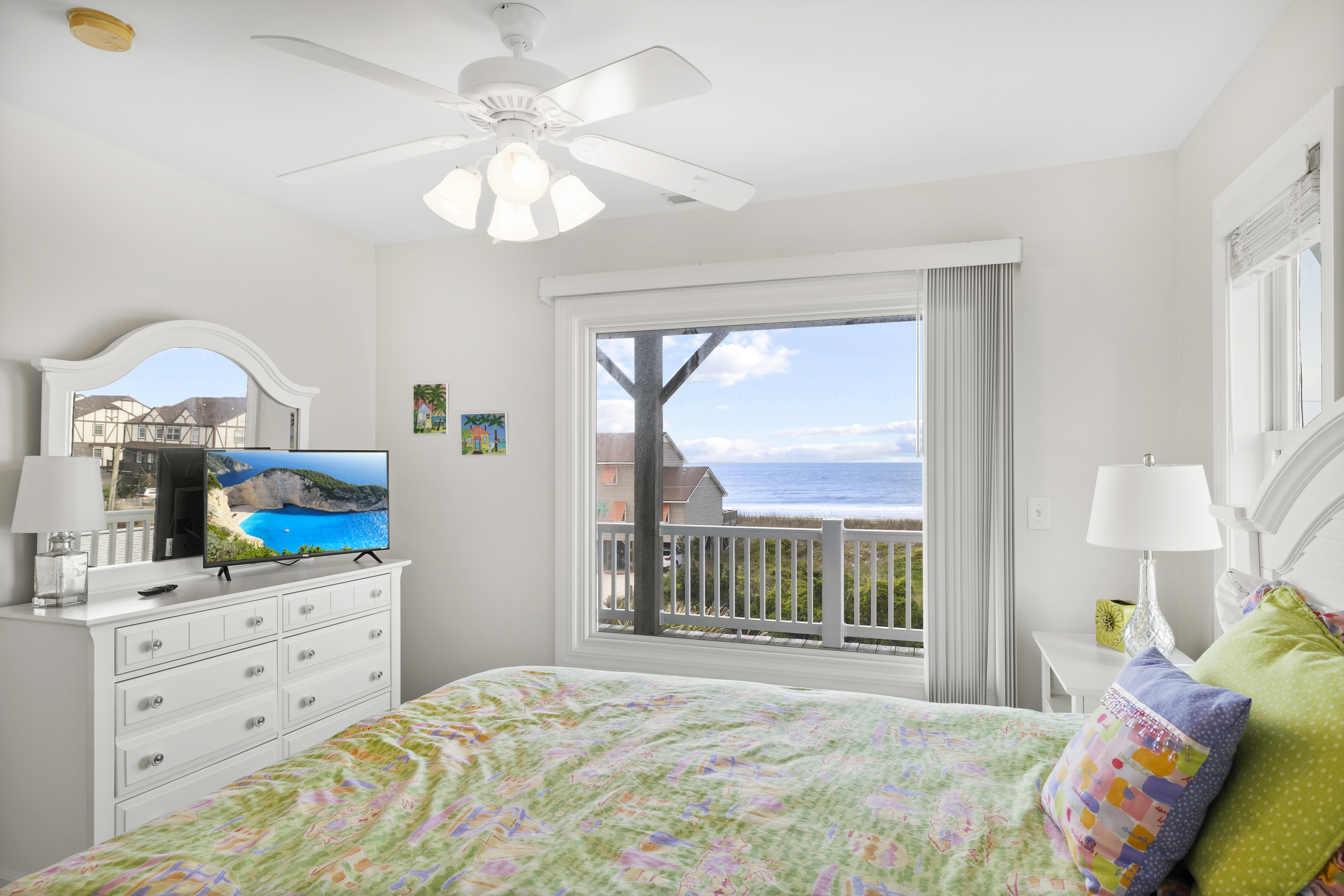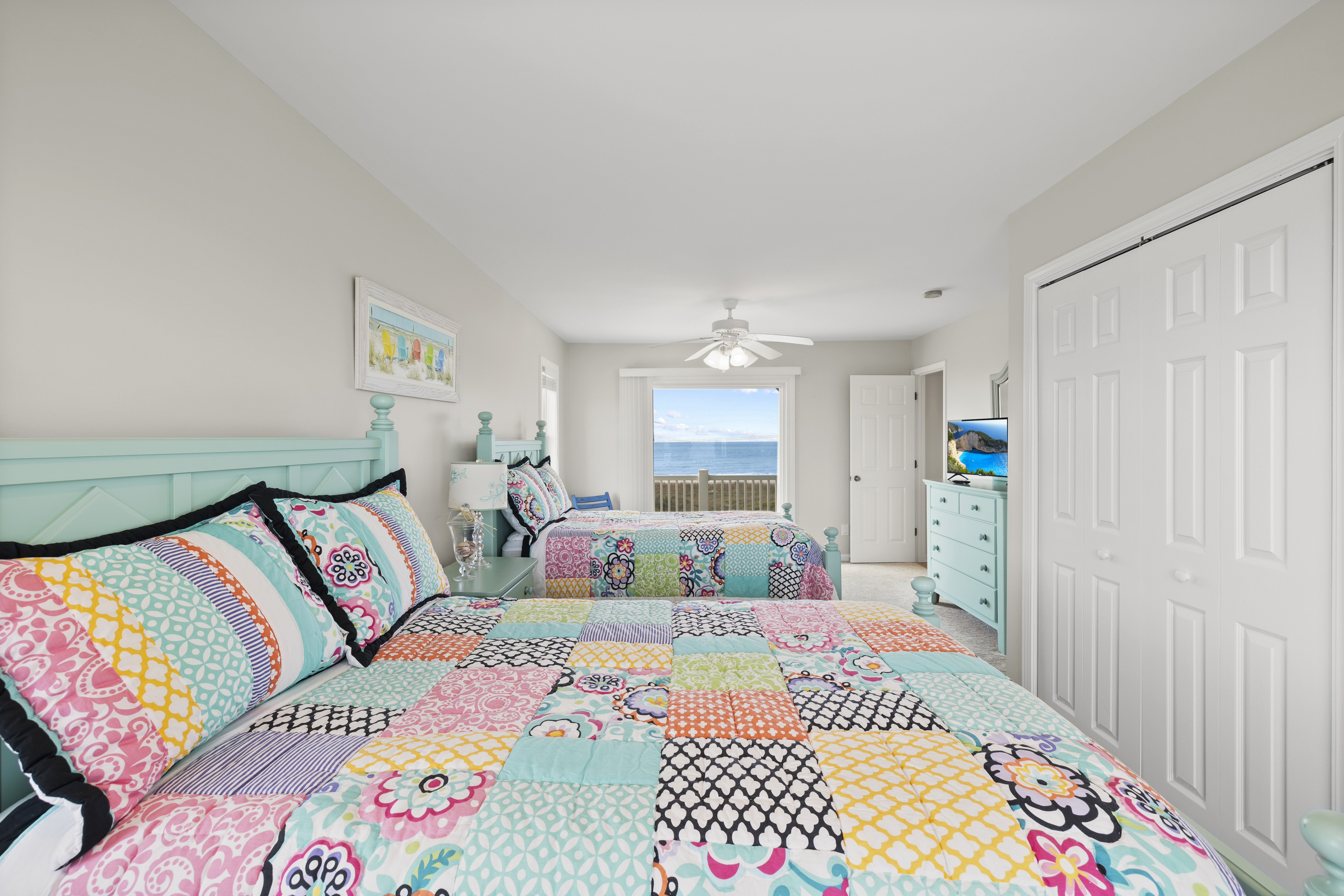 Level Two: Bedroom #3 Queen bed with a picture window that shows off the wonderful ocean views. This bedroom also has a smart TV. Bedroom # 4 Queen bed with ceiling fan, this room also has a Shared Full Bathroom. Bedroom #5 Two double beds with picture windows located on the front and back of the room, showing off images of both the ocean and the sound! This room also has a private full bathroom.