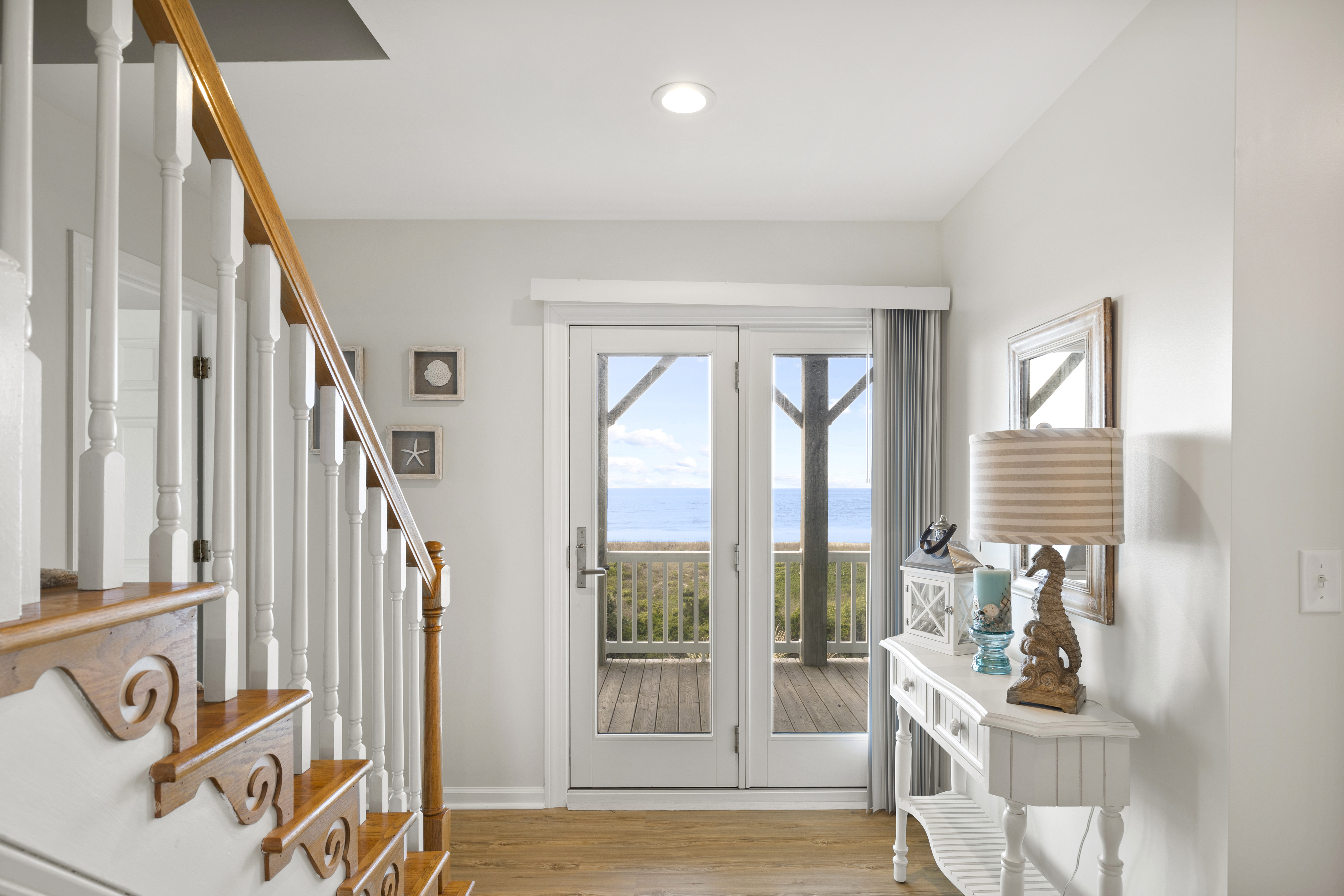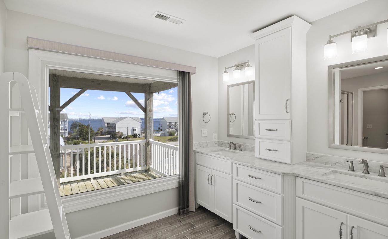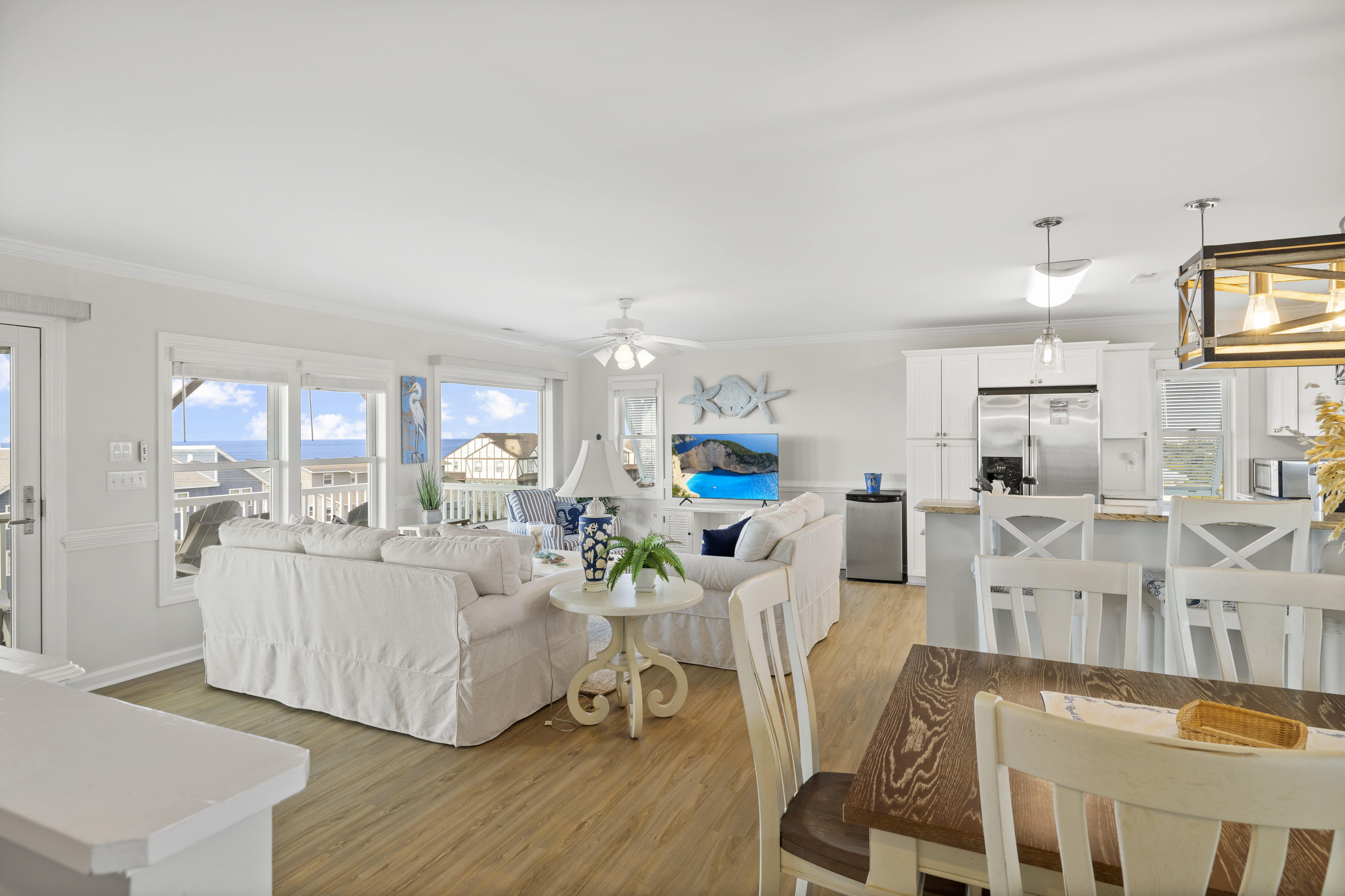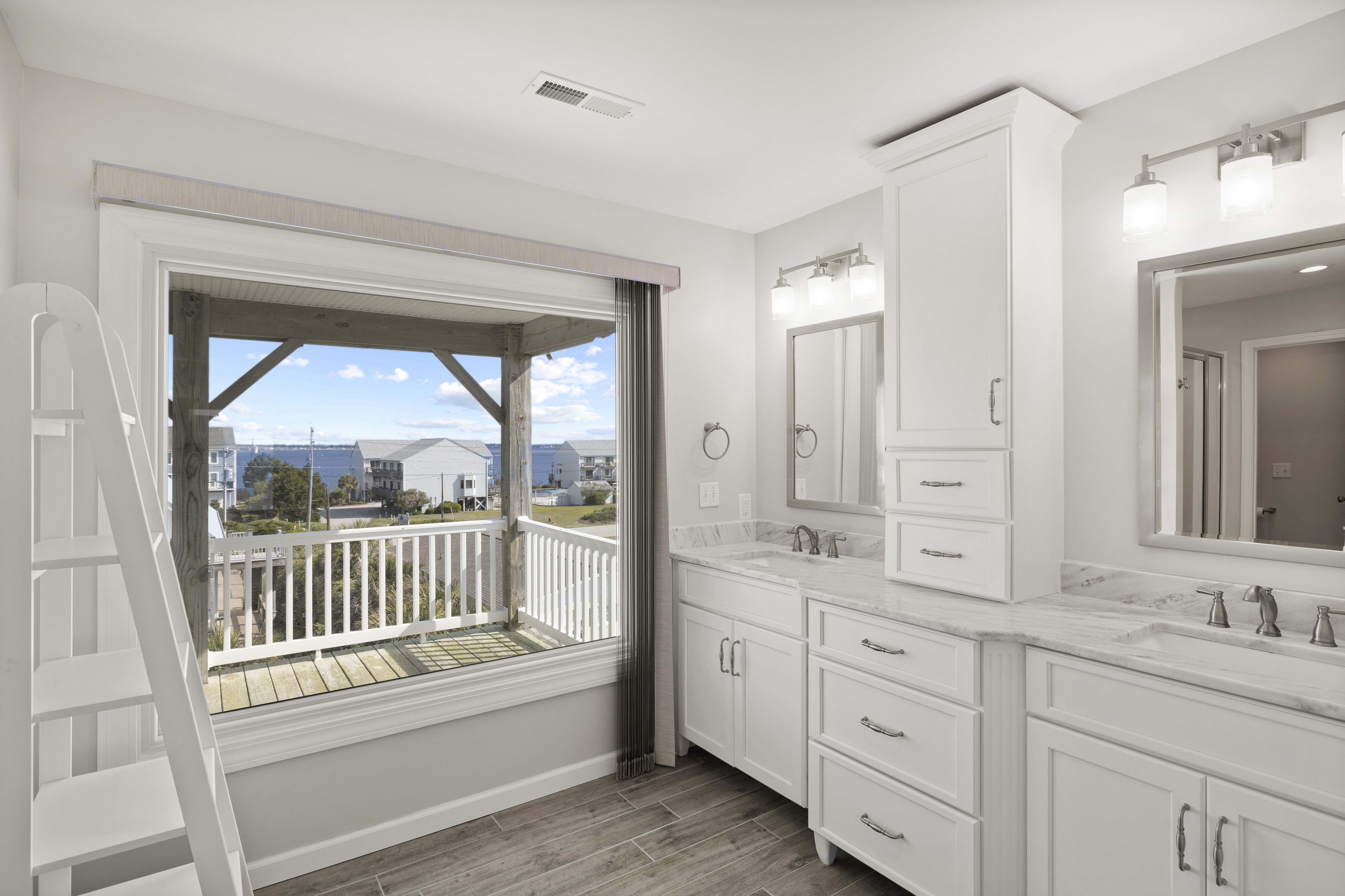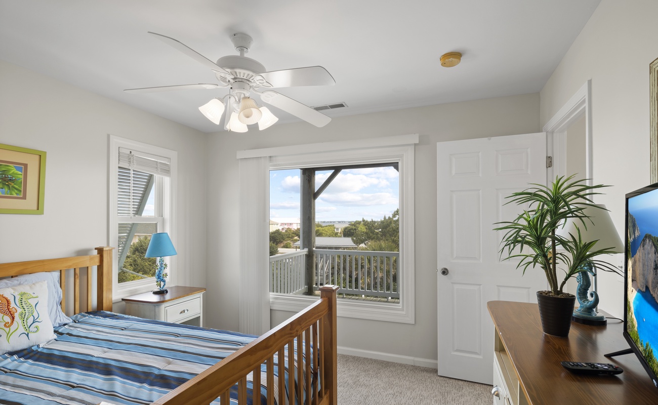Level Two: Bedroom #3 Queen bed with a picture window that shows off the wonderful ocean views. This bedroom also has a smart TV. Bedroom # 4 Queen bed with ceiling fan, this room also has a Shared Full Bathroom. Bedroom #5 Two double beds with picture windows located on the front and back of the room, showing off images of both the ocean and the sound! This room also has a private full bathroom.