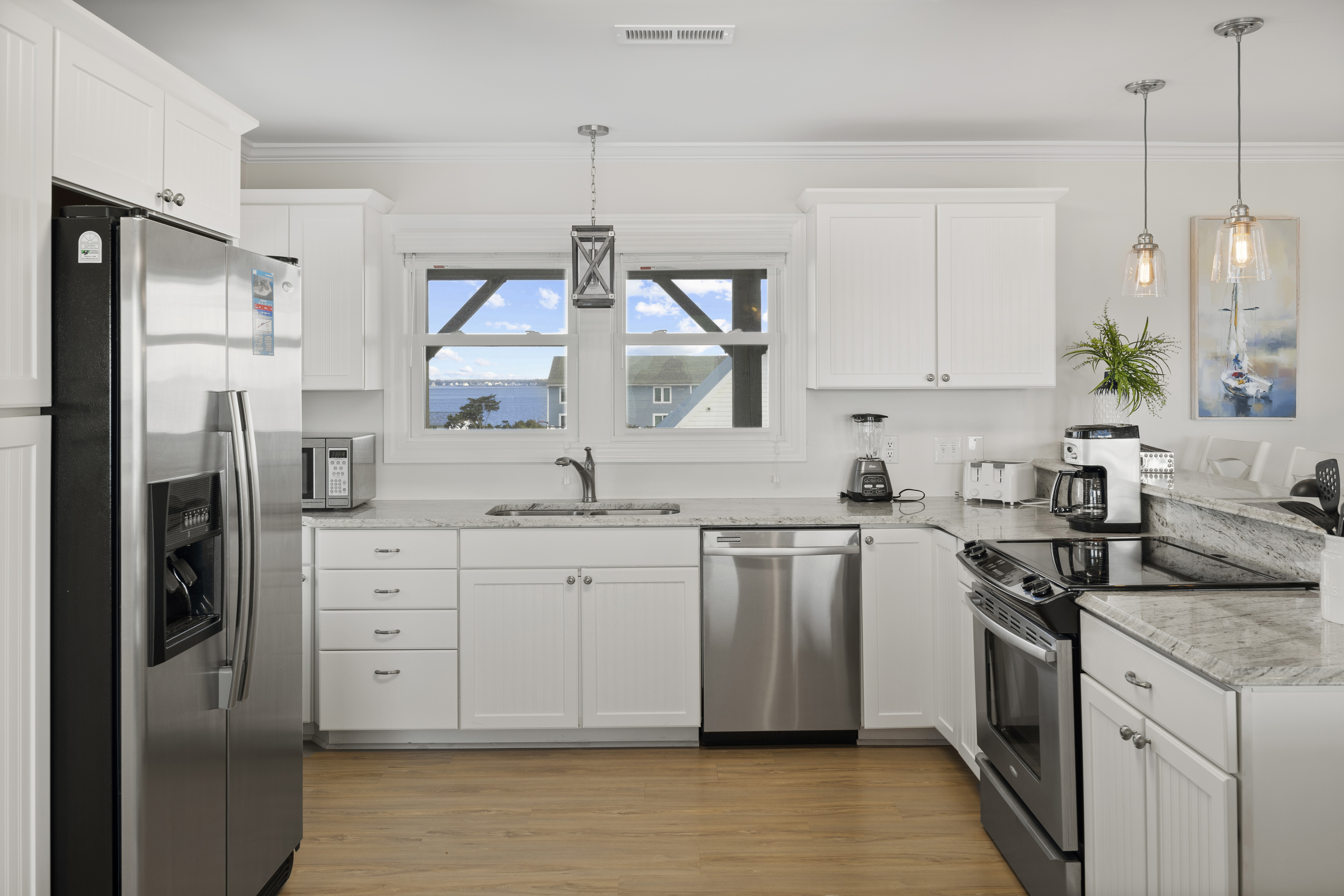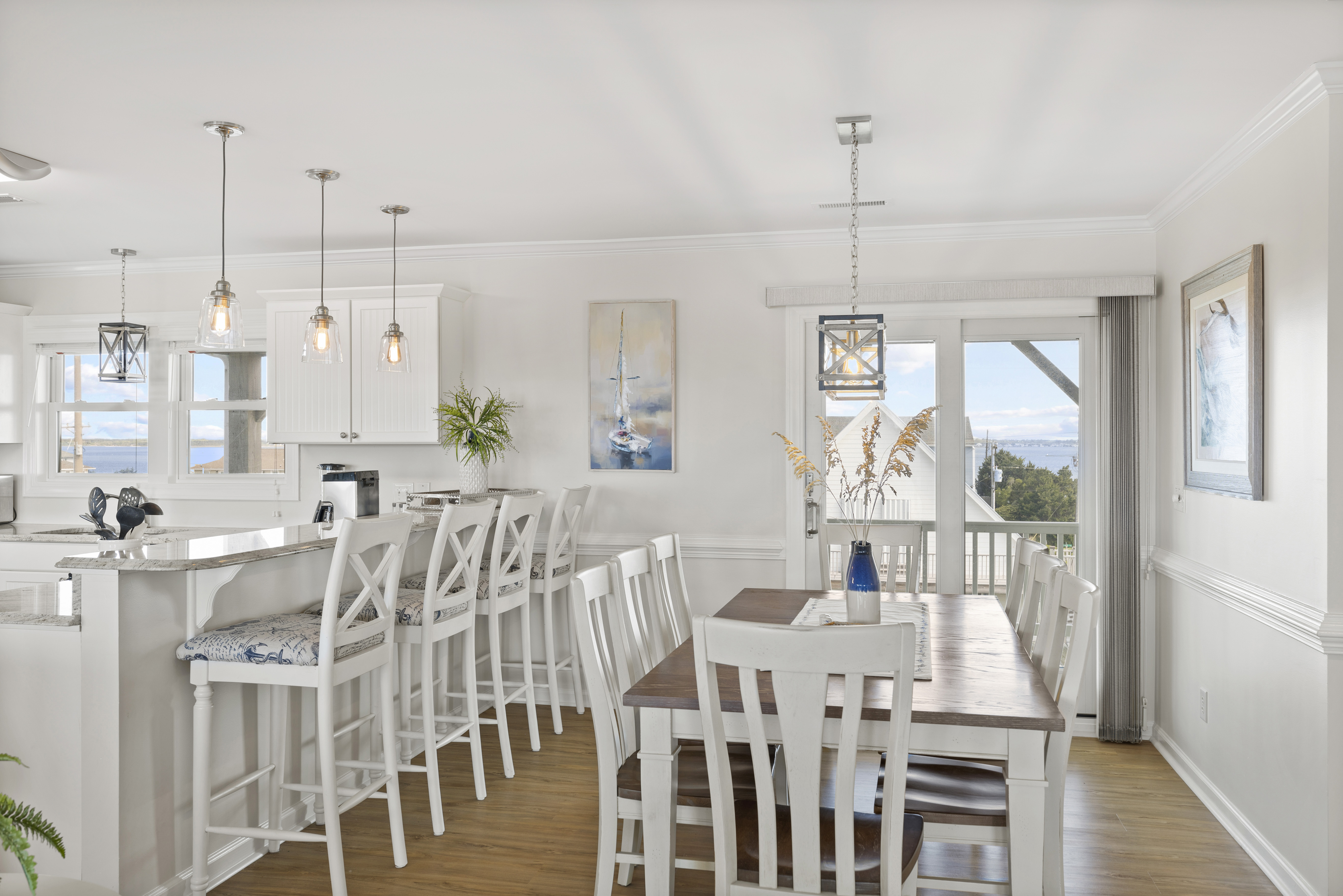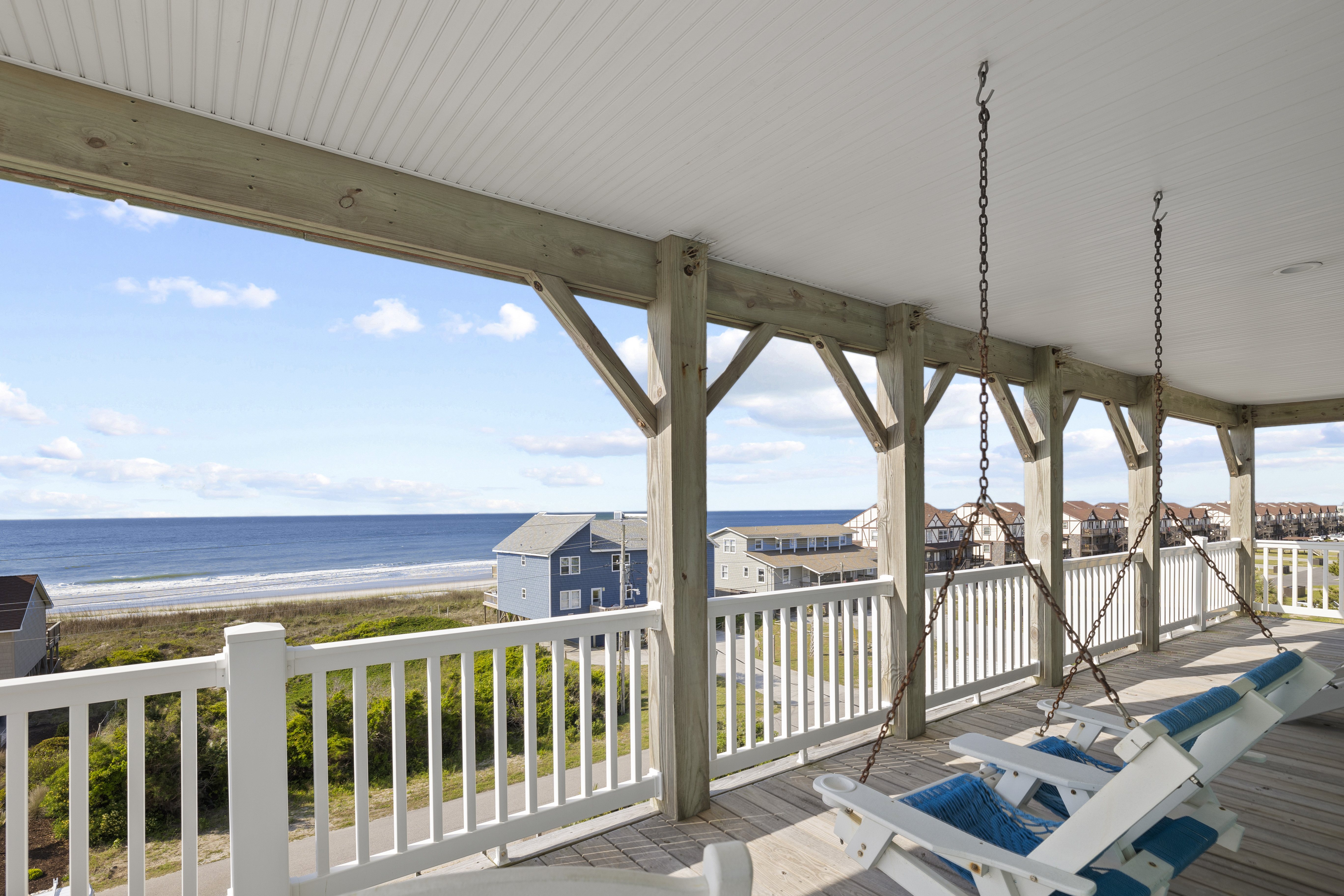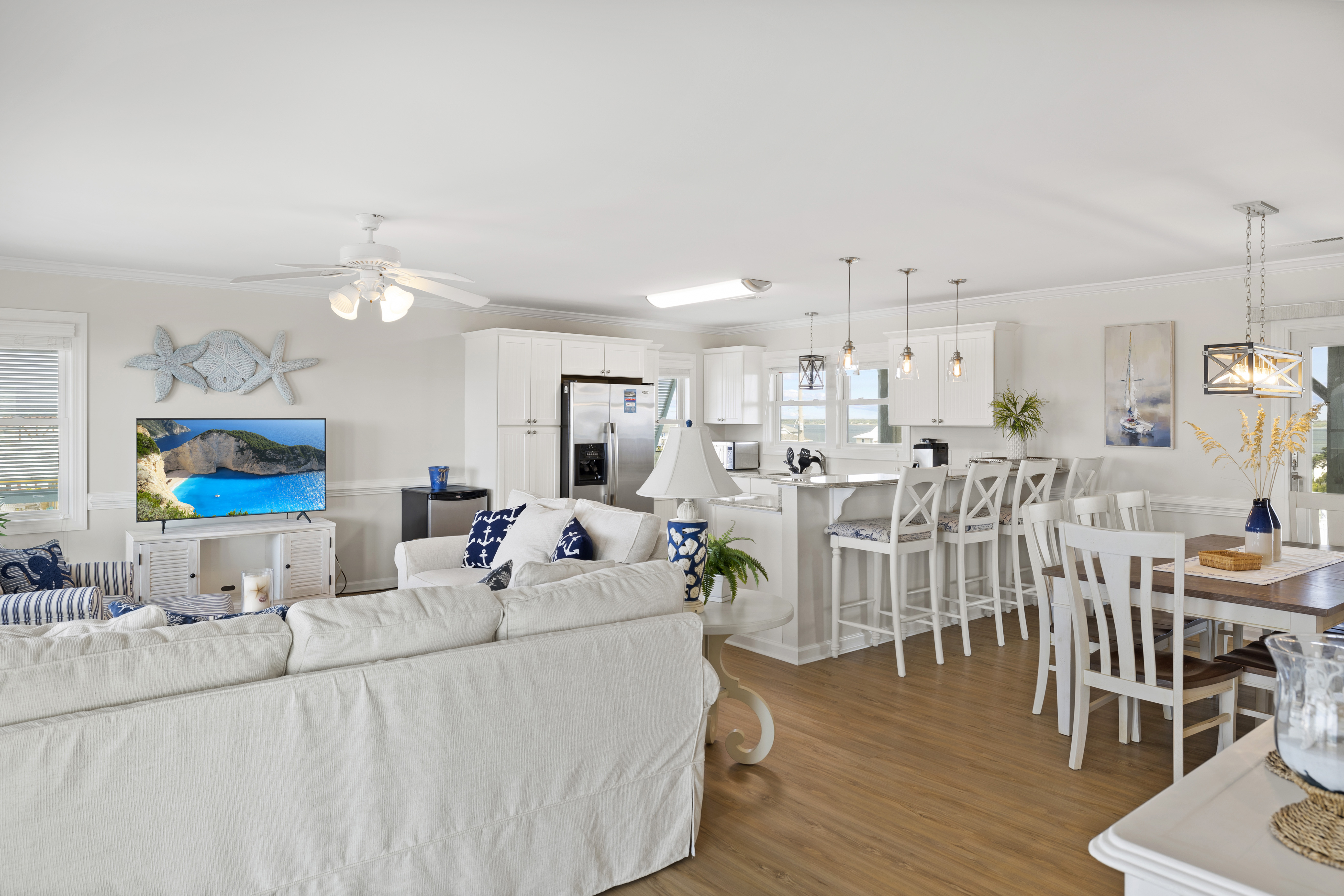 Level Two: Bedroom #3 Queen bed with a picture window that shows off the wonderful ocean views. This bedroom also has a smart TV. Bedroom # 4 Queen bed with ceiling fan, this room also has a Shared Full Bathroom. Bedroom #5 Two double beds with picture windows located on the front and back of the room, showing off images of both the ocean and the sound! This room also has a private full bathroom.
