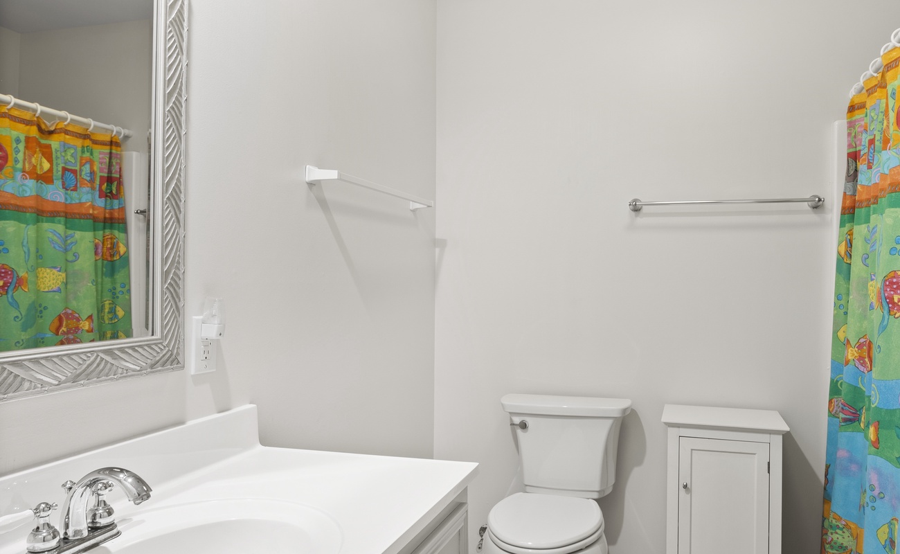 Level One: Bedroom #1 has a queen bed and a whisper floor fan. Bedroom #2 has two twin beds. There is also a gameroom on this floor with a couch and loveseat, large smart TV, foosball table, and deck and pool access. There is a full hall bathroom located on this floor.