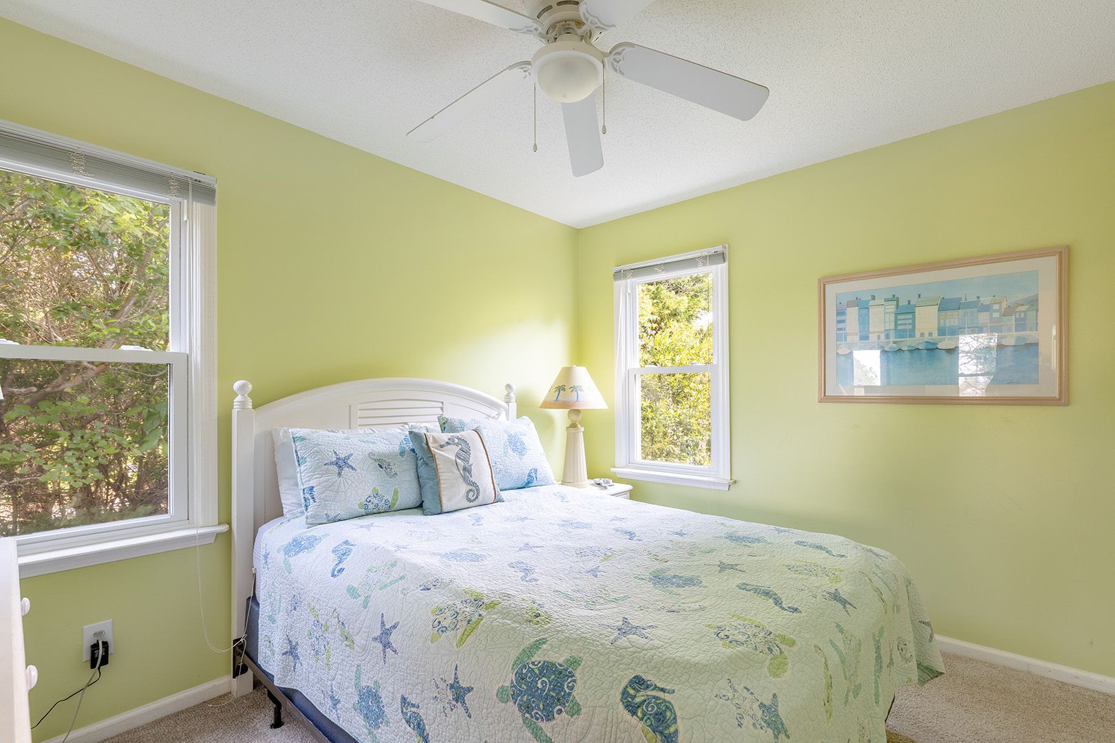 Level Two: Bedroom #2 has two Twin Beds, a Twin Daybed (Daybed has Twin Trundle - linens not provided for Trundle), and a door leading to the Uncovered Deck. Bedroom #3 has a Double Bed. A Full-Bath connects Bedrooms #2 and #3.
