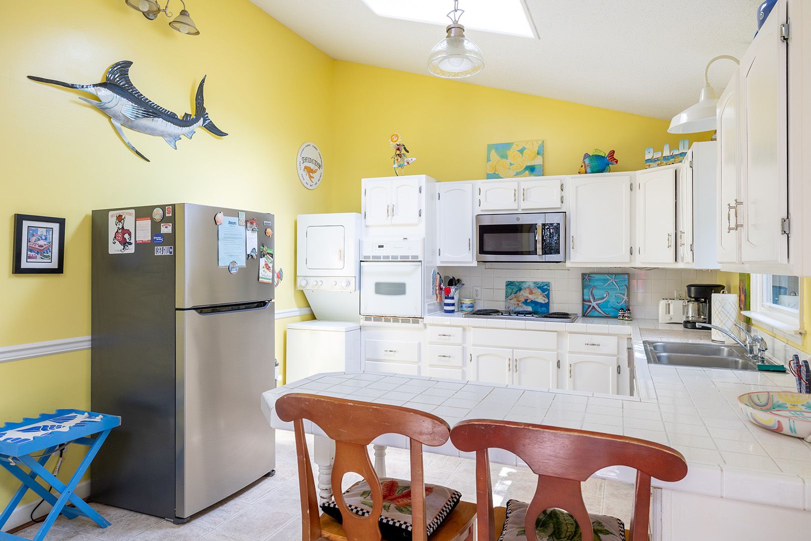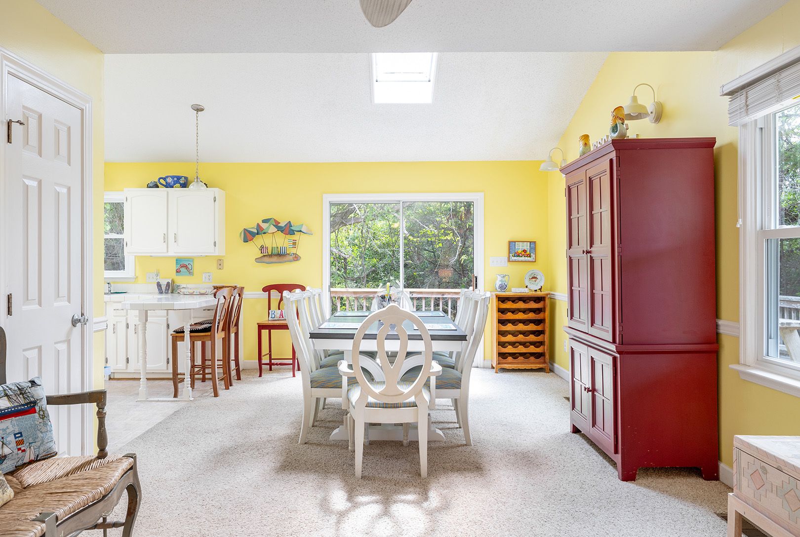 Level One: Living Area with a Flat Screen TV, a Blu-Ray DVD Player and access to the Covered Deck. Dining Area has table for eight. Deck Access is available from the Dining Area. The Kitchen Area includes a Microwave and a Dishwasher. There is additional seating for 3 at the Breakfast Bar. Bedroom #1 has a Queen Bed. There is a Full-Bath on this level.