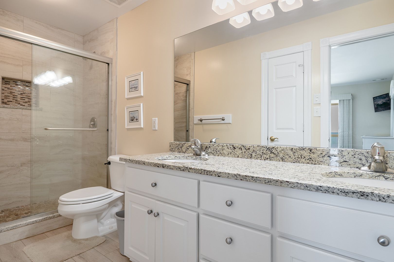 Level One: Huge game room with pool table, foosball table and shuffleboard. Wet bar with full-size refrigerator, an ice maker that makes 30lbs of ice! A table with chairs, 2 large leather sofas, and a flat screen tv with netflix. Enclosed garage. Enclosed hot/cold outdoor shower. Stainless steel gas grill.