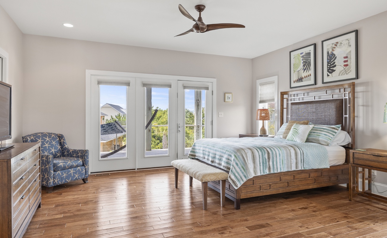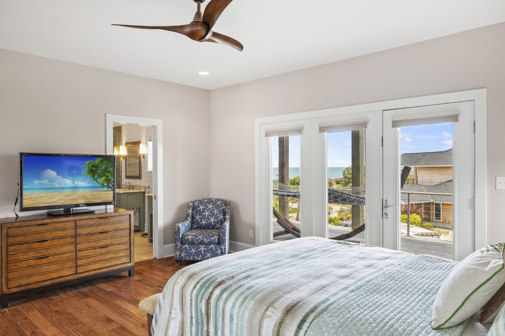Floor #2: Bedroom #1 - Queen Bed, TV, Deck Access, Ocean Views, and Private Bath.