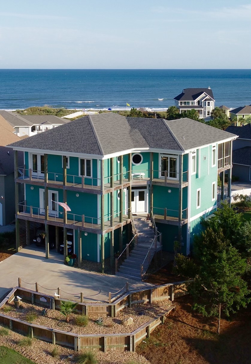 Bonnie Banks is an Almost Oceanfront 4 bedroom 3.5 bath beach home in beautiful Emerald Isle. Built on a sand dune, this home affords stunning panoramic ocean views from the 2nd and 3rd floor living areas including covered decks and screened porch.