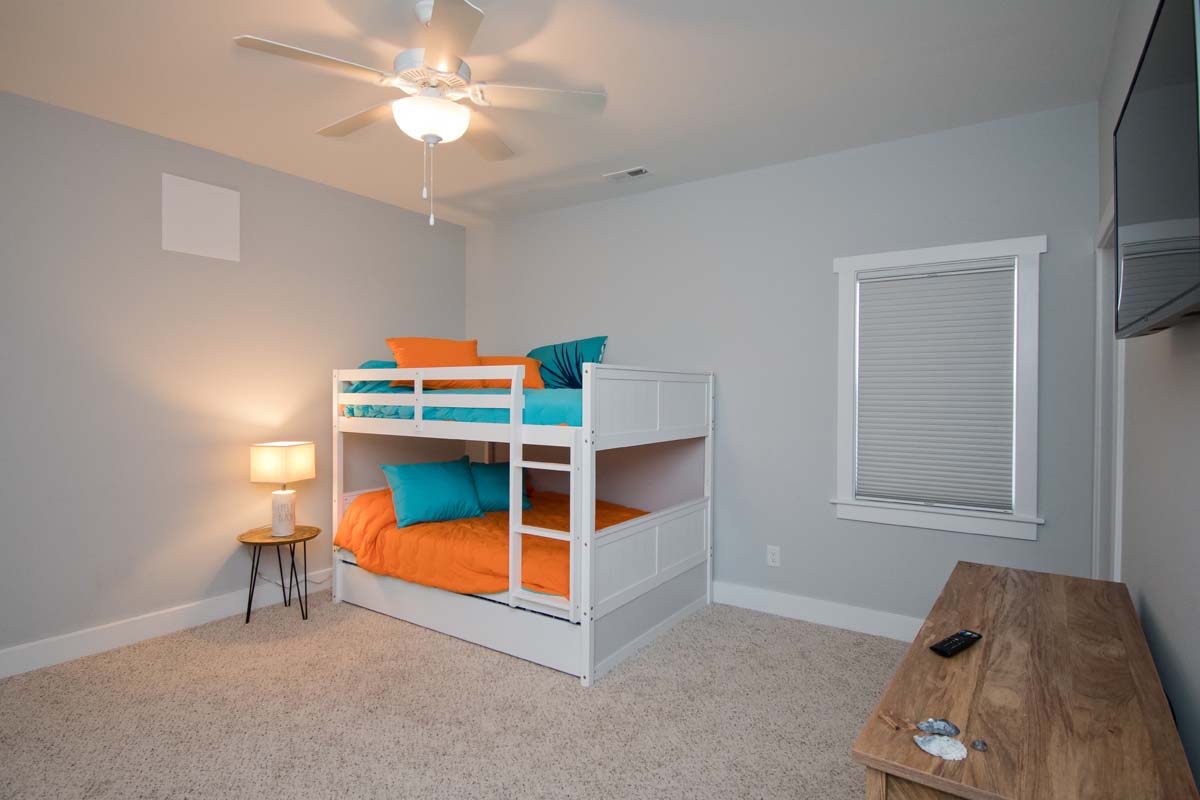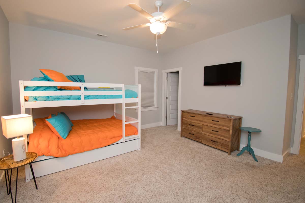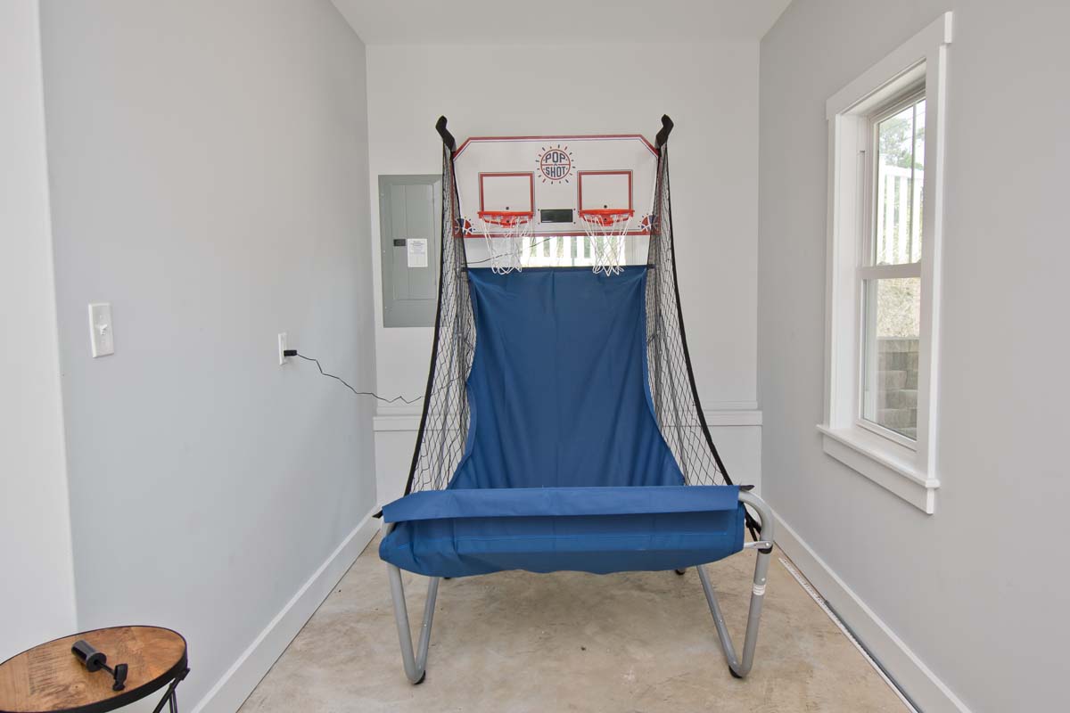 Ground Level: On this level of the home there is a game area that includes a basketball game and air hockey. You will also find bedroom #1 which contains a double/double bunk set, a TV, and access to a full hall bathroom.
