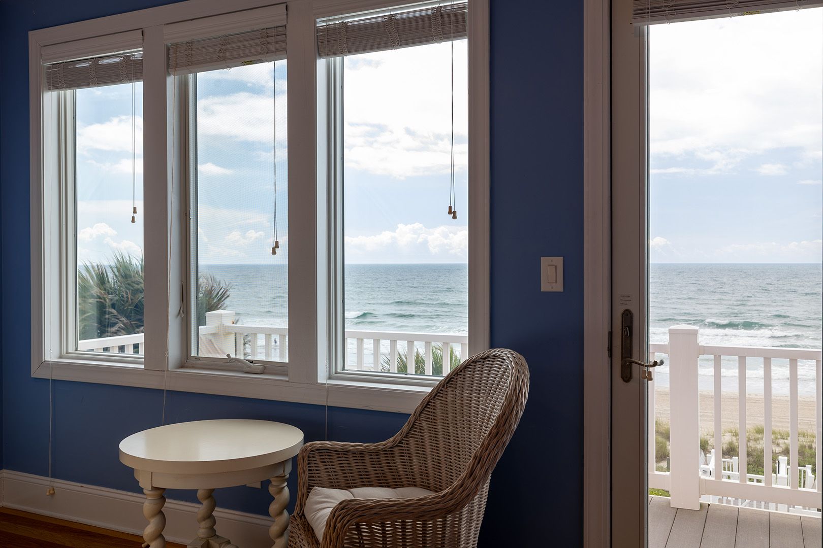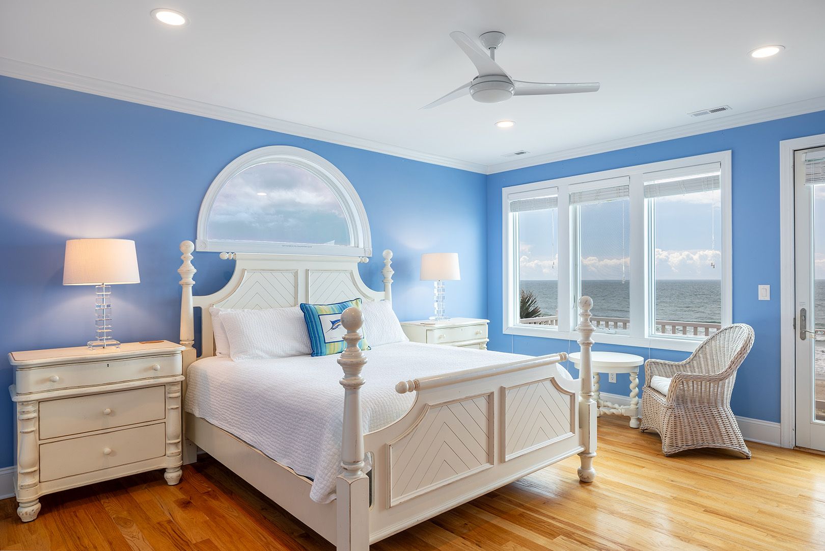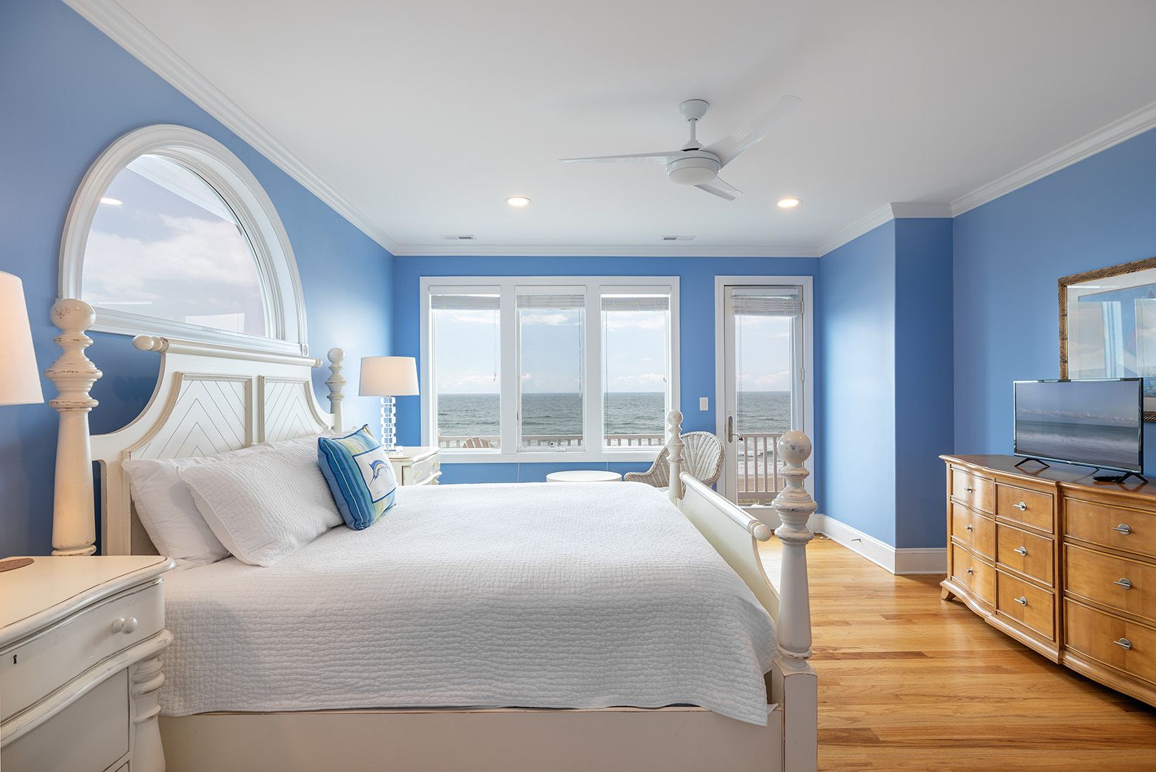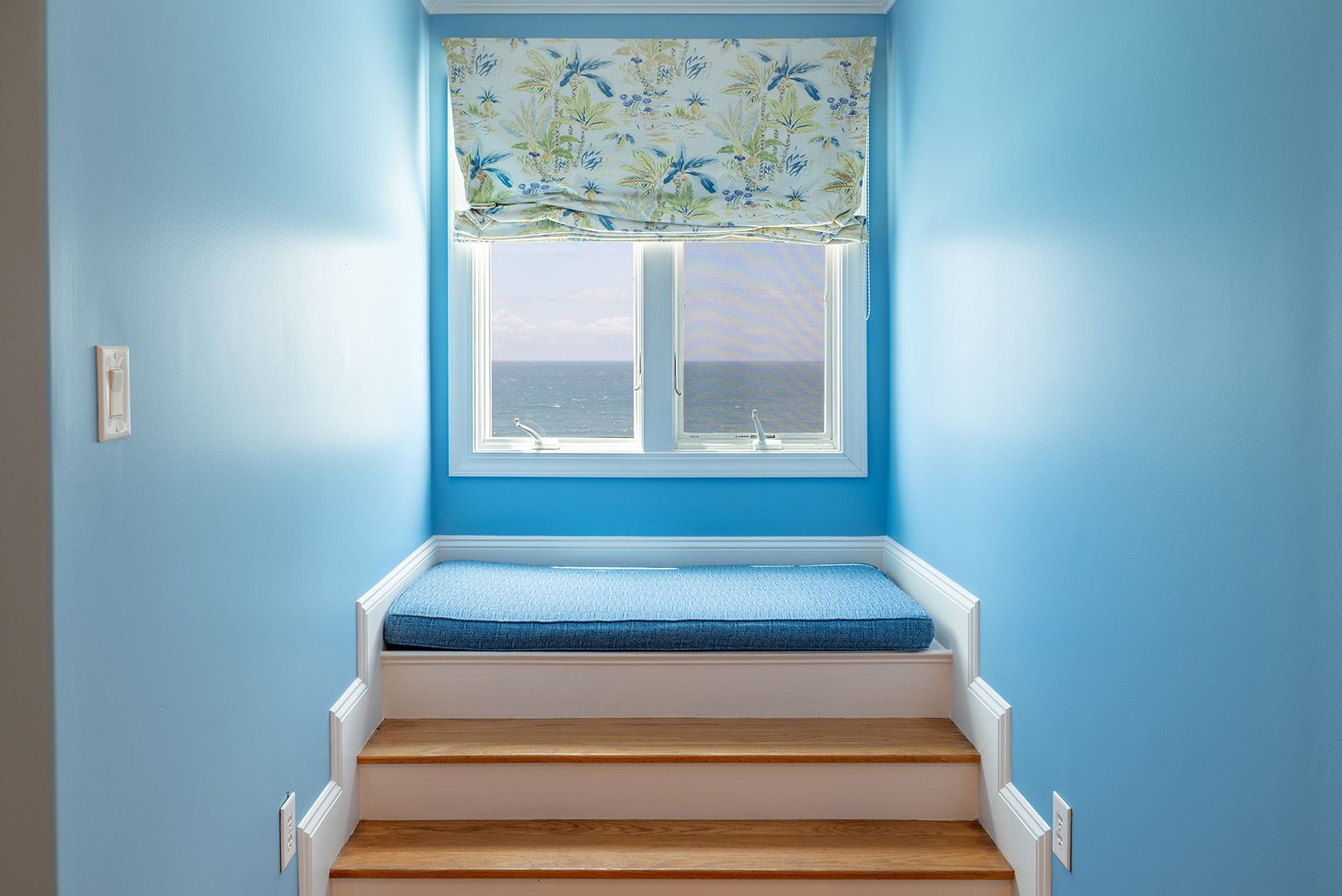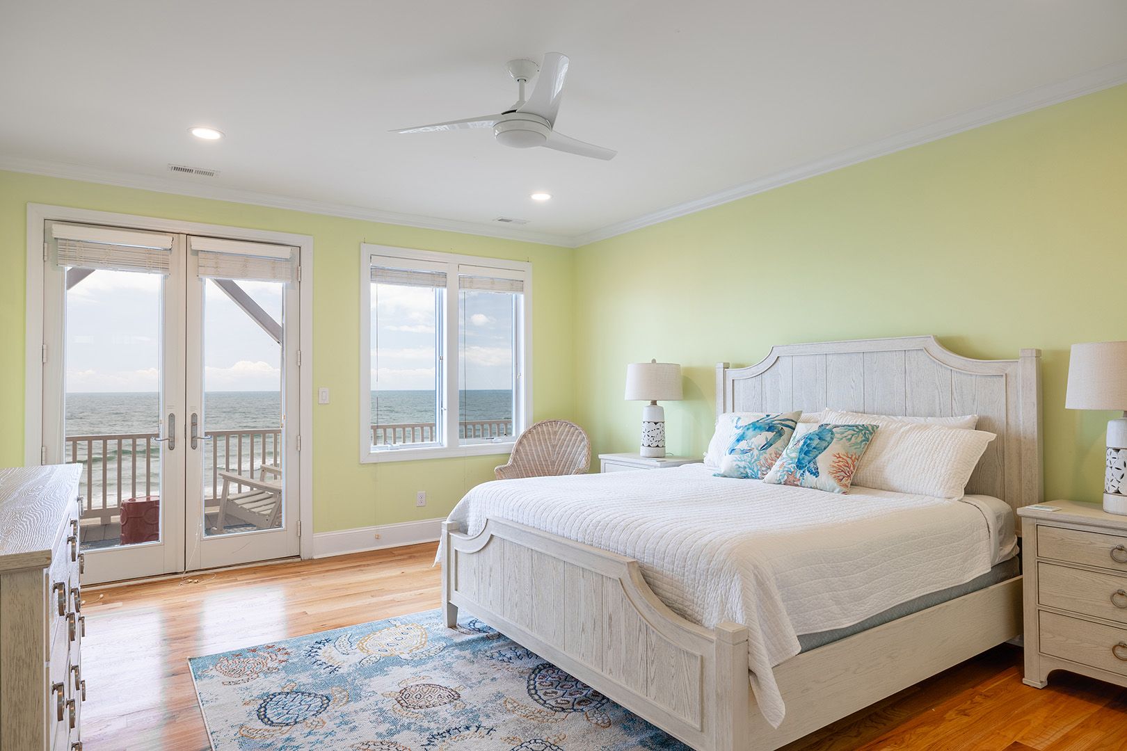 Level Three: Master King Bedroom suite with TV and sitting area, Pet alcove (3 steps leading up to an oceanfront window seat), Private bath including whirlpool tub, Private deck.