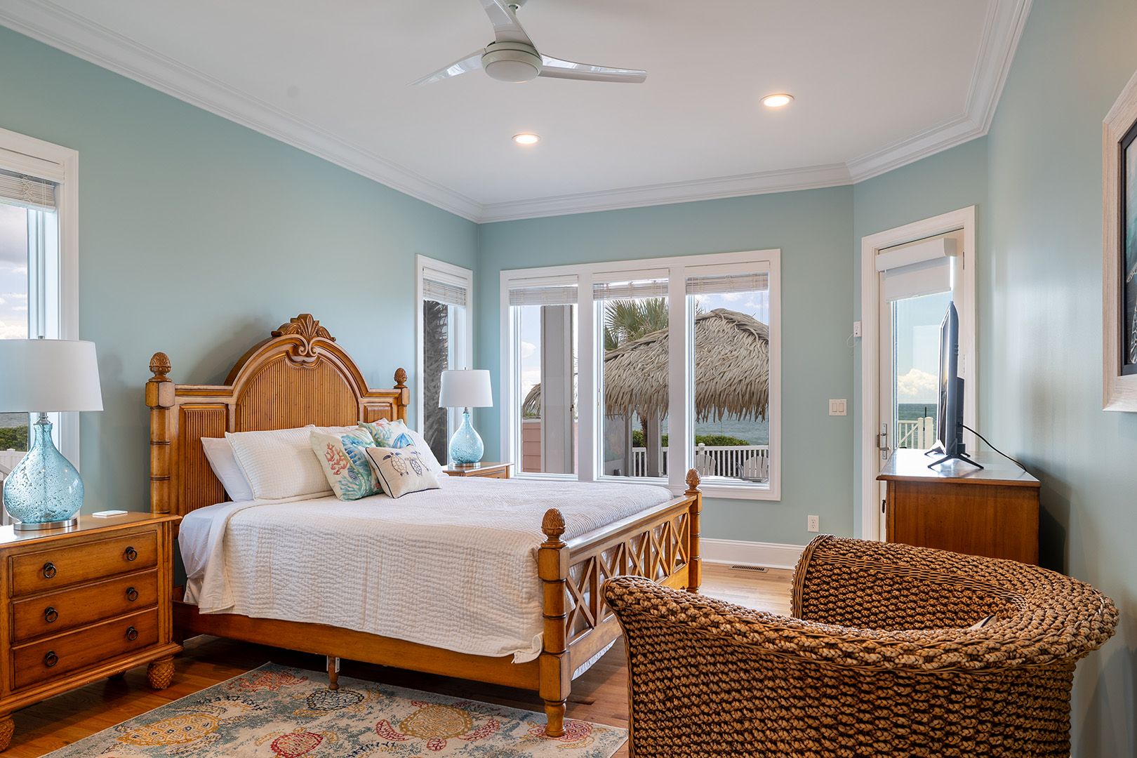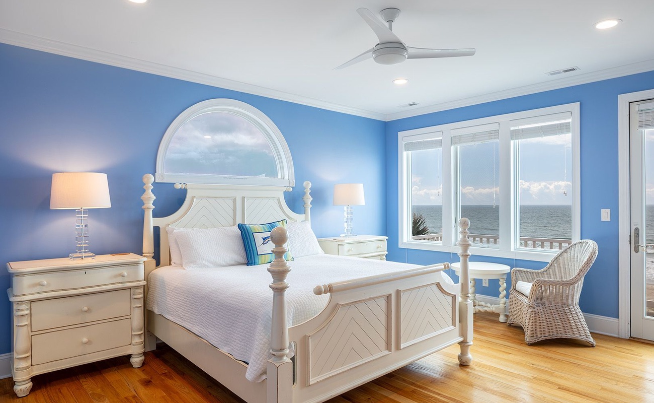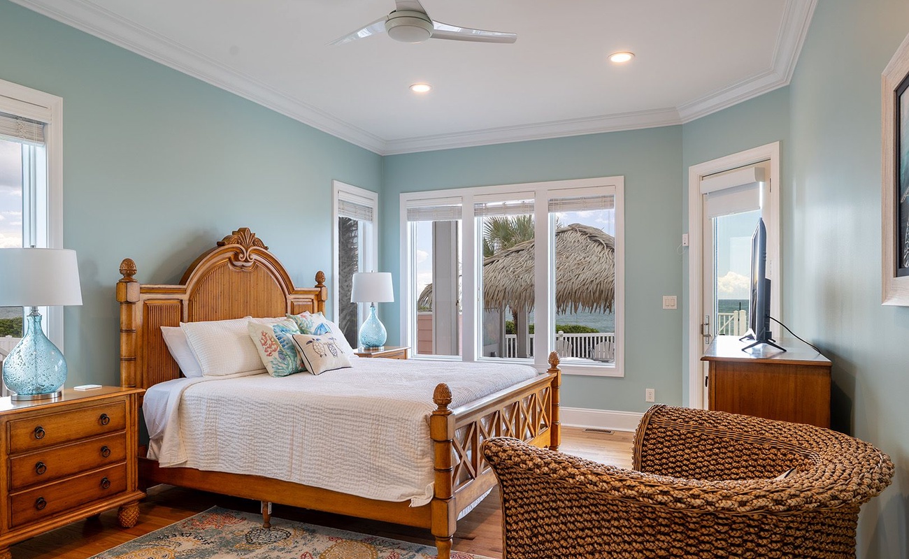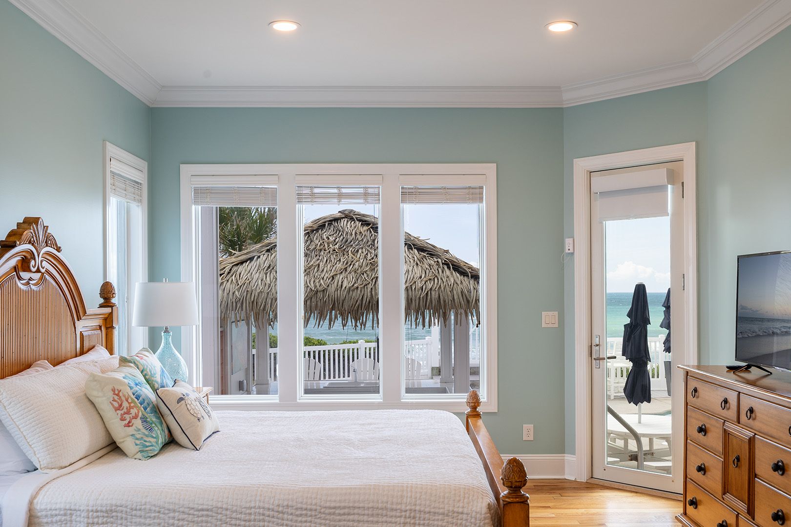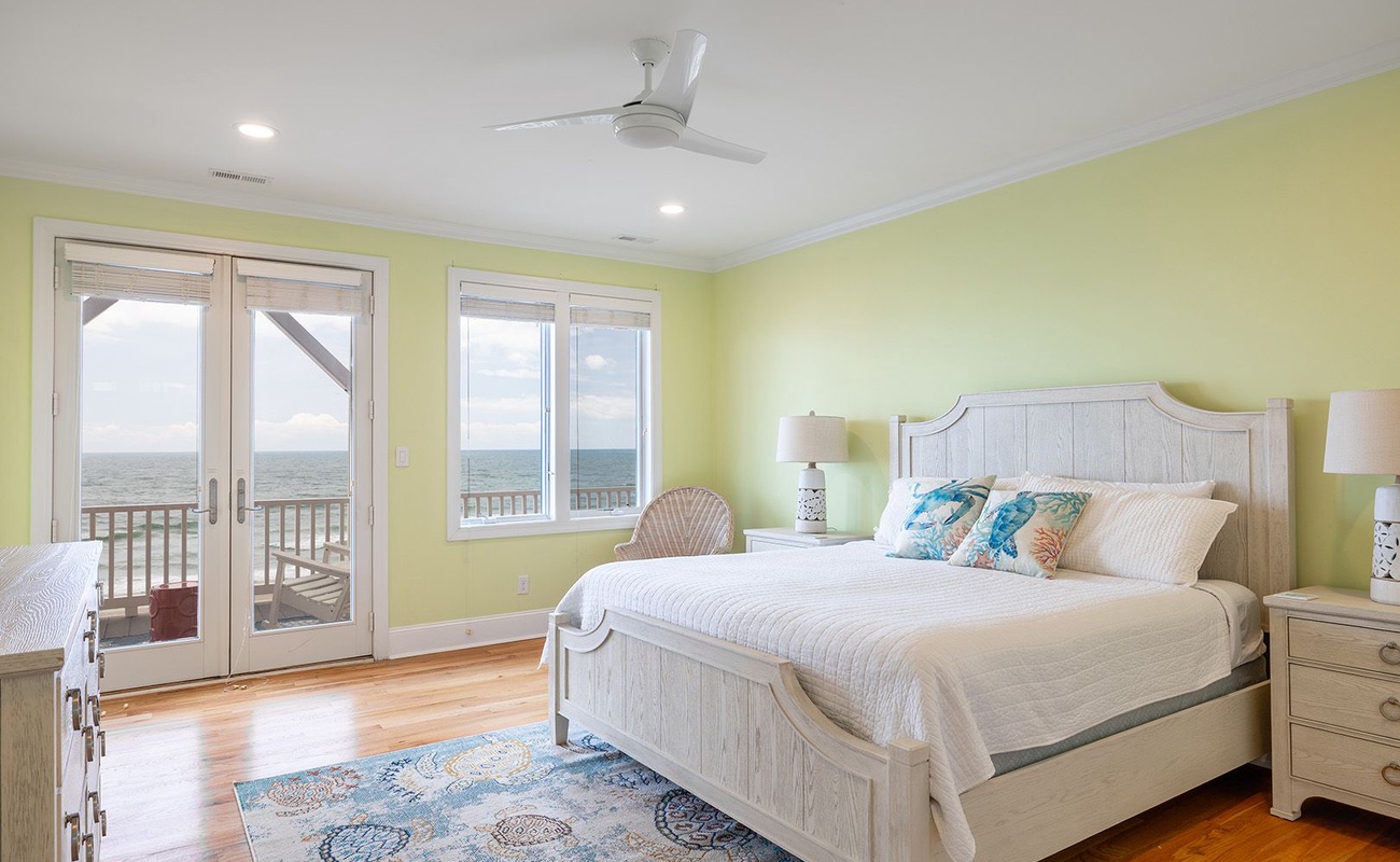 Level Three: Master King Bedroom suite with TV and sitting area, Pet alcove (3 steps leading up to an oceanfront window seat), Private bath including whirlpool tub, Private deck.