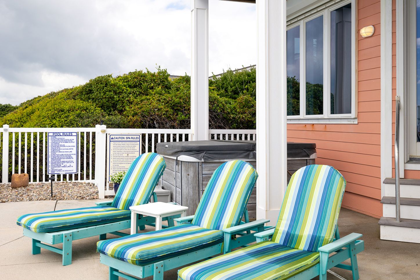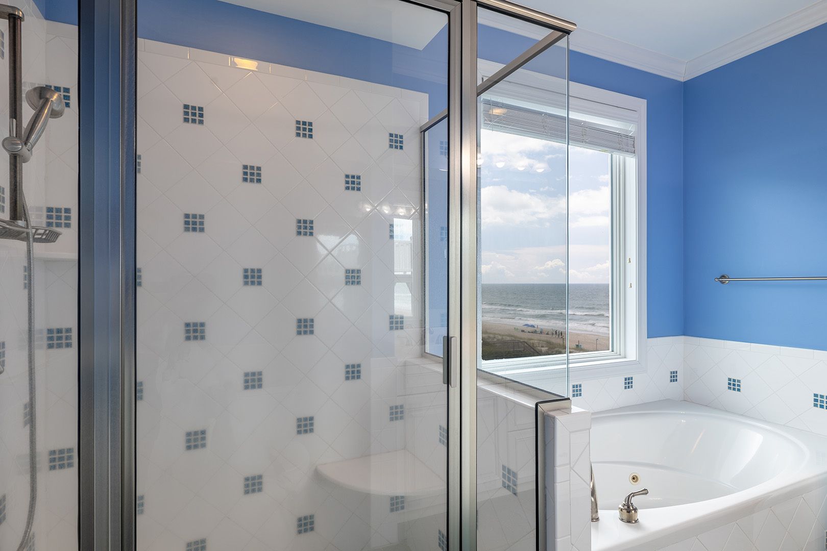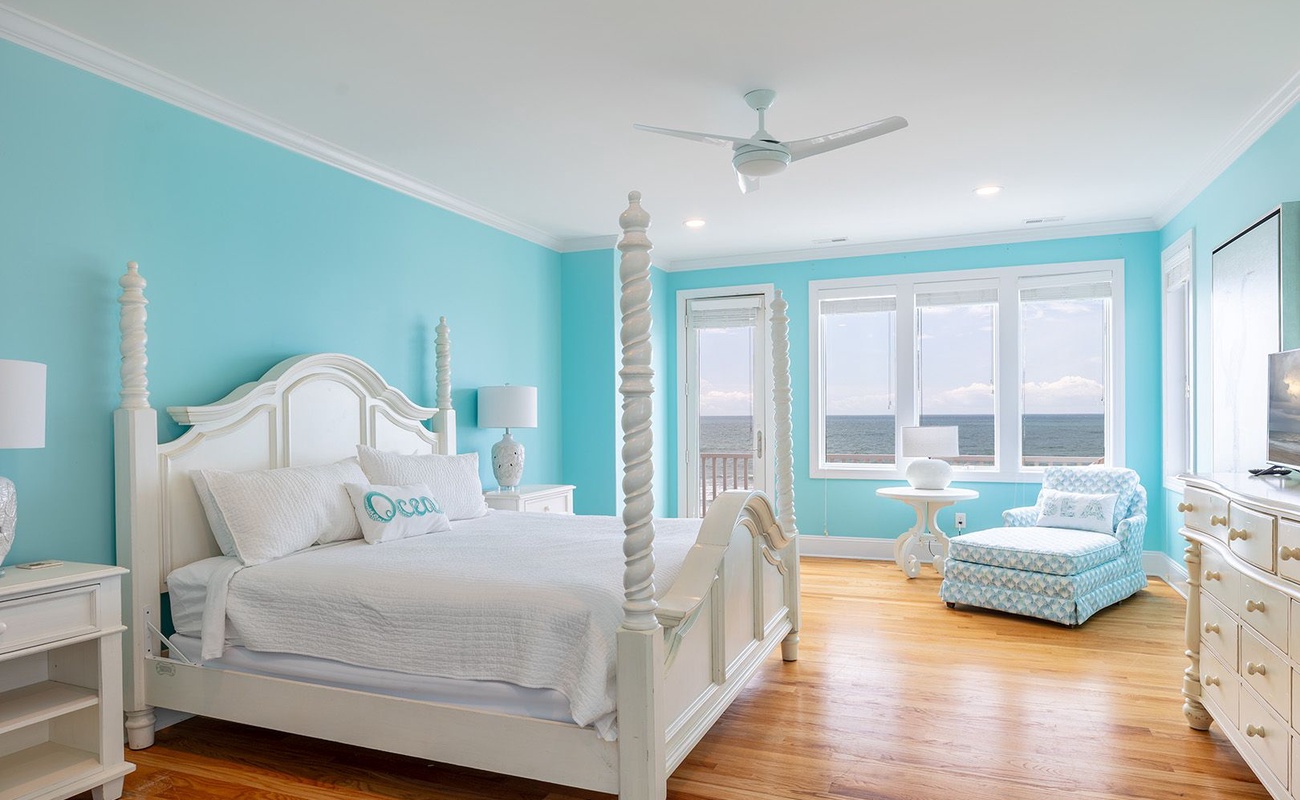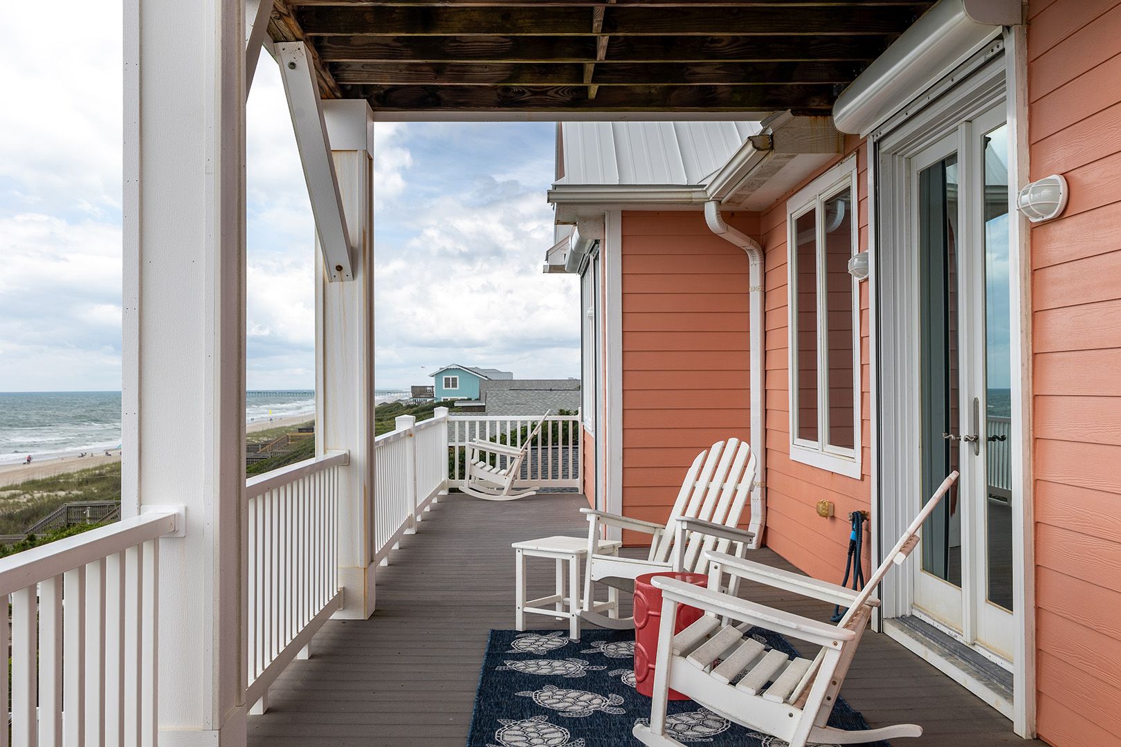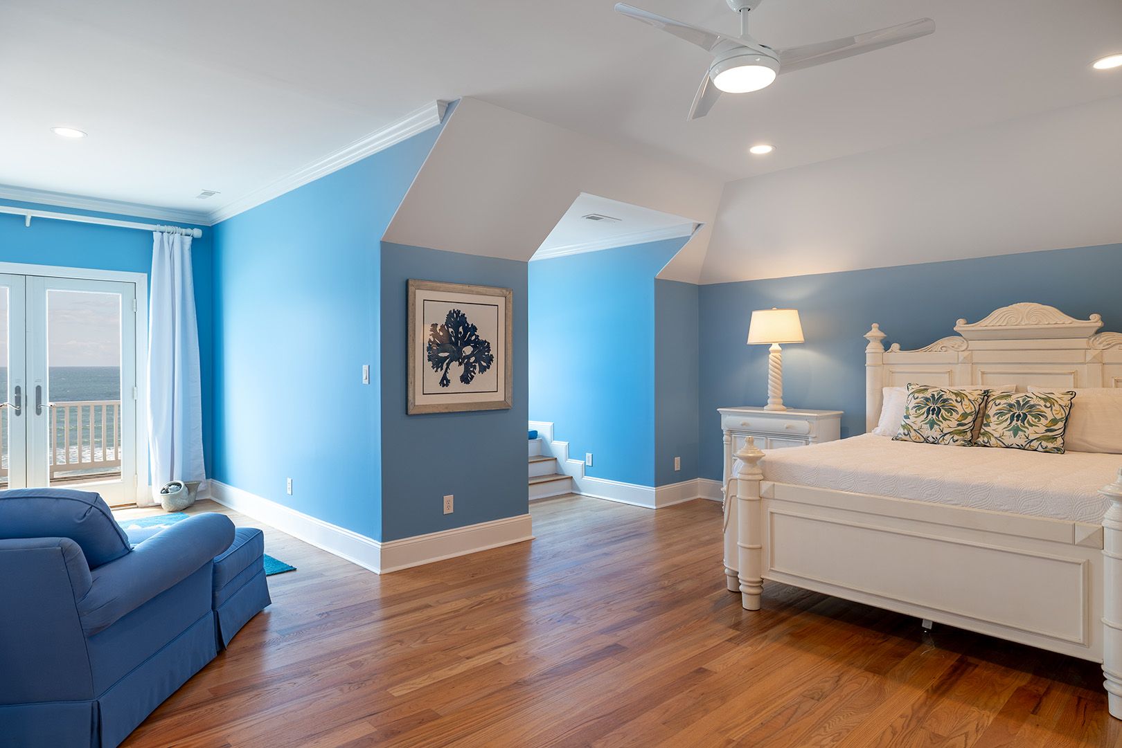 Level Three: Master King Bedroom suite with TV and sitting area, Pet alcove (3 steps leading up to an oceanfront window seat), Private bath including whirlpool tub, Private deck.