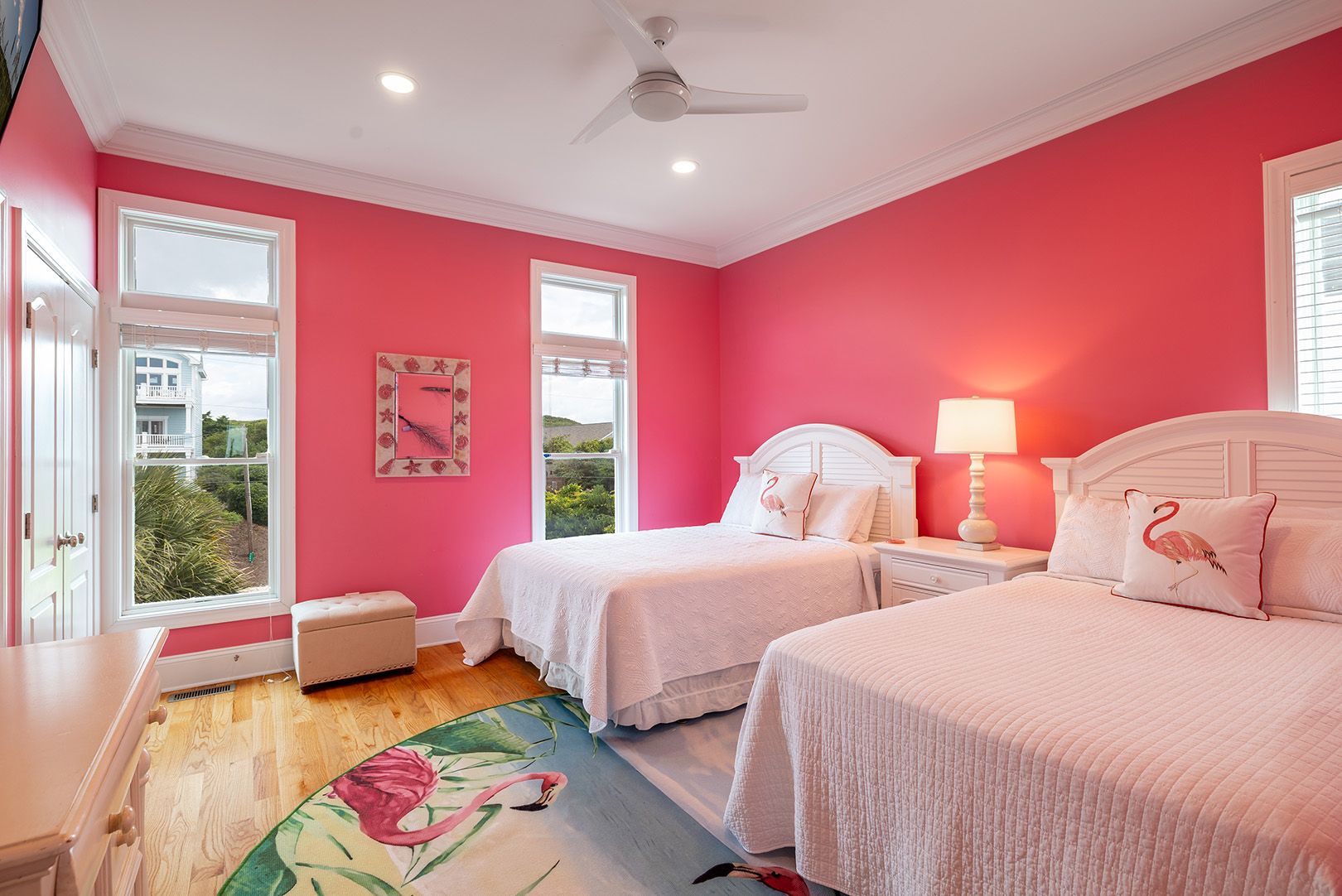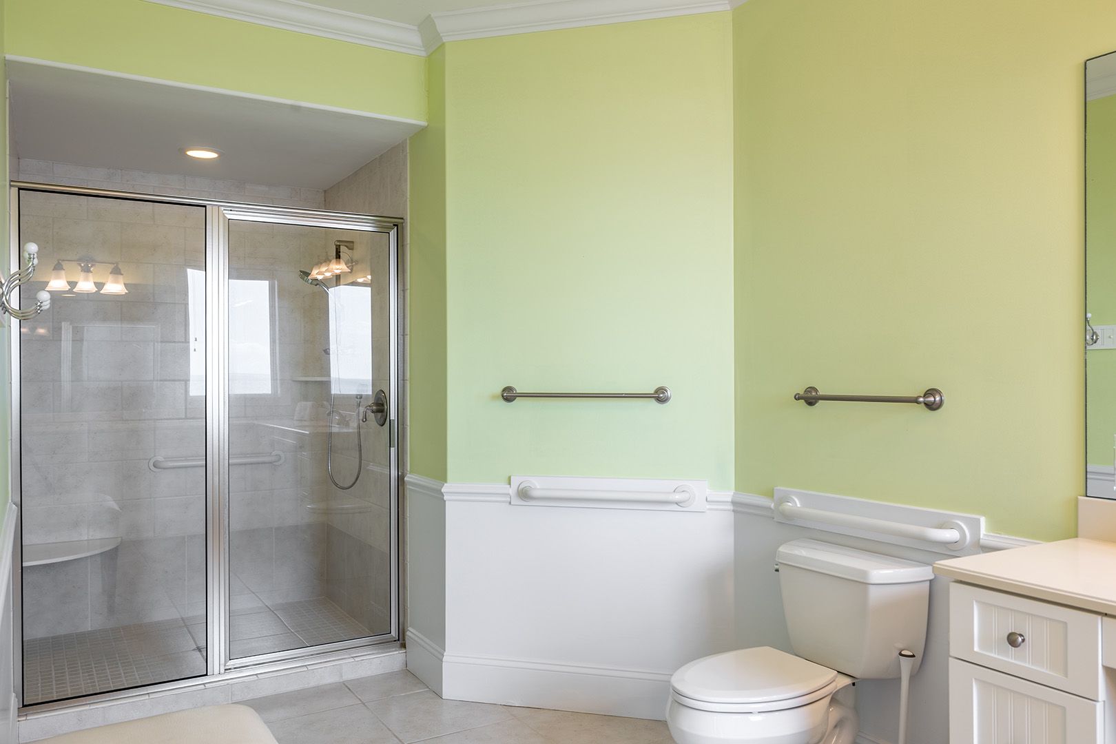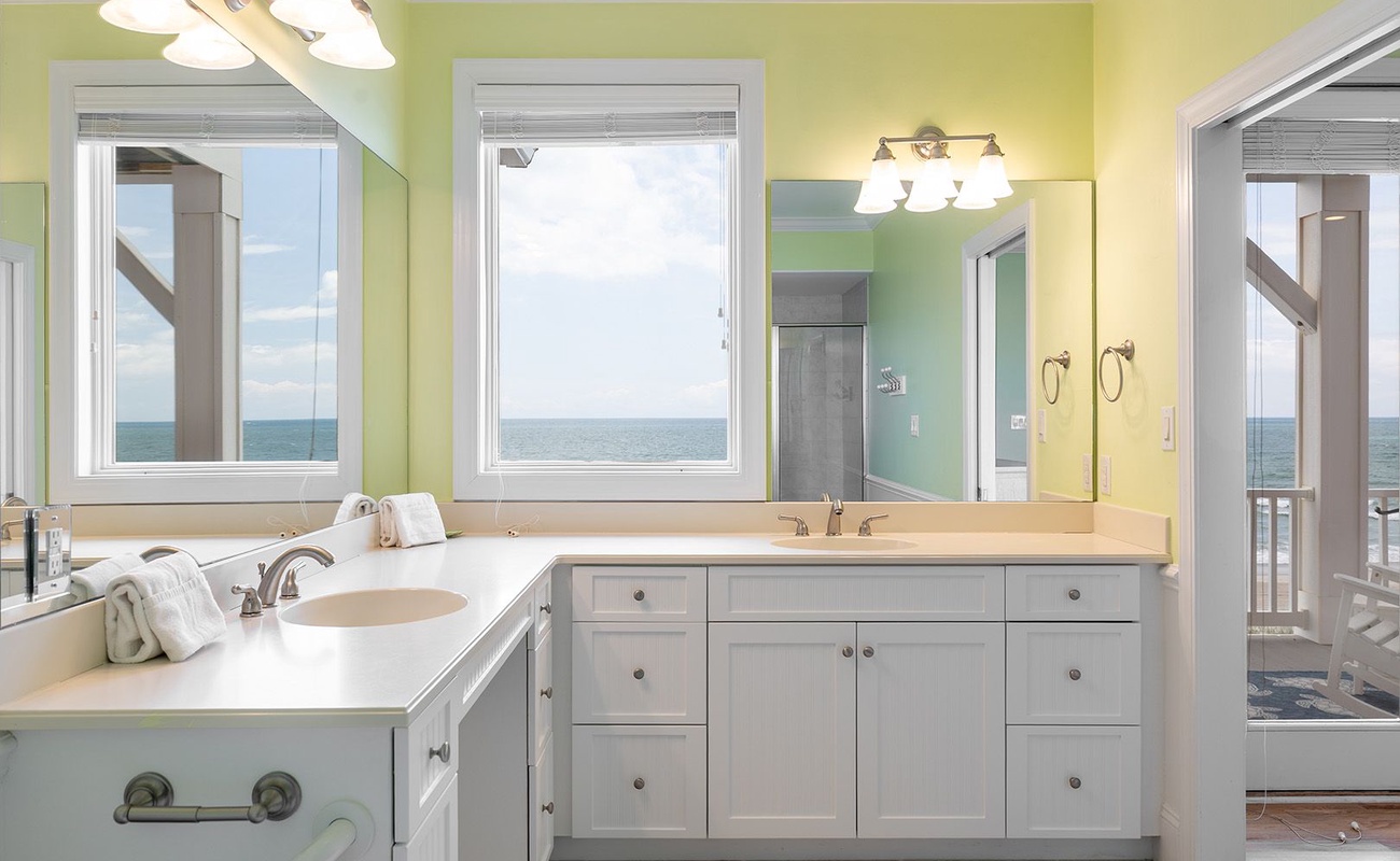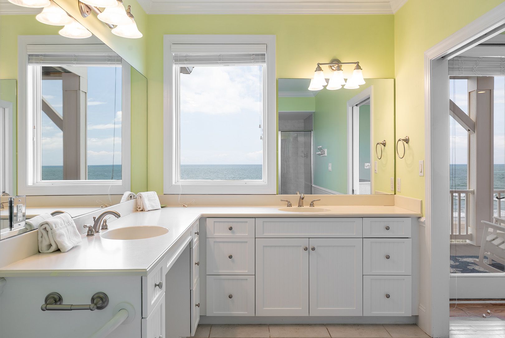 Level Two: Bedroom # 4 Oceanfront Master suite, King bed with private bath including whirlpool tub and TV, Bedroom # 5 Oceanfront Master suite, King bed with private bath (this bathroom has a wider door, sink that is easily accessible, bars in wide shower and around toilet) as well as a TV, Bedroom # 6 Oceanfront Master suite, King bed with private bath including whirlpool tub, and TV Bedroom # 7 has 2 Sets of Double over Double Bunk Beds with private bath and a TV, Laundry room.