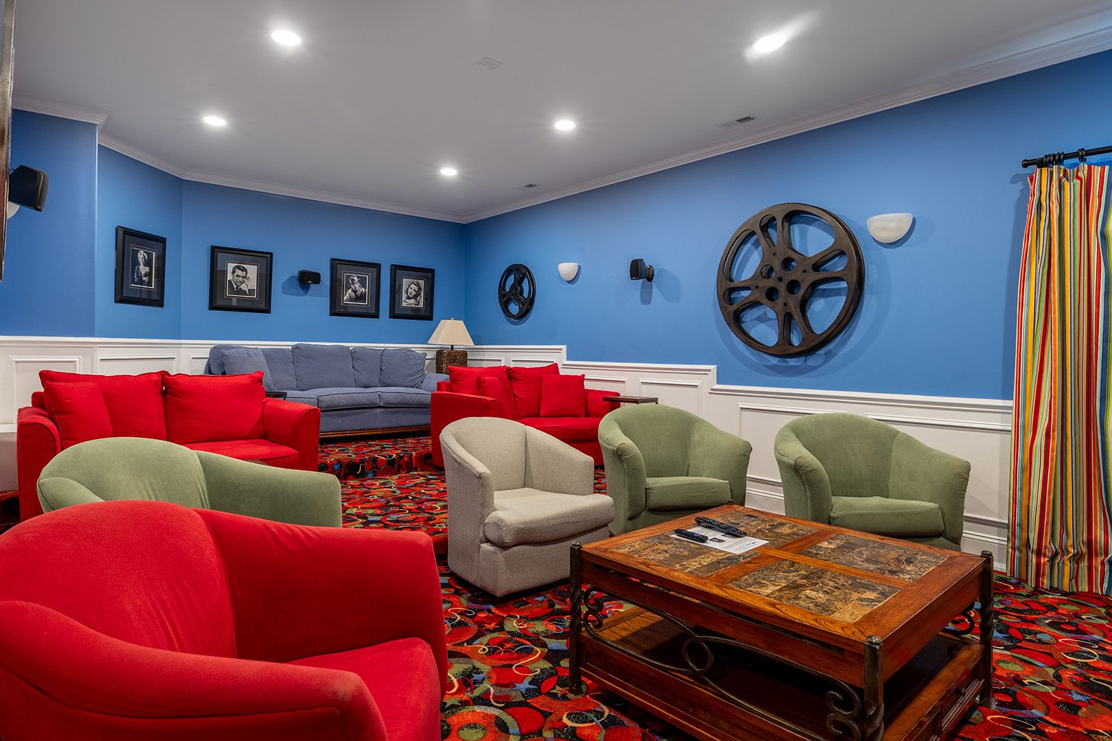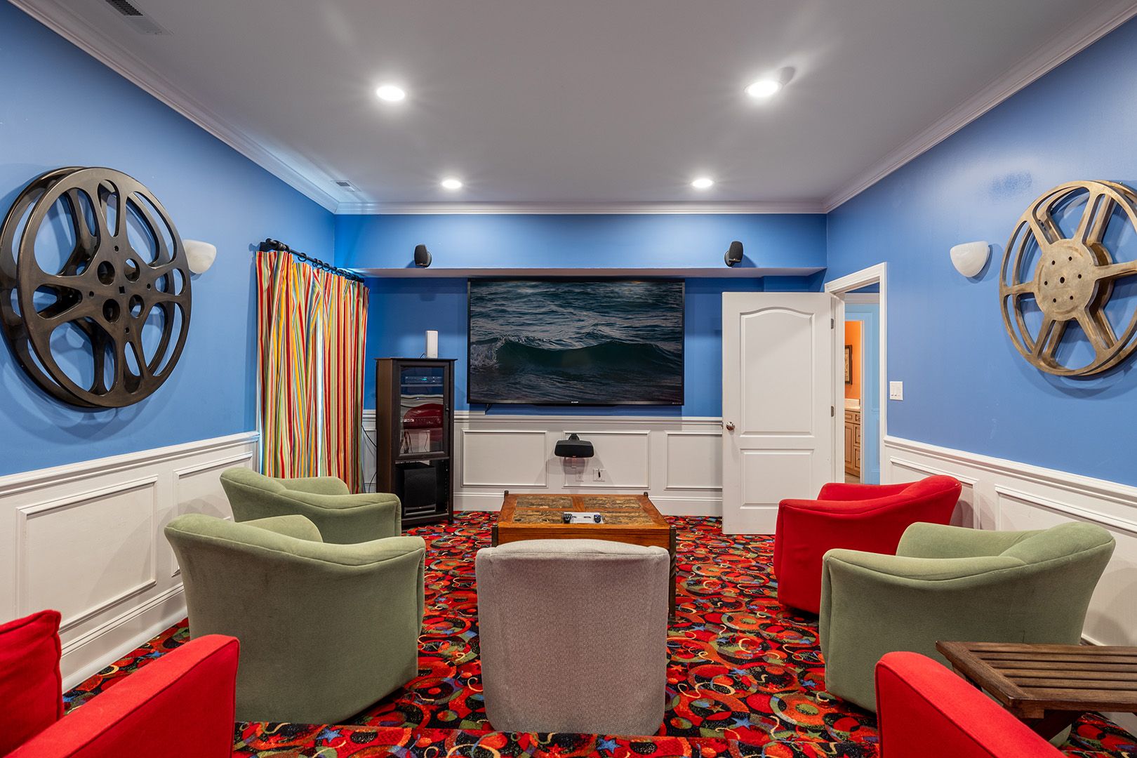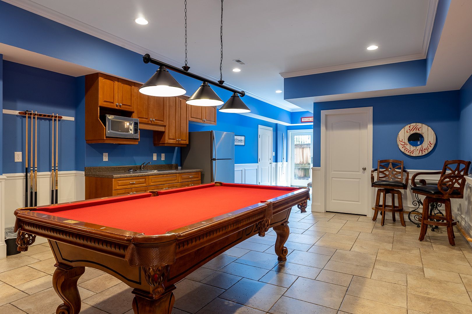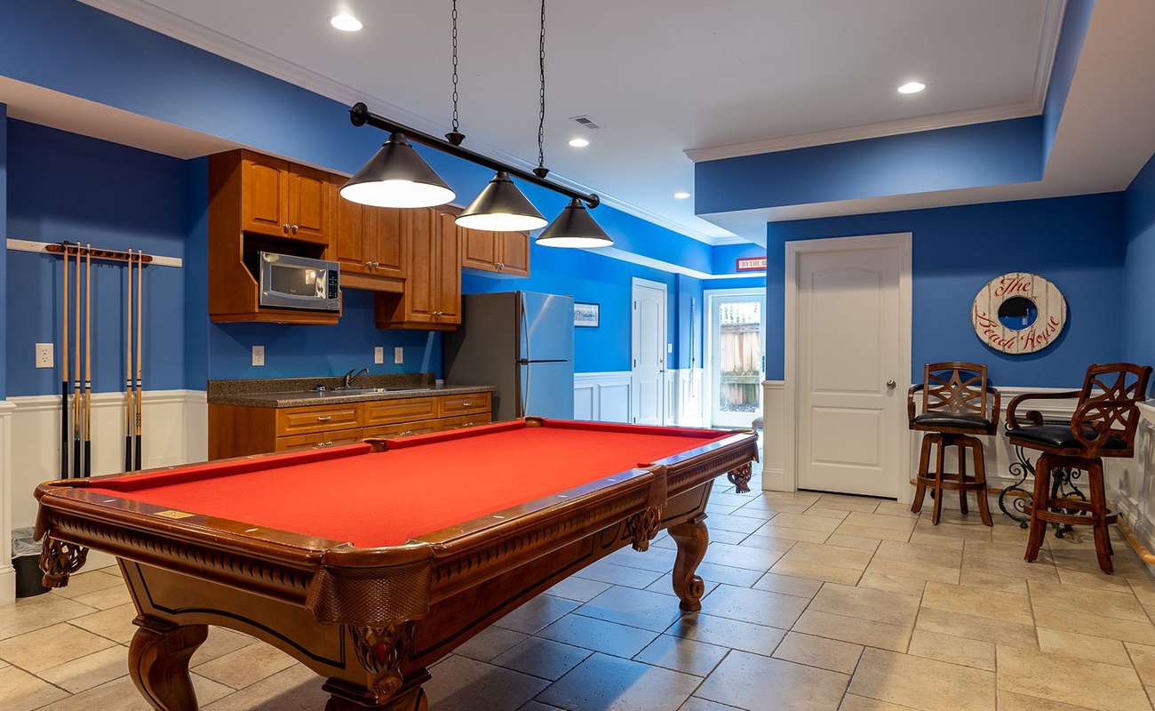 Ground Level: Garage, Game room with pool table and TV, Kitchenette with fridge and microwave, Media room with a 90" Flat Screen HD TV and a Blu-Ray DVD Player, Bedroom # 1 has Queen bed with a private bath and TV, Full Bath in hallway, Elevator access which goes from the ground level to the second level.