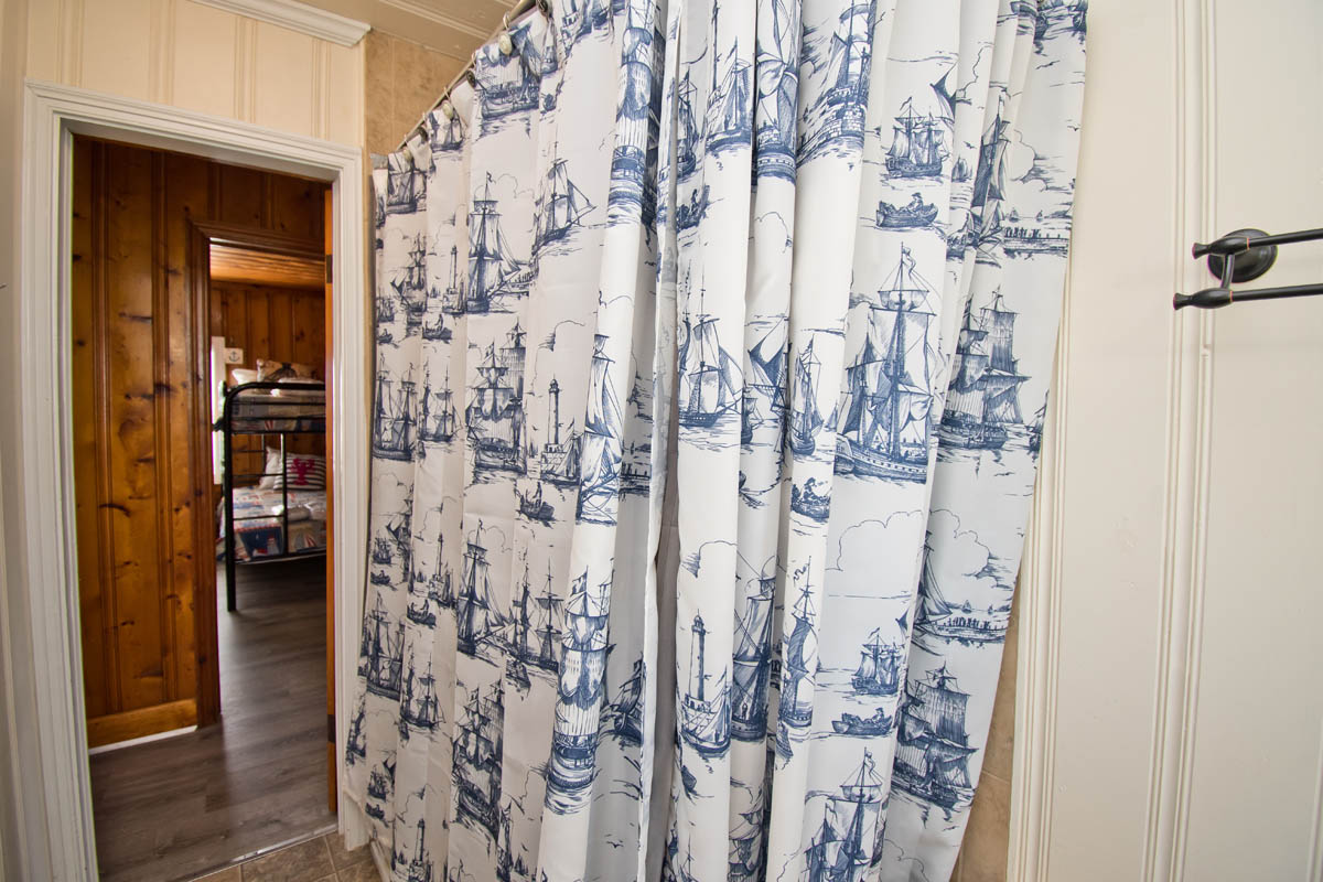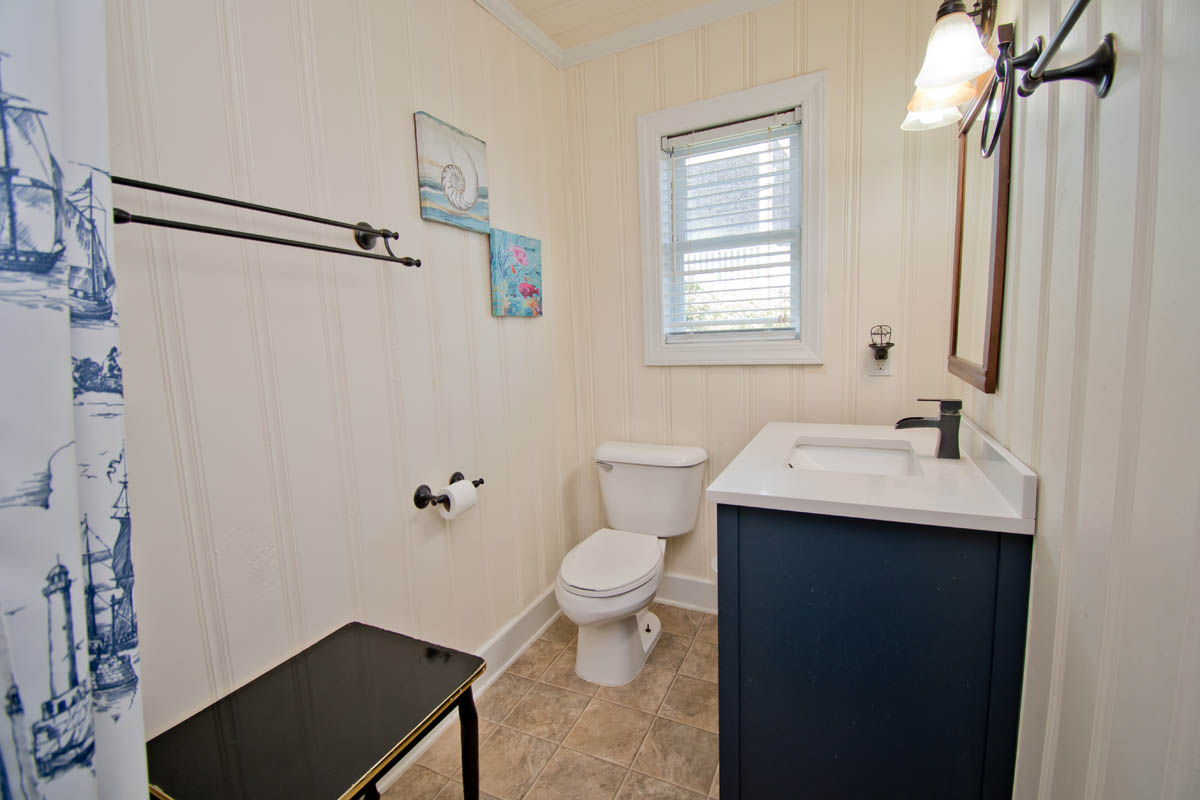 Bedroom #1 has 1 twin bunk and 1 double/twin bunk. Bedroom #2 has a King bed and flat screen TV. Bedroom #3 is the Master bedroom and has a king bed and a flat screen TV. Note: Half bath is located on the exterior of the home in Laundry room. Can only access by exiting the property. Bath/Laundry Room combo (as seen in photo)