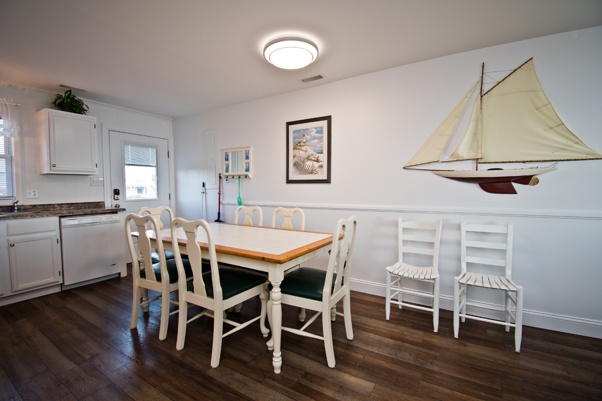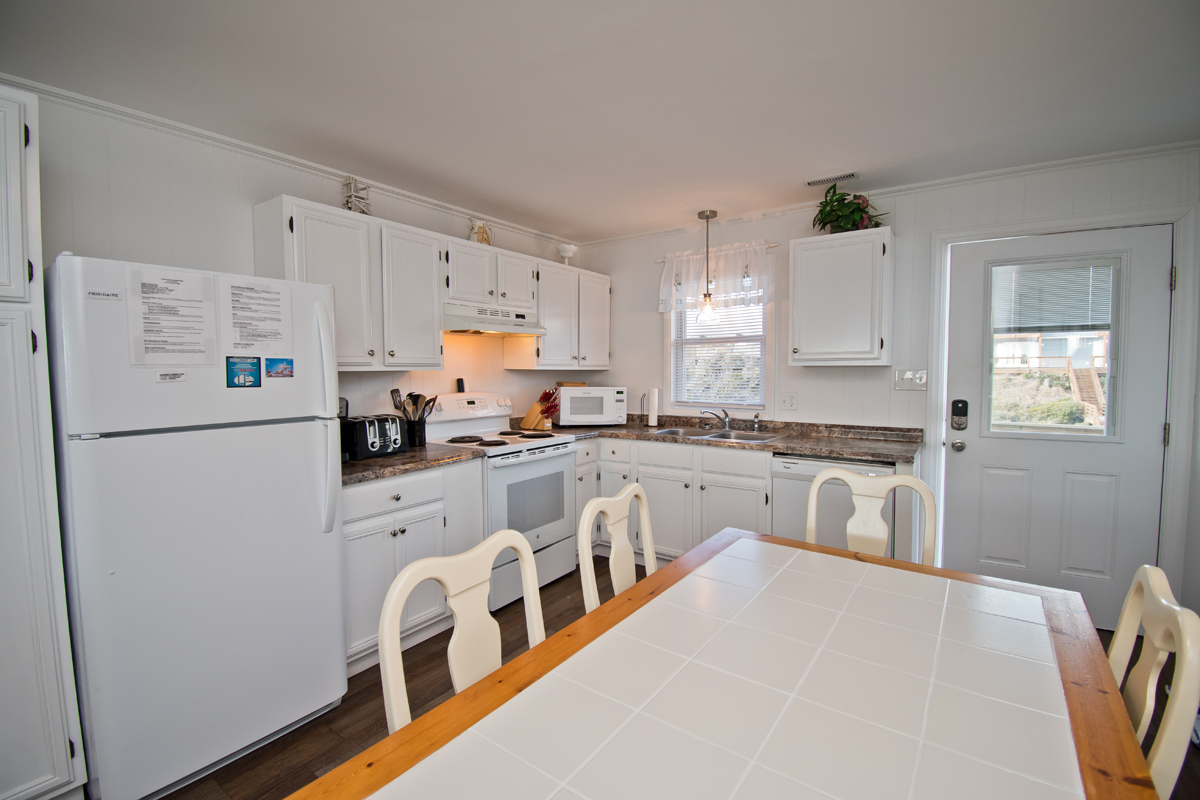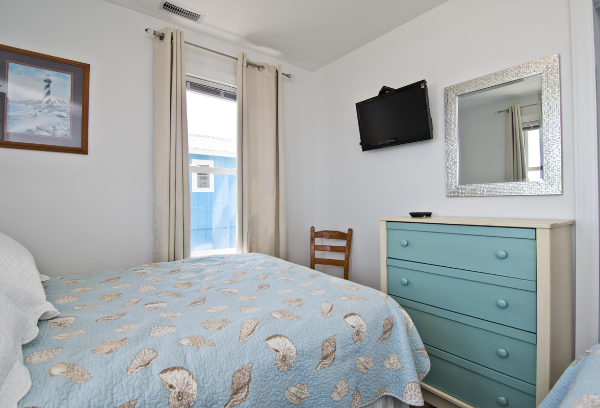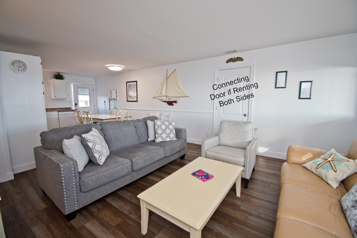 Amenities include: Central Air and Heat, a Shared Exterior Washer/Dryer, a Microwave, Dishwasher, an Outdoor Shower, Open and Covered Decks with 4 Rocking Chairs, Beach Chairs, a Park-Style Charcoal Grill, a Blender, a Crock Pot, a Color Cable TV, and a DVD Player. To make sharing your vacation easier, a connecting door between duplexes, Captains Quarters East, allows for convenient access and a shared living space when renting both halves.