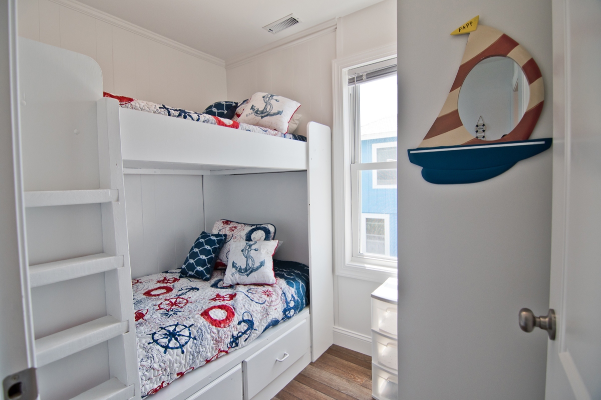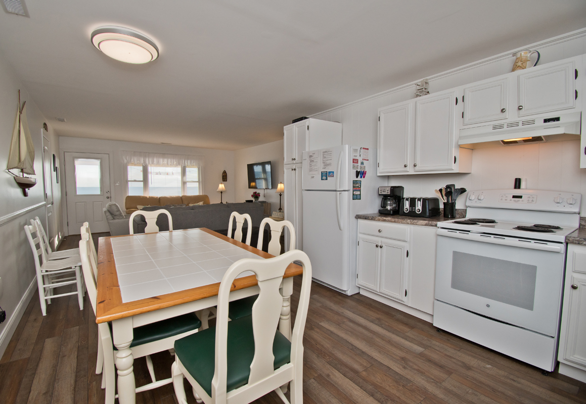 Level One: Living Area has Ocean Access. Dining Area. Kitchen area includes a microwave and dishwasher. Streetside Bedroom #1 has a King Bed with a Flat Screen TV and a Half-Bath. Oceanfront Bedroom #2 has 2 Double Beds with a Flat Screen TV and a Child's Alcove with a Twin Bunk Set.